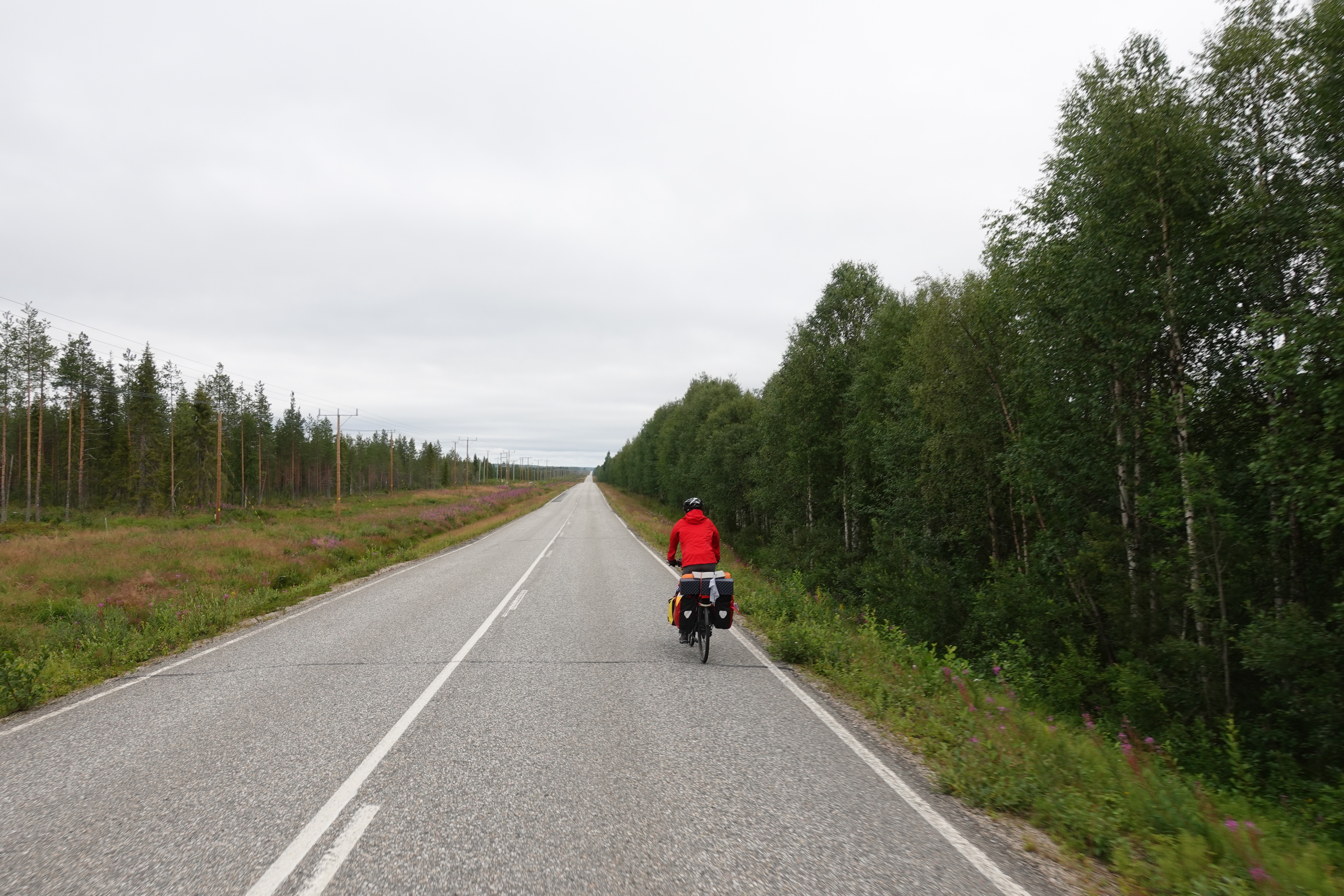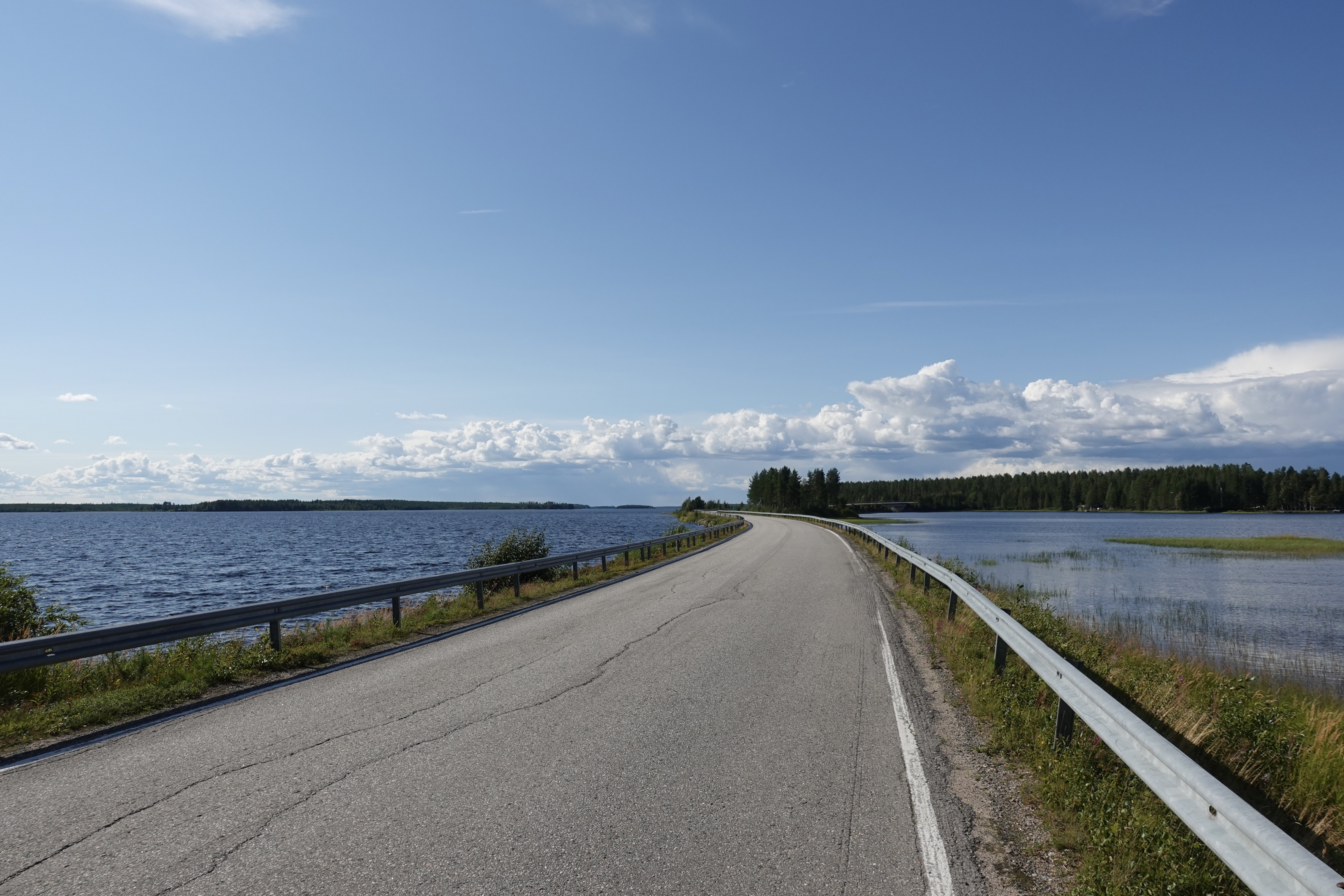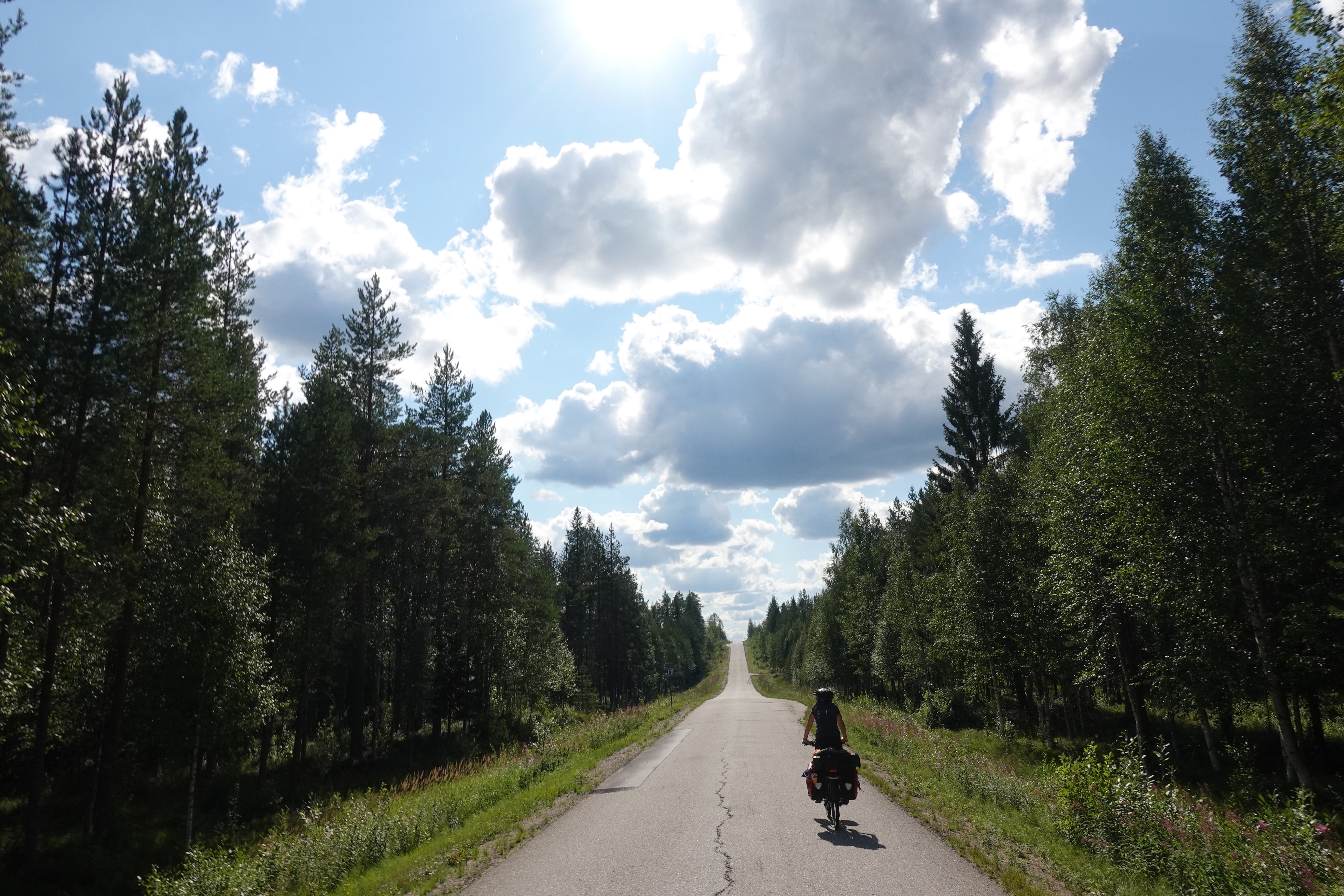 So oder so ähnlich sehen viele Straßen in Finnland aus. Man kann unterscheiden zwischen geradeaus, S-Kurve rechts oder links, aufwärts oder abwärts. Immer gibt es Wald oder Wasser oder beides zu sehen. Wir fahren auf unseren Rädern über diese Straßen, das geht mal ganz unbeschwert und beschwingt, so dass wir nur so dahin brausen, Kilometer um Kilometer. Dann wieder gibt es Phasen, in denen jeder einzelne Meter hart erkämpft wird. Entscheidend ist vor allem das Wetter: mit Sonne stört der Gegenwind nicht soooo, mit Wolken und Regen ist er eher unerträglich. Aber auch der Belag ist wichtig: Asphalt ist sehr schön, wenn er nicht durch unzählige Frostbeulen zu einer Buckelpiste mutiert. Schotterstraßen gibt es auch. Die sind anstrengend, aber zum Glück auf unserer Route nicht so zahlreich. Die Straßen wellen sich durch das Land, so haben wir immer kleine Anstiege, die wir dann auf der anderen Seite entspannt runterrollen könnten (wenn uns nicht gerade der Wind daran hindert). Schön ist es auch, wenn der Weg sich schlängelt, das macht neugierig und spornt an.