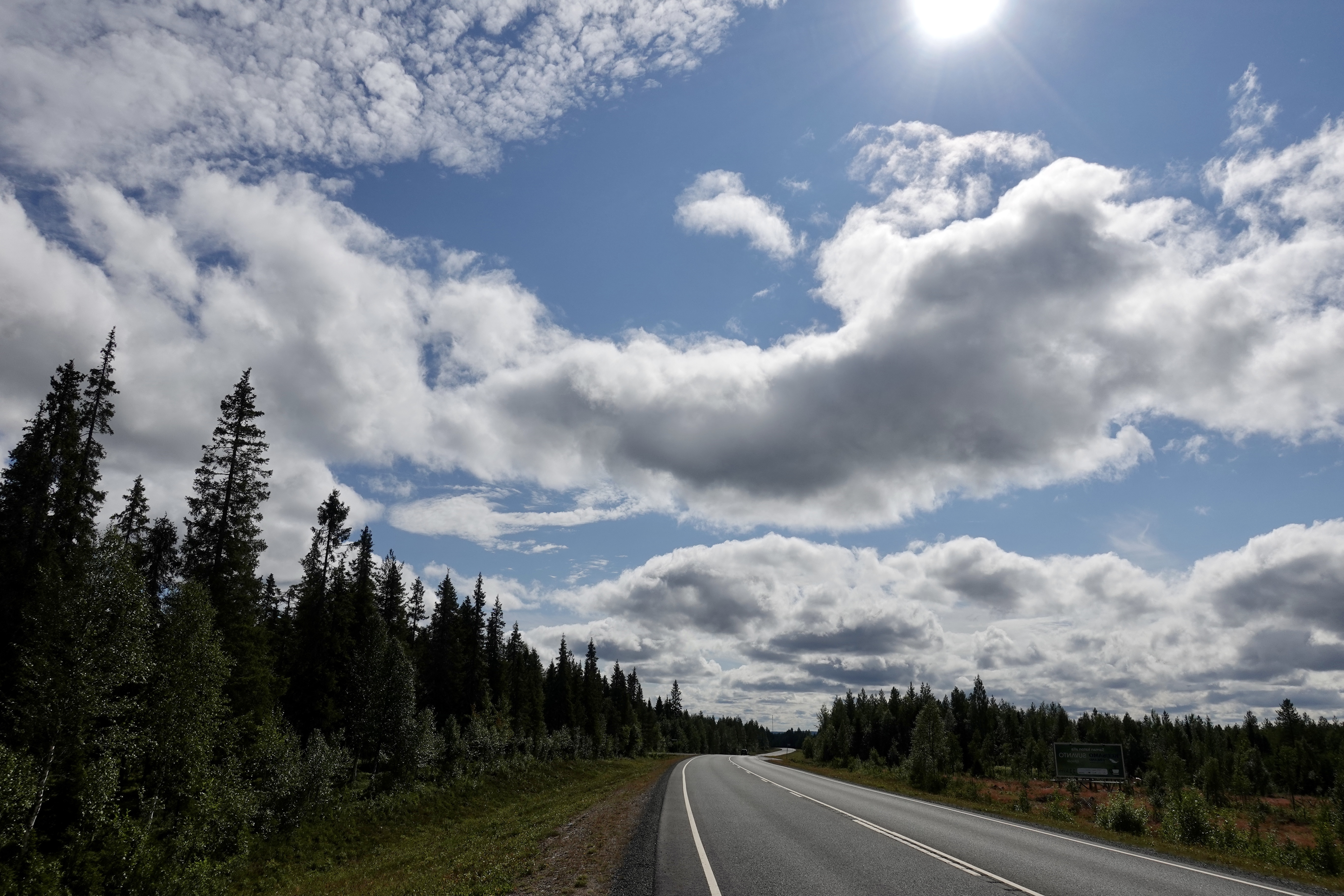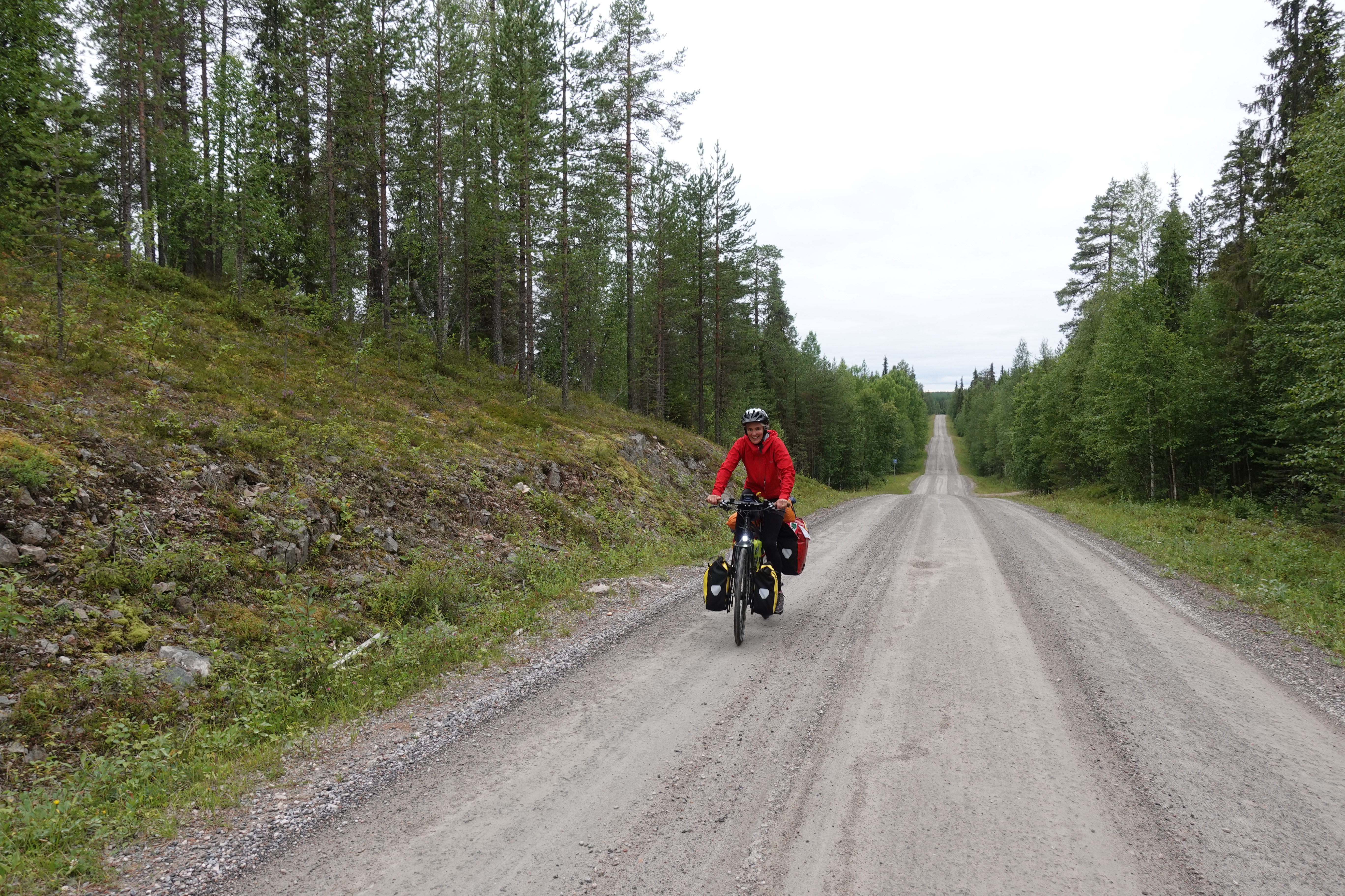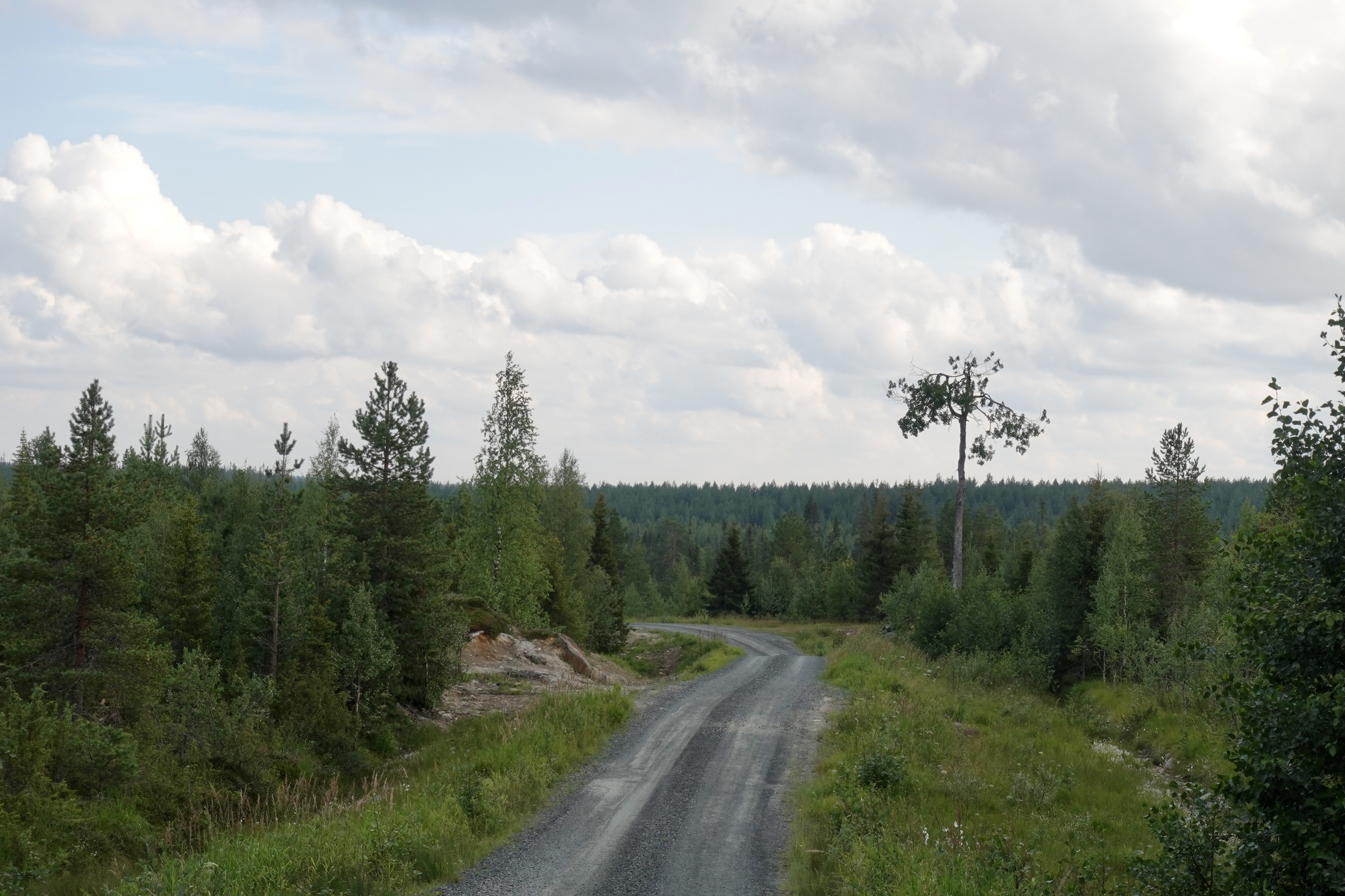 So oder so ähnlich sehen viele Straßen in Finnland aus. Man kann unterscheiden zwischen geradeaus, S-Kurve rechts oder links, aufwärts oder abwärts. Immer gibt es Wald oder Wasser oder beides zu sehen. Wir fahren auf unseren Rädern über diese Straßen, das geht mal ganz unbeschwert und beschwingt, so dass wir nur so dahin brausen, Kilometer um Kilometer. Dann wieder gibt es Phasen, in denen jeder einzelne Meter hart erkämpft wird. Entscheidend ist vor allem das Wetter: mit Sonne stört der Gegenwind nicht soooo, mit Wolken und Regen ist er eher unerträglich. Aber auch der Belag ist wichtig: Asphalt ist sehr schön, wenn er nicht durch unzählige Frostbeulen zu einer Buckelpiste mutiert. Schotterstraßen gibt es auch. Die sind anstrengend, aber zum Glück auf unserer Route nicht so zahlreich. Die Straßen wellen sich durch das Land, so haben wir immer kleine Anstiege, die wir dann auf der anderen Seite entspannt runterrollen könnten (wenn uns nicht gerade der Wind daran hindert). Schön ist es auch, wenn der Weg sich schlängelt, das macht neugierig und spornt an.