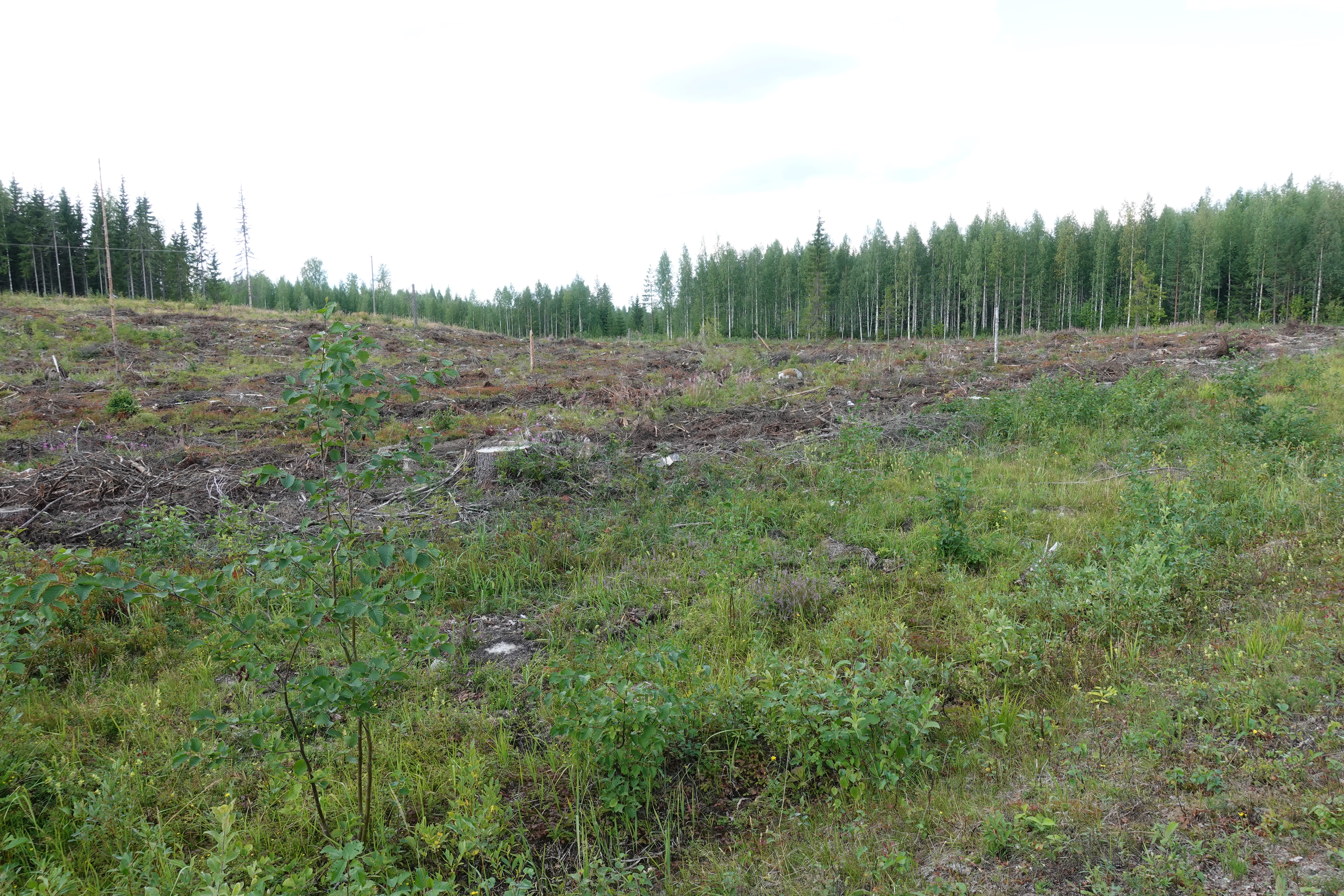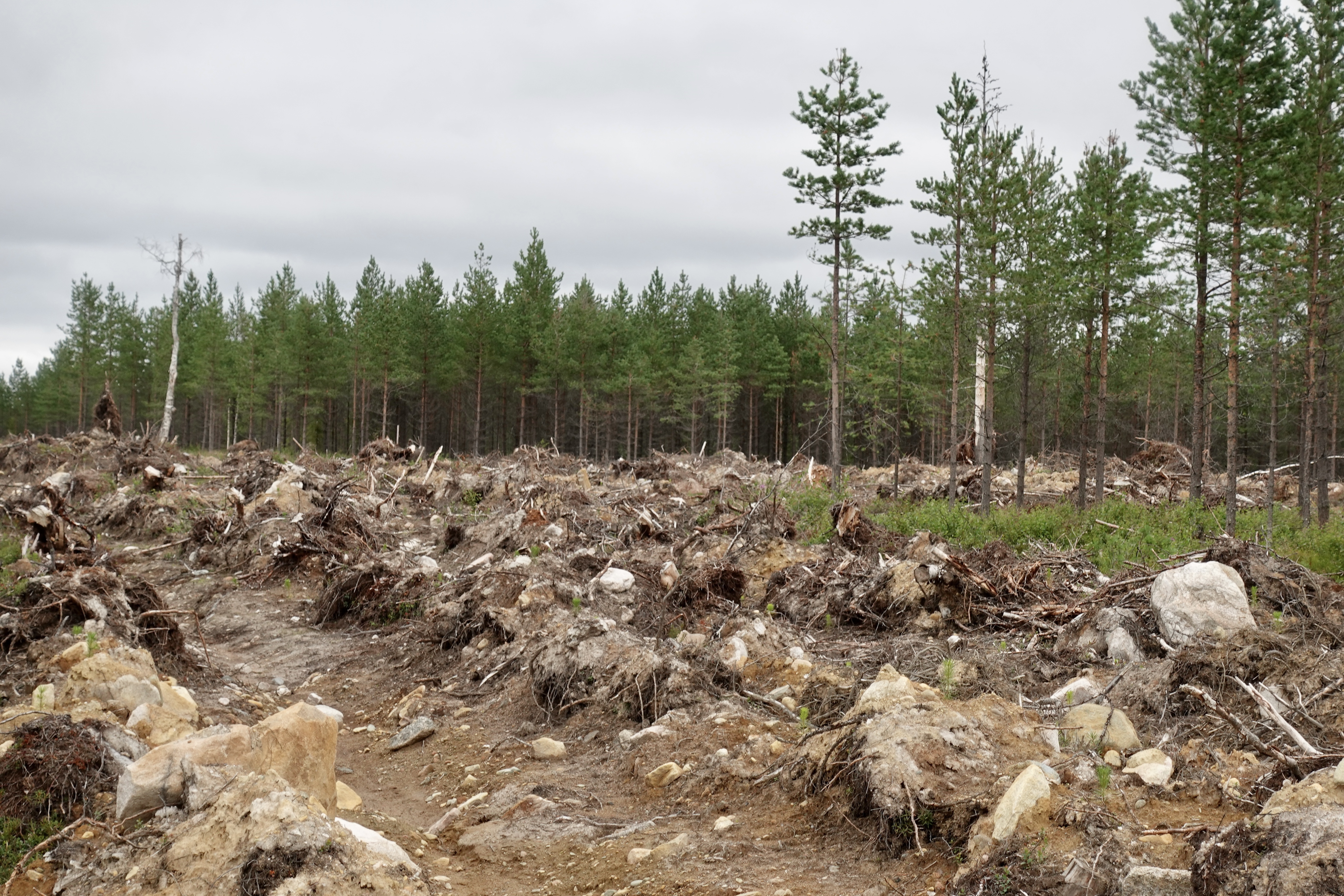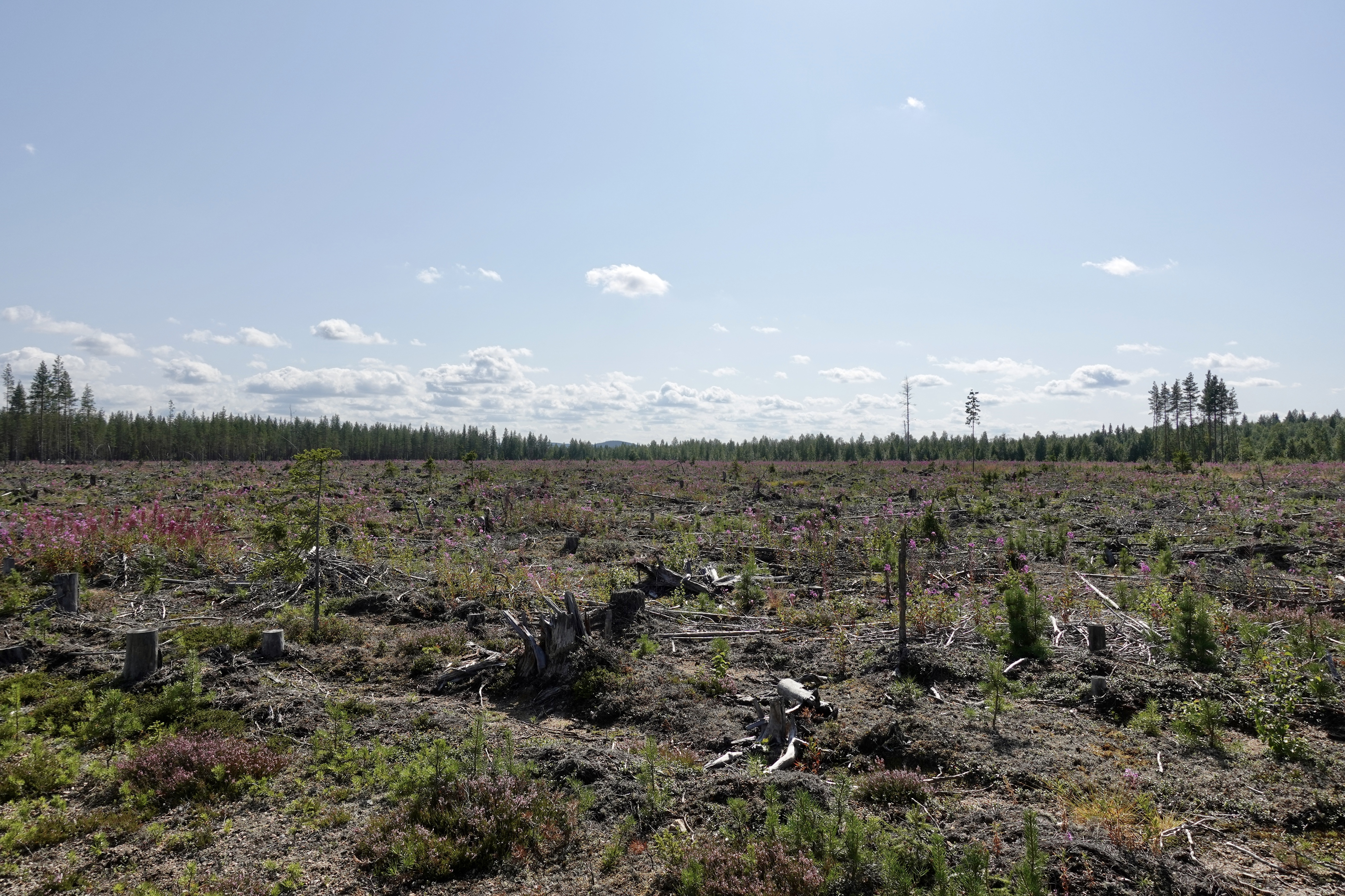 Und dann gibt es den Ex-Wald: das sind die gerodeten Gebiete in denen gar kein Wald mehr steht. Das sind wahre Schlachtfelder der Forstindustrie, sie sind gruselig anzusehen und es ist kein schönes Gefühl da hindurchzufahren. Die Maschinen, die hier zum Einsatz kommen sind unglaubliche Geräte, die einen Baum wie einen Grashalm umsensen, sofort entasten und in handliche Stücke zersägen. Der Boden ist umgewälzt und nur noch eine Wüstenei. Das sind Baumfriedhöfe, es stehen meist nur noch ein paar vergessene Geäste traurig rum. Wir haben keine Ahnung wie lange es dauert, bis dort wieder etwas wachsen kann und wie das bewerkstelligt wird.