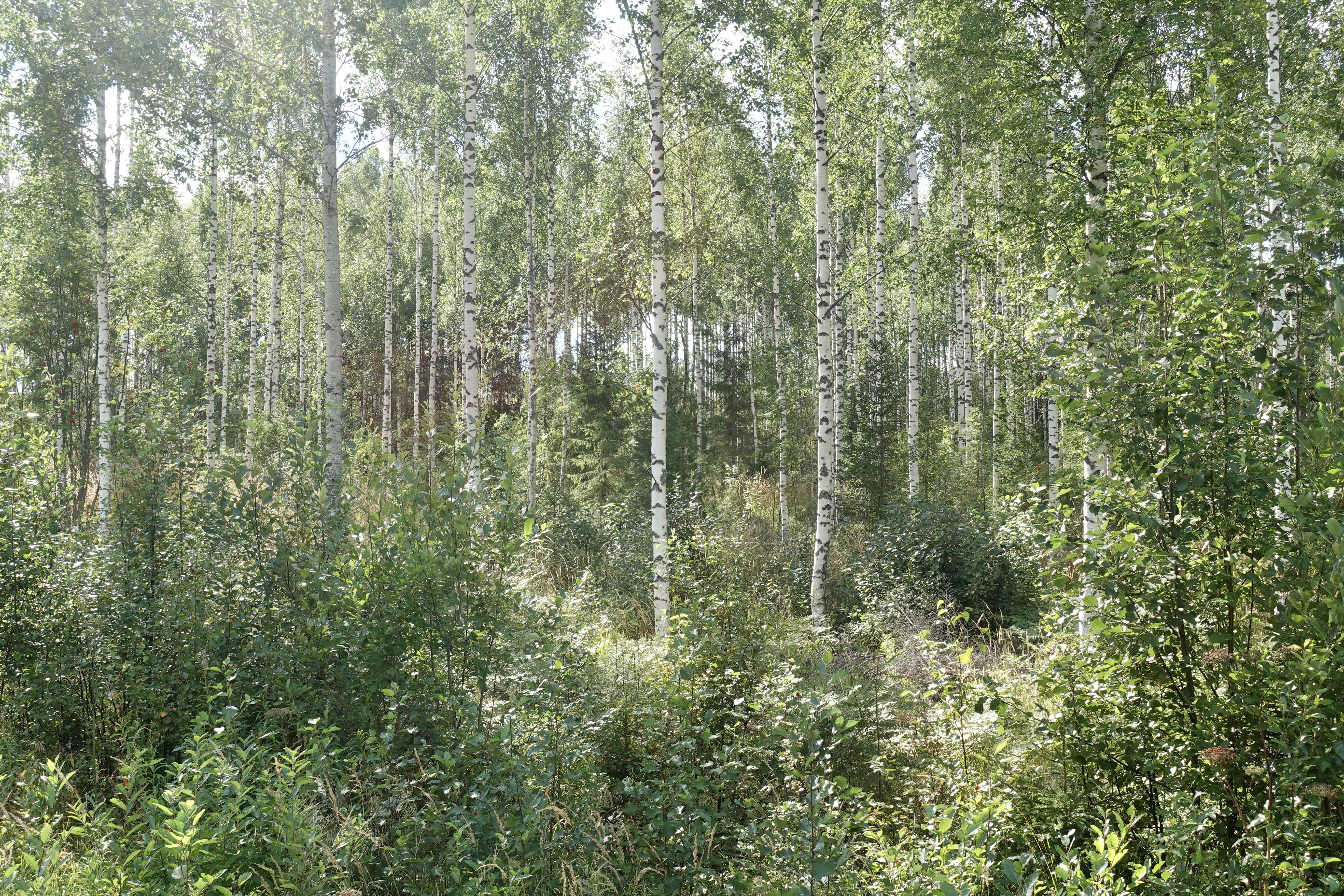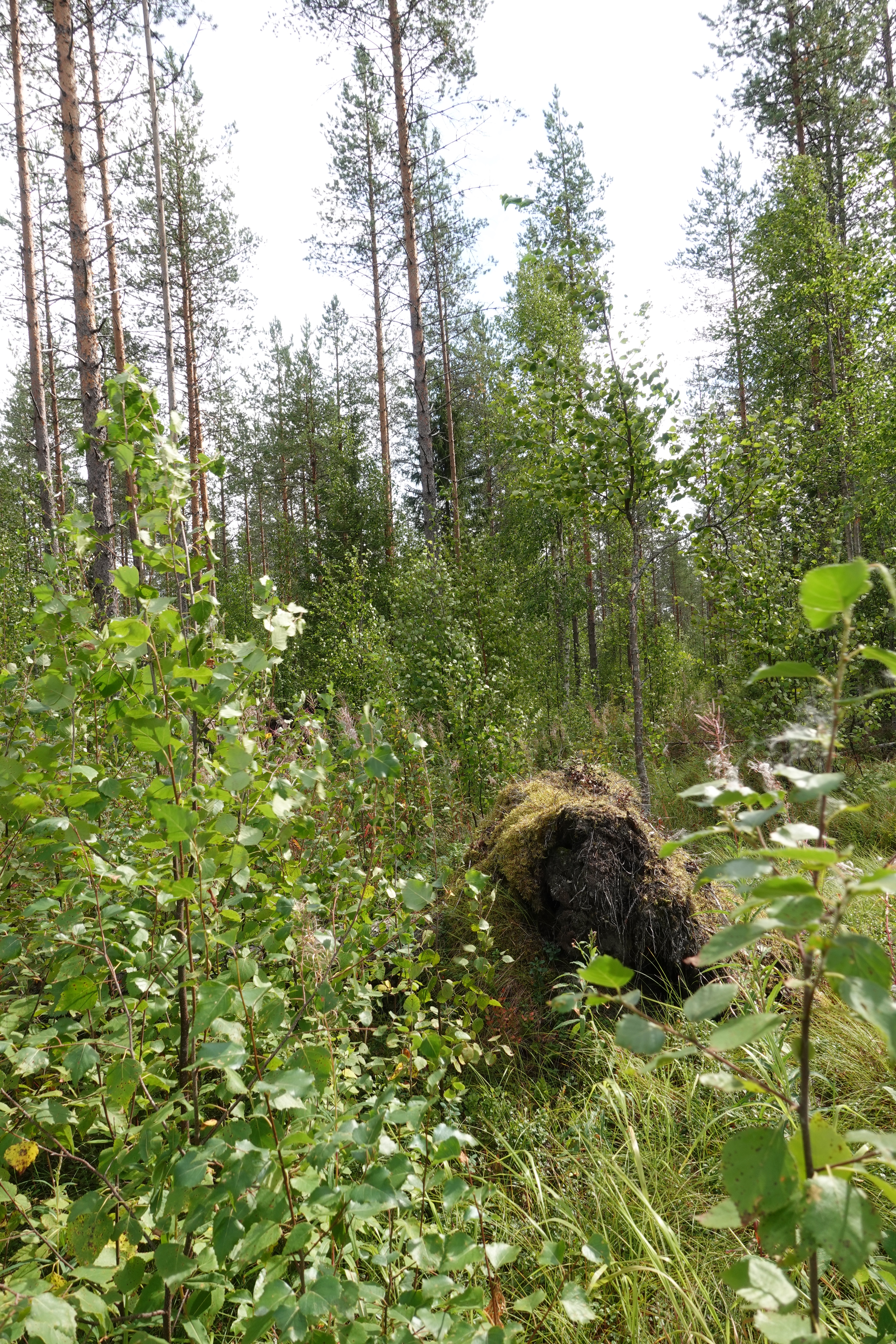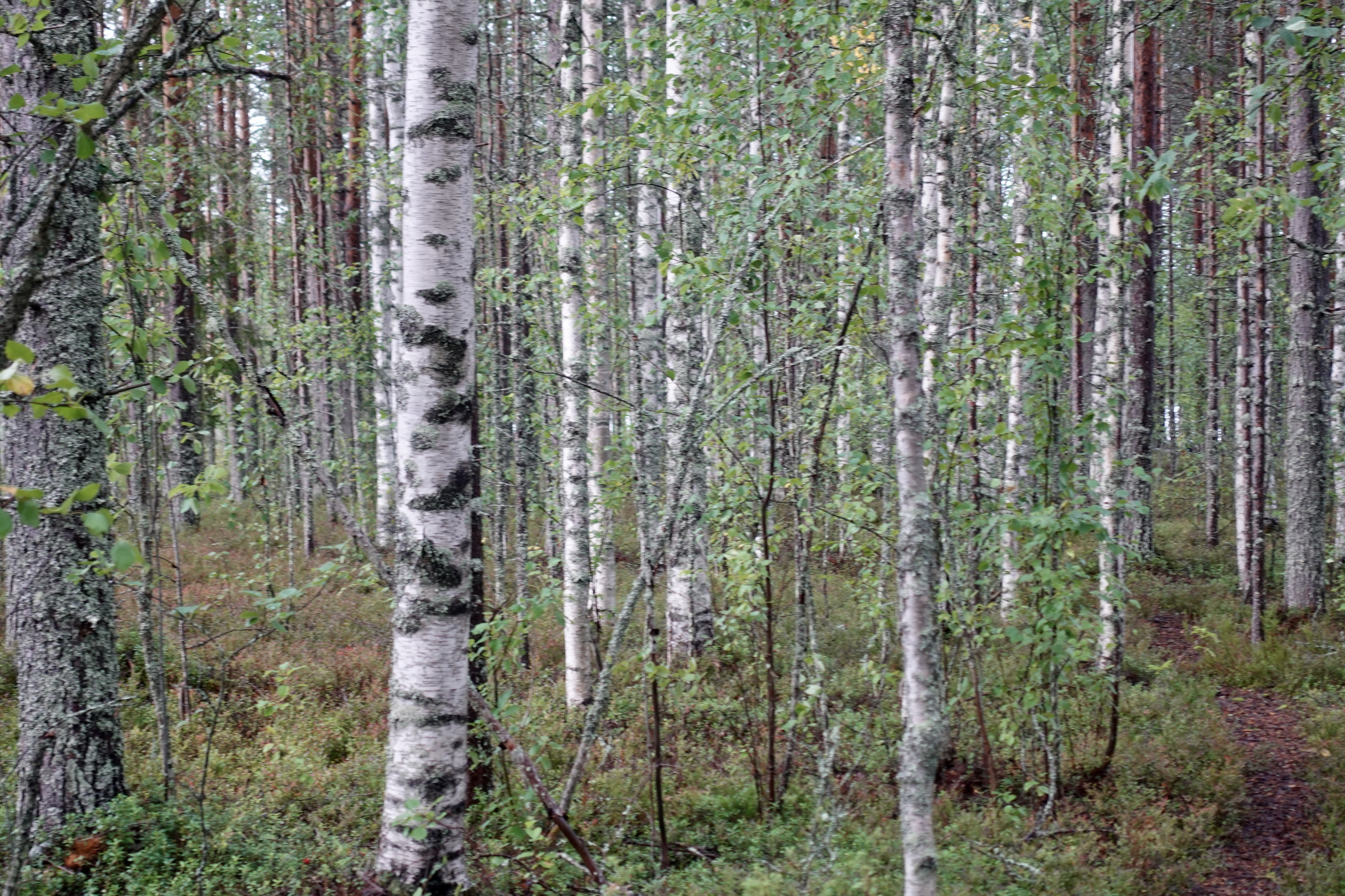 Mischwald, möglichst sich selbst überlassen: dass ist für uns das Highlight. Birken, die hier sehr groß und massig werden, gemixt mit Kiefern, Ebereschen und Fichten. Unten drunter wachsen Blaubeeren und Preiselbeeren en masse. Moose, Flechten, eine dicke, weiche Decke, in die man sich direkt hineinschmeißen möchte. Dann das Spiel des Sonnenlichts darin und schon sind wir hin und weg.