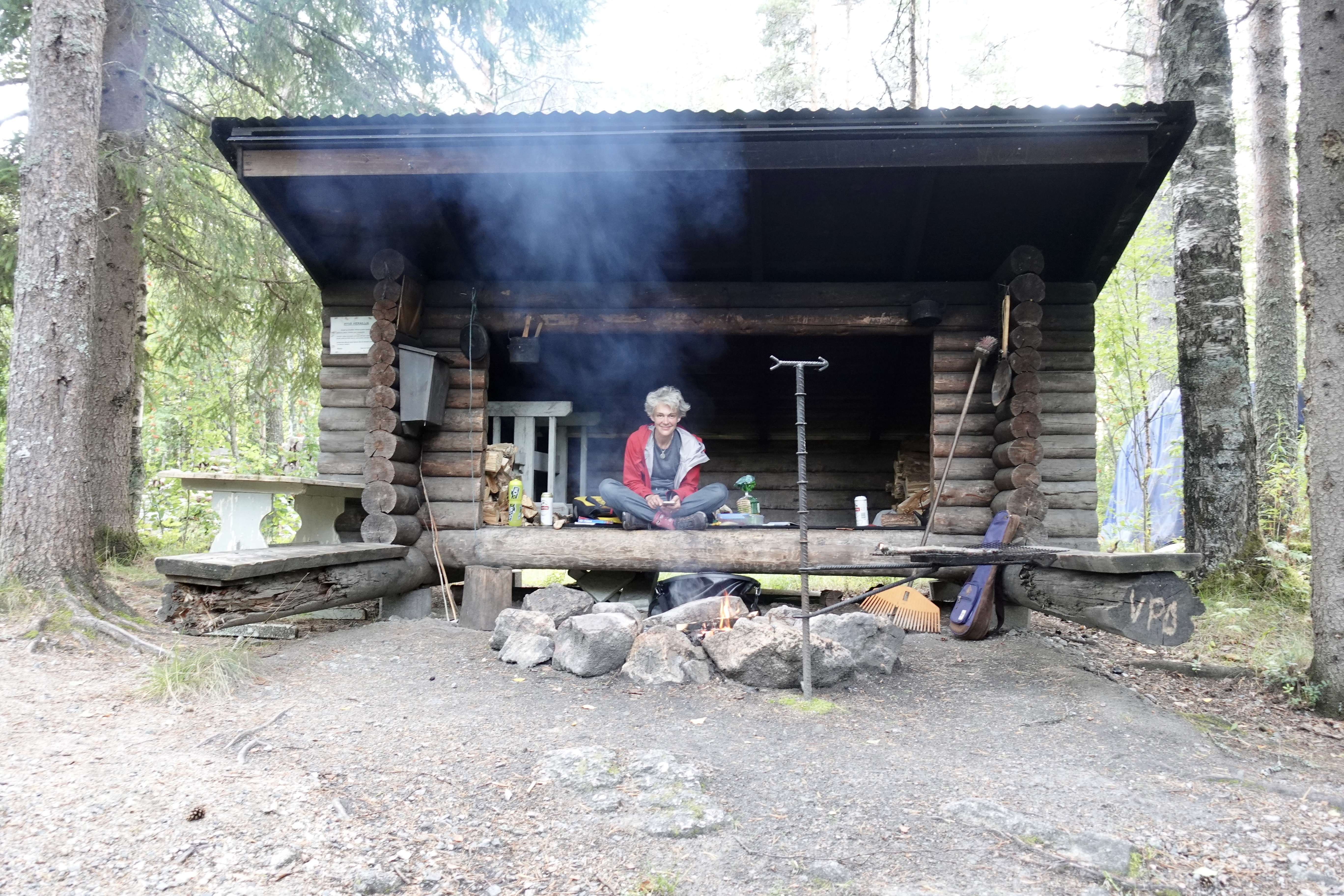 Wir sind große Fans von Finnland (logisch) und ganz große Fans von „Metsähallitus“. Google übersetzt das mit Waldherrschaft, passender ist wahrscheinlich Forstbehörde. Die sorgt jedenfalls für die vielen Hütten in diesem wirklich gar nicht kleinen Land, versorgt sie mit Feuerholz und hält die Unterstände und die Hütten selbst instand. Inzwischen sind wir stets mit einer Packung Makkara (Grillwurst) und Senf ausgerüstet, damit wir bei der nächsten Hütte anhalten, Feuer machen und grillen können. Holz ist da, sauber ist auch alles, Mülltrennung wird gepflegt und ein Plumpsklo ist auch vorhanden.