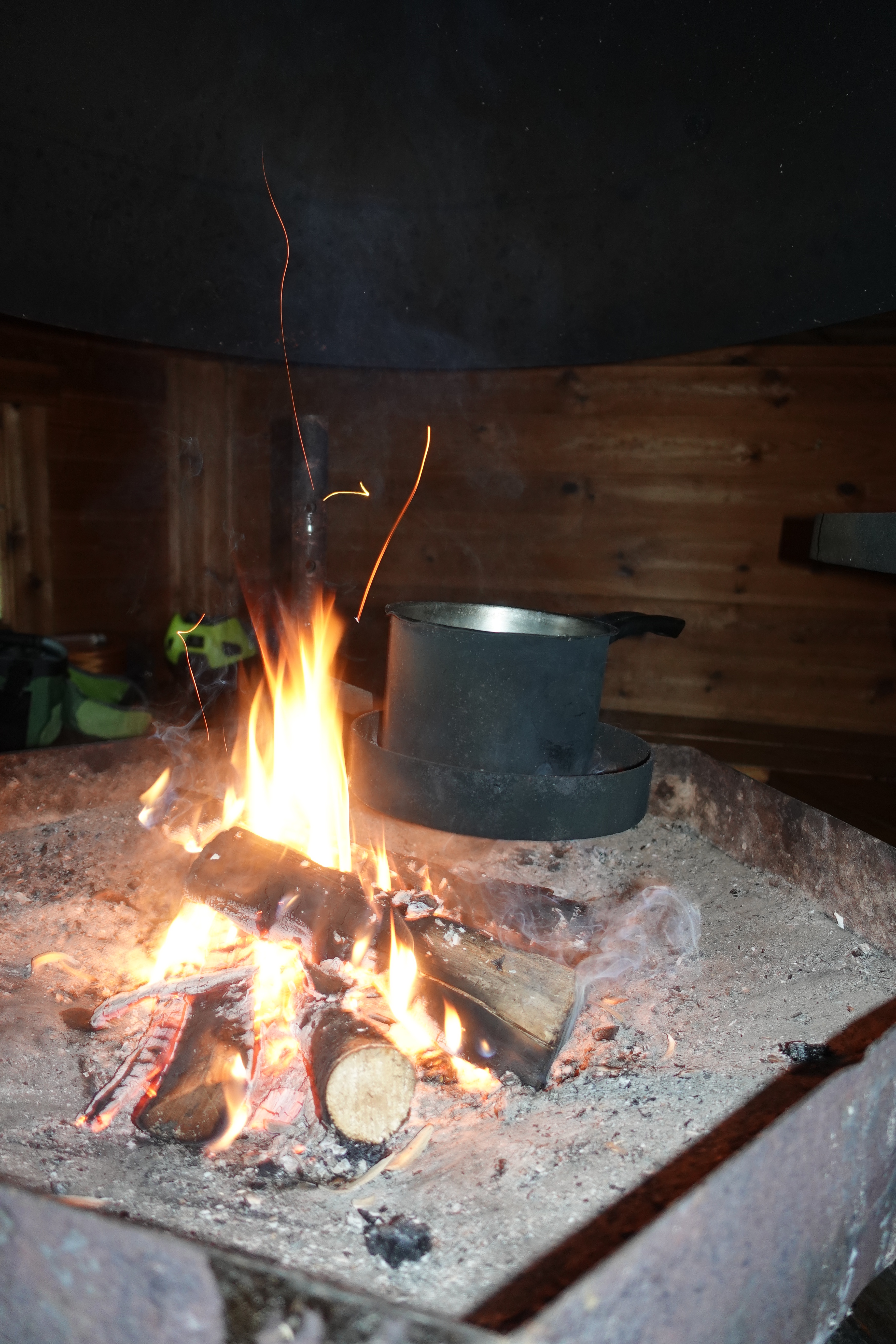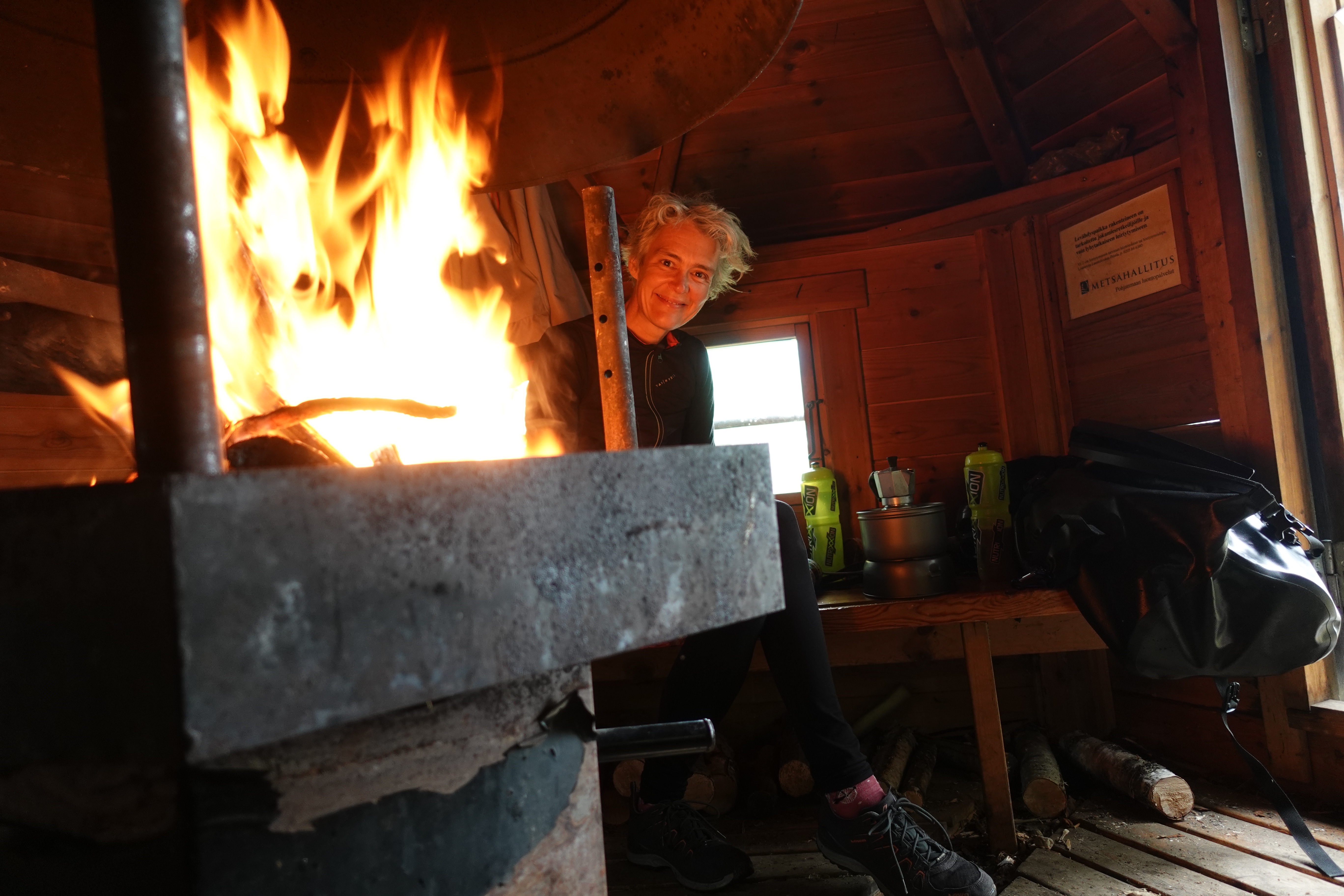 Feuer: solange keine Waldbrandgefahr besteht, darf man überall in Finnland Feuer machen (ausgenommen privater Grund und Boden). Es gibt zahllose Grillhütten und Feuerstellen über das ganze Land verteilt, davon hatten wir Euch schon erzählt. Es ist Usus, dass man soviel Holz, wie man verbraucht hat, frisch hackt und den Platz aufgefüllt hinterlässt. Dazu nutzt man die bereitliegende (scharfe) Axt, das Holz holt man von dem großen Haufen, der da rumliegt. Unser Eindruck ist, dass der gute finnische Familienmensch stets mit einer Tube Senf, Würstchen, Messer und Teleskopgrillspieß unterwegs ist, um im Bedarfsfall ein Feuer zu entfachen und Würstchen grillen zu können. Und um sich am Feuer zu wärmen oder daran zu erfreuen. Die Feuerstellen werden auch ganz pragmatisch von Allen genutzt und man sitzt schnell mit anderen Menschen zusammen.