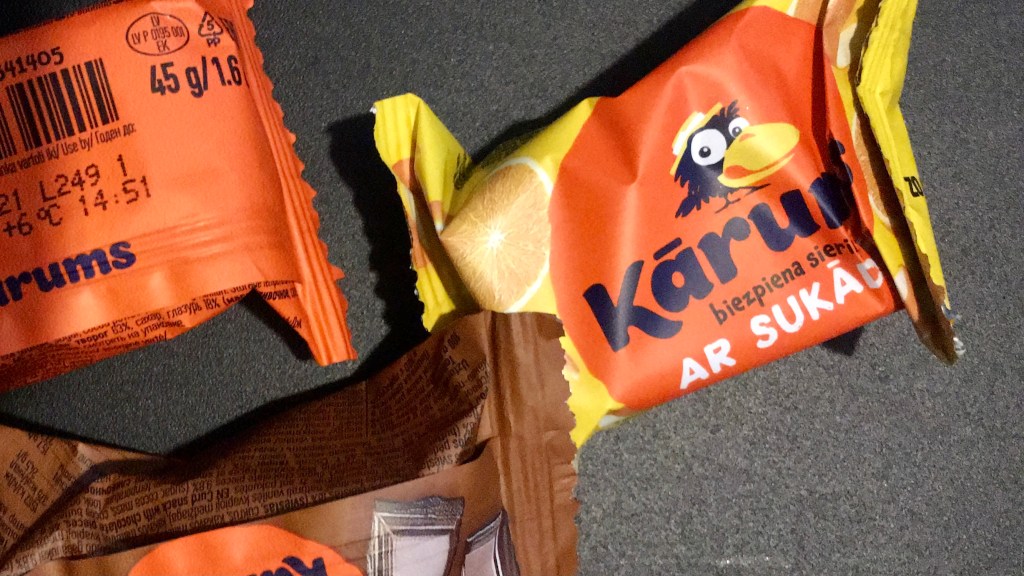 Die Letten sind sehr wild auf alles was man aus und mit Quark machen kann. Unsere Tochter hat uns „Karums“ empfohlen. Das gibt es im Kühlregal und ist ein kleiner Block Quark mit Schokolade überzogen. Kathrin findet das super!