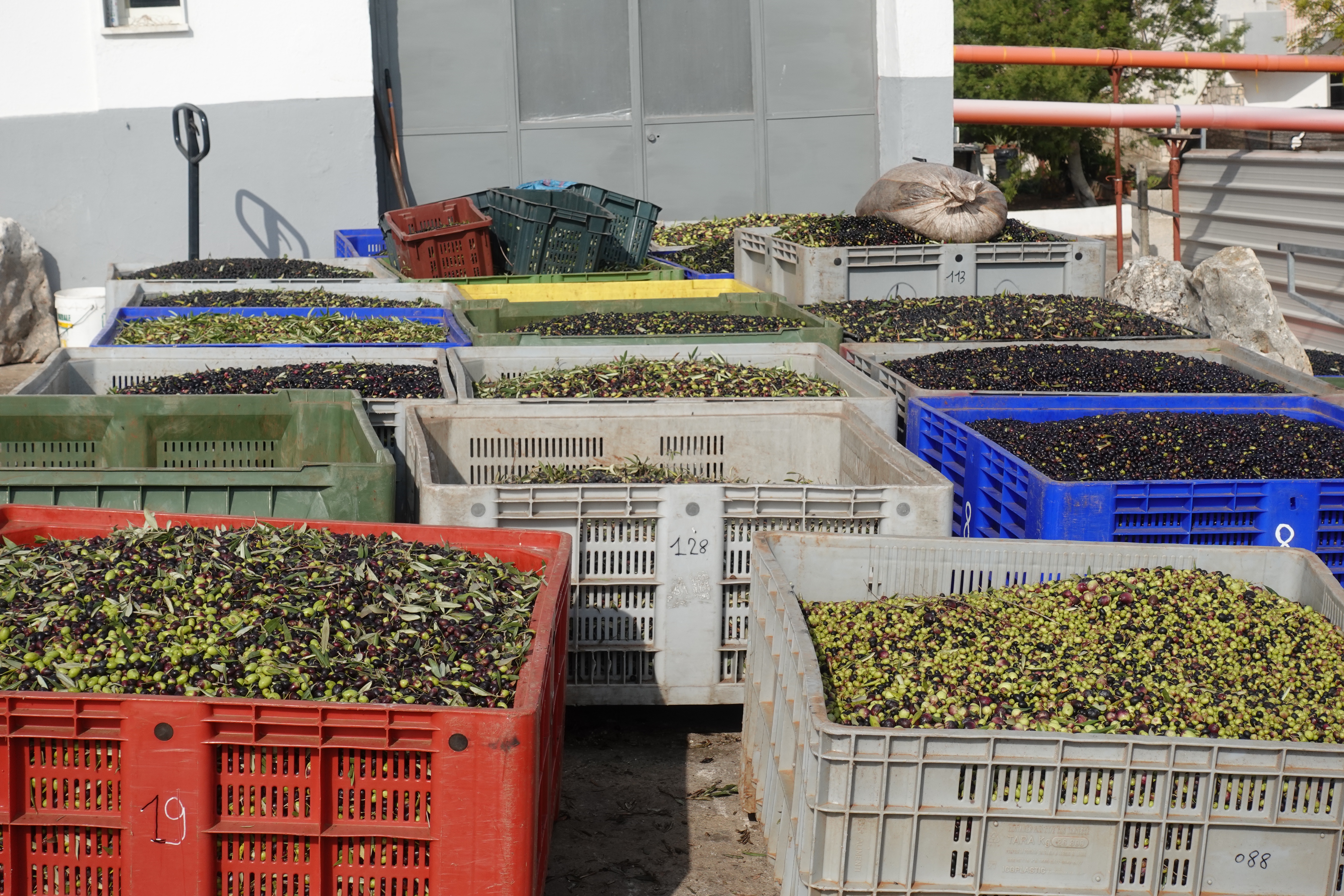 Nach einem Tag und einer Nacht in Bari machen wir uns auf den Weg weiter in den Süden. Wir kommen an riesigen Olivenhainen vorbei. Da stehen junge Bäume, die fast noch etwas flauschig aussehen und alte, knorrige Riesen. Unter den Bäumen liegen entweder Netze um die heruntergefallenen Oliven einzusammeln, oder der Boden ist fein säuberlich gefegt und sehr sauber. Unter manchen alten Bäumen ist der Boden schwarz-lila von den Oliven, die bereits am Boden liegen. Auch auf die Straße fallen die Früchte und werden von den Autos zu Brei zerquetscht. Ben und Kathrin können es kaum fassen, dass da so viel gutes Öl verloren geht.