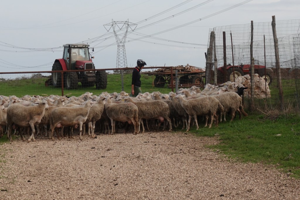 Das Navi hat sich wieder eine tolle Route ausgedacht: wir werden durch uralte Olivenhaine geleitet, die nach Olivenöl riechen, dass es eine Art hat. Wir bekommen mächtig Hunger. Dann biegen wir gemäß der Anweisung ab und landen in einer Schafherde, die von 5 riesigen Hunden bewacht wird. Allerdings etwas halbherzig, denn die Hunde bellen uns an, legen sich dann aber wieder gelangweilt hin. Die Schafe versammeln sich vor einem Tor, durch das wir anscheinend hindurch müssen. Das meint jedenfalls das Navi. Also ignorieren wir die Hunde und die aufgeregt blökenden Schafe und schieben uns behutsam durch das Tor, achten darauf, dass kein Tier entwischt, schließen das Tor umsichtig und setzen unseren Weg fort. Sehr bald werden wir von einem Auto ausgebremst, ein sichtlich aufgebrachter Italiener redet wild auf uns ein und knallt immer wieder seine Autotür zu. Es dämmert uns, dass wir nicht so willkommen sind hinter dem Tor, das wir soeben eigenmächtig passiert haben. Er bedeutet uns ihm zu folgen und so fahren wir mit sehr mulmigen Gefühlen dem Auto hinterher. Ein zweites Auto kommt hinzu, nun sollen wir diesem nachfahren: wo sind wir hier hineingeraten? Wir werden zum Ausgang eskortiert, der Mann hat eine kleine Tochter auf dem Arm, das lässt ihn weniger gefährlich erscheinen. Wir entschuldigen uns stammelnd und wortreich mit unseren rudimentären Floskeln und er beschriebt uns netterweise noch den richtigen Weg. Puuuuuh! Schnell fahren wir weg.
