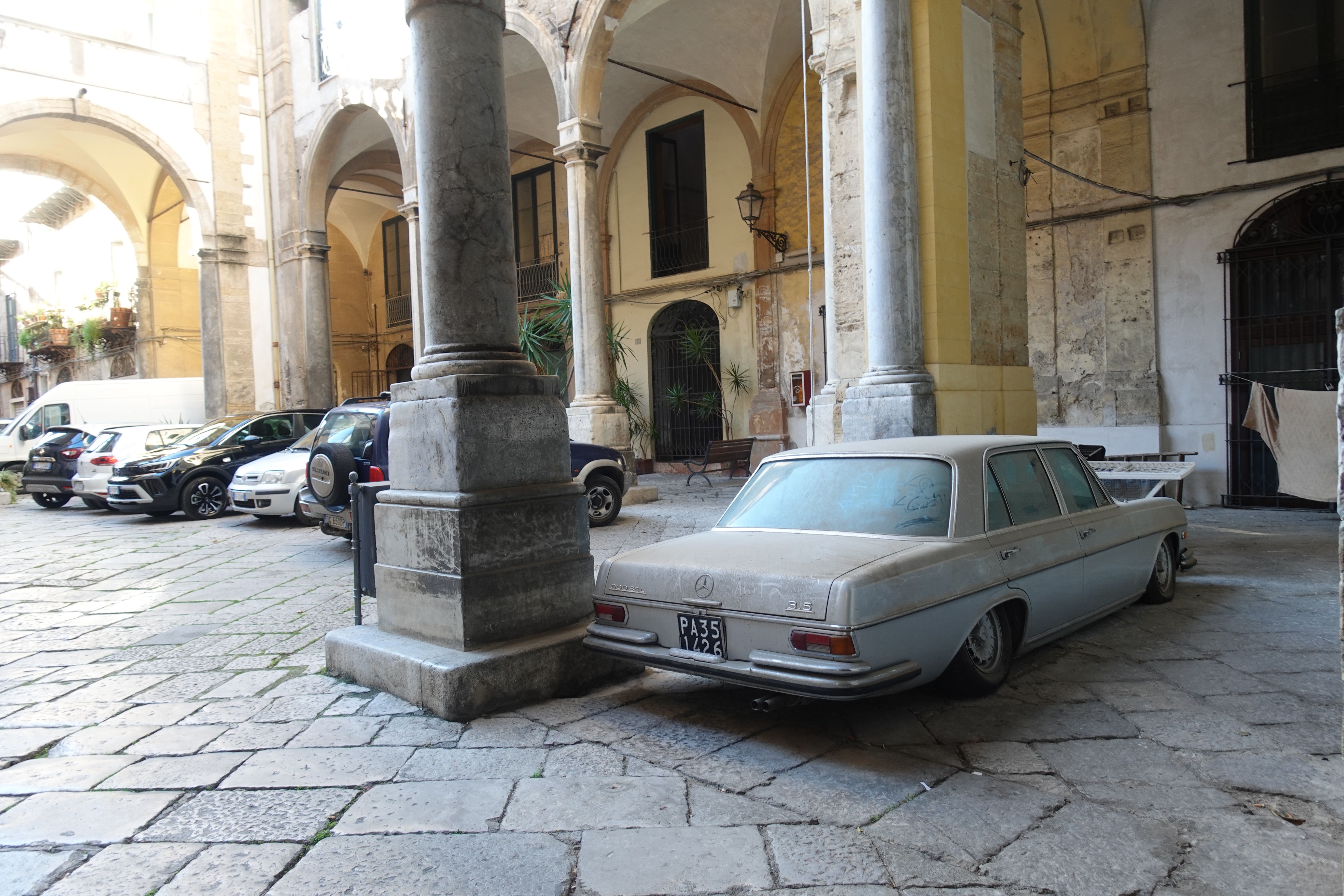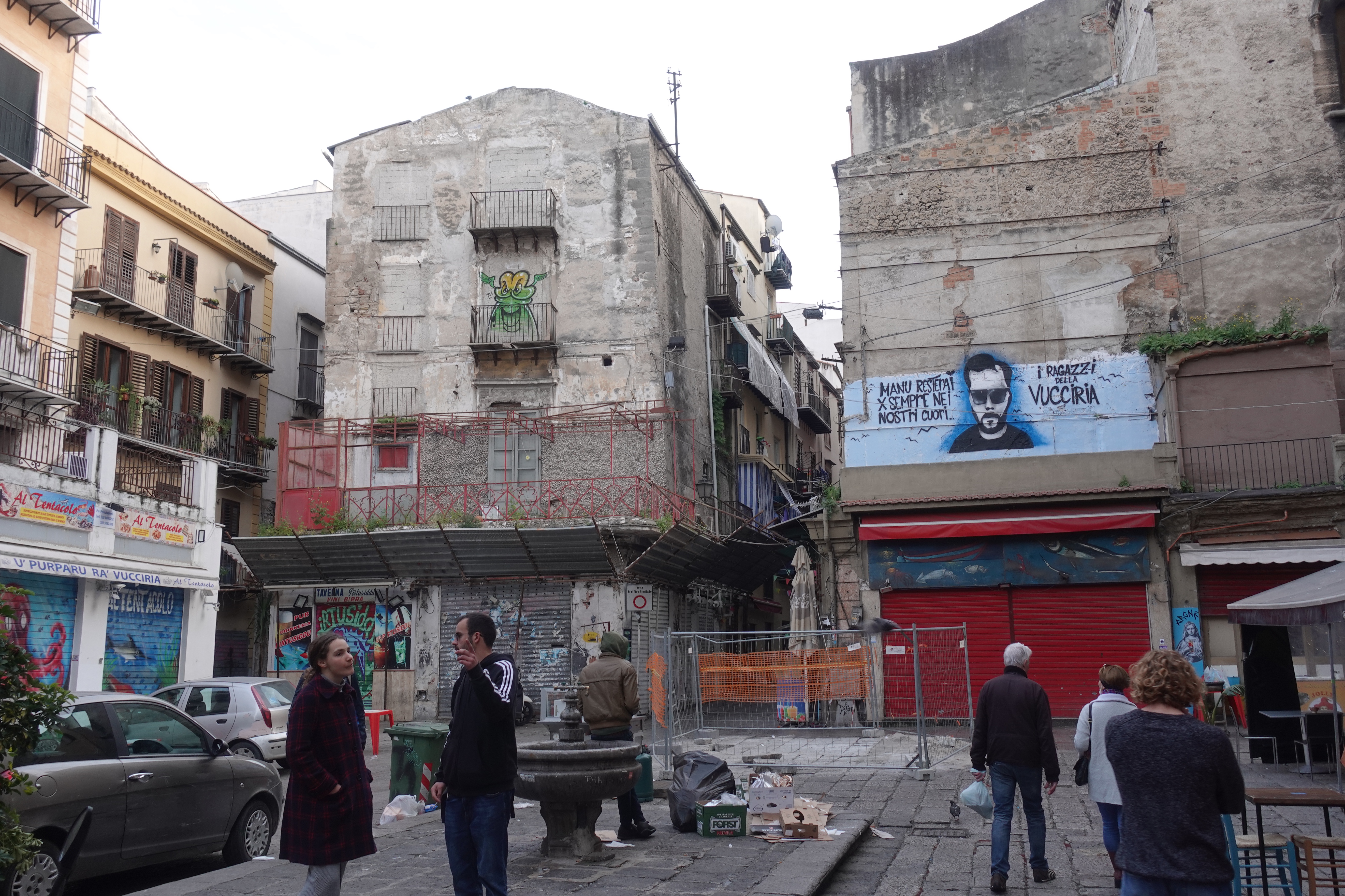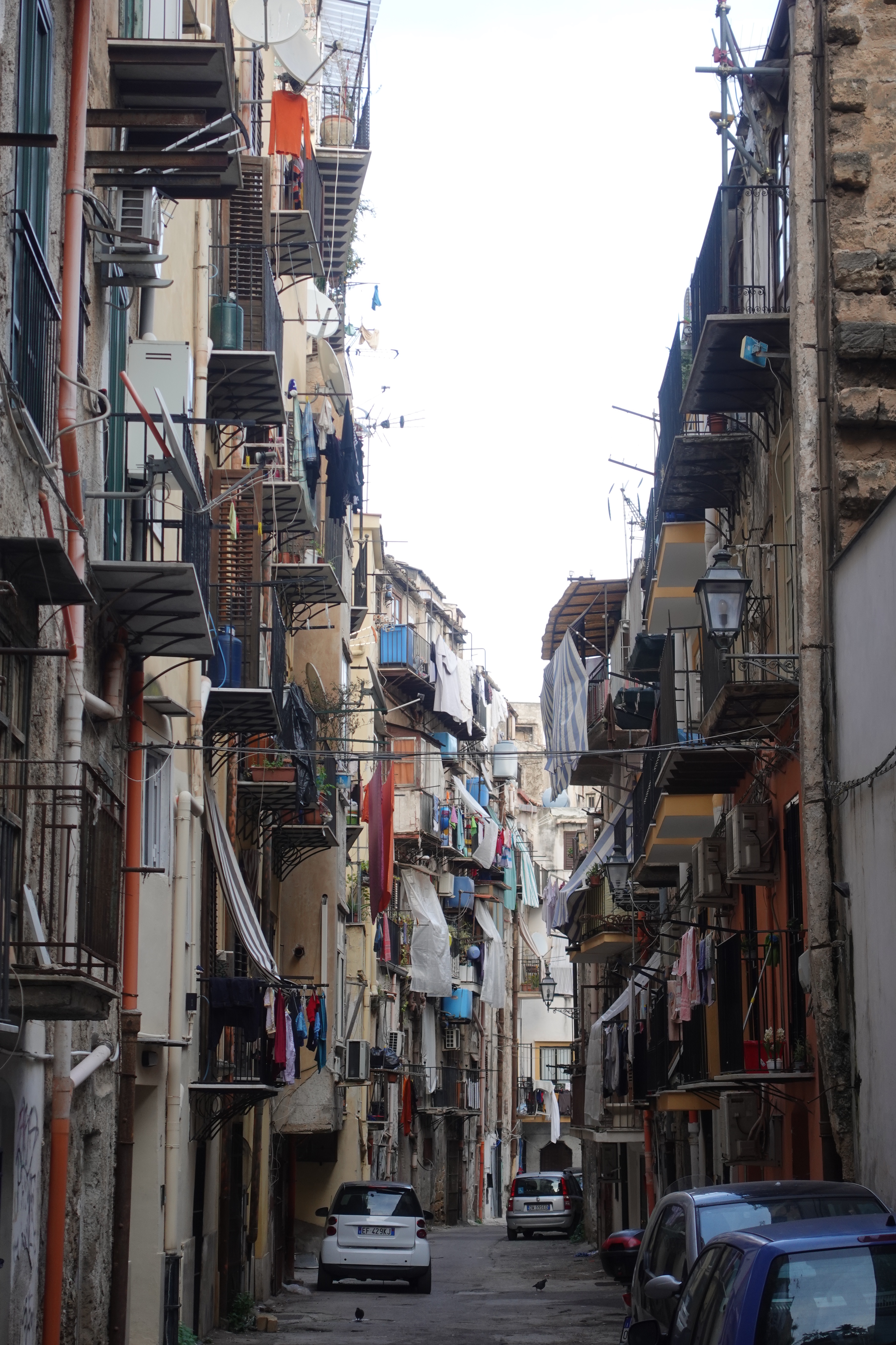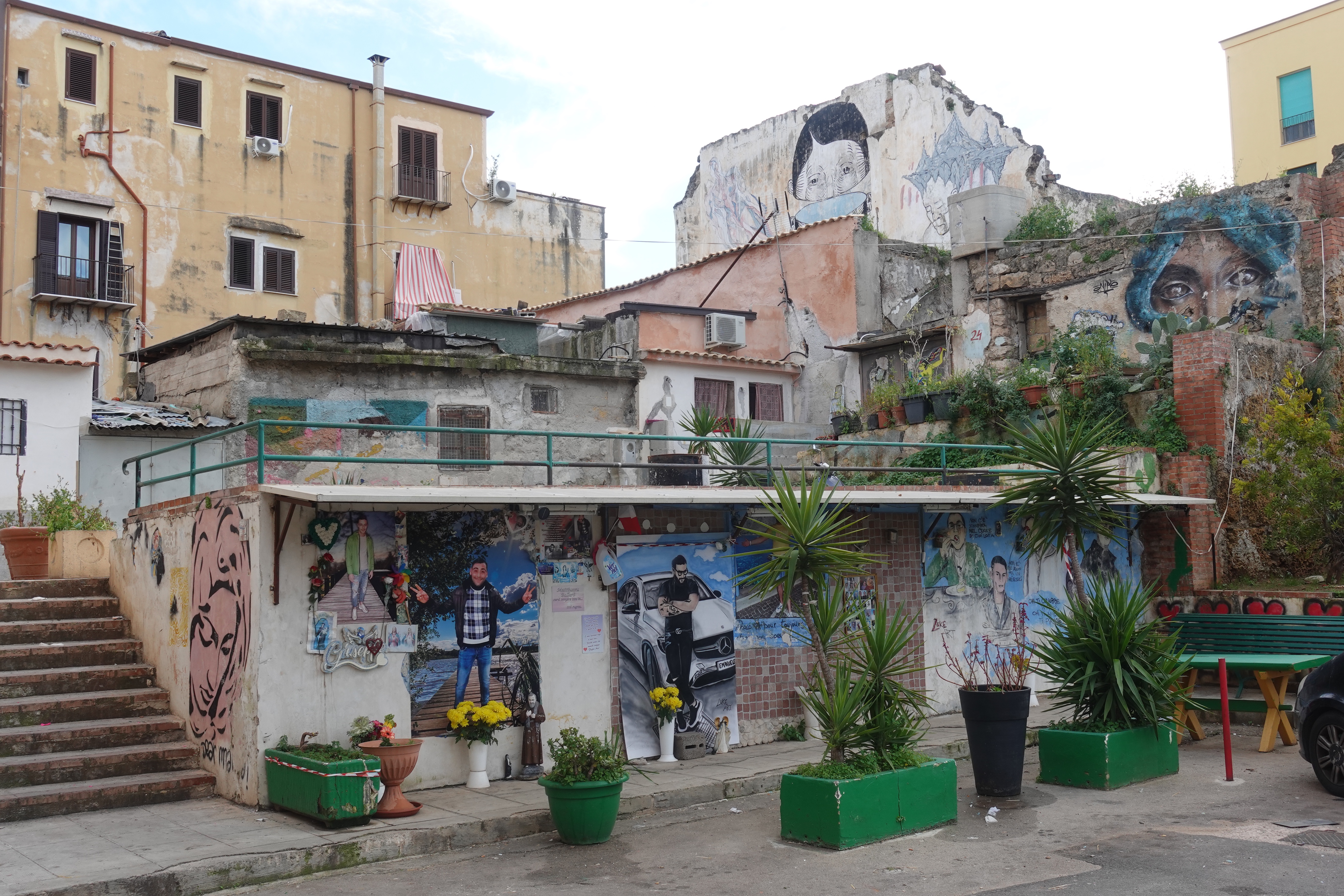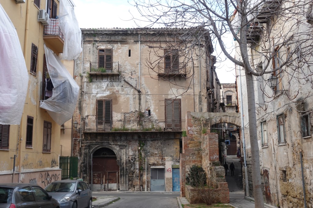Palermo liegt zwischen dem Meer auf der einen Seite und den Bergen auf der anderen. Dazwischen drängt sich alles. Es ist laut, schmutzig, chaotisch, herausfordernd, bedrängend, hässlich, kaputt und gleichzeitig fröhlich, charmant, einladend, bezaubernd und entspannt. Es gibt sehr viele Gebäude, die kaputt sind und aussehen wie Ruinen. Manchmal stimmt das und es sind tatsächlich Ruinen, bröckelnde Gesteine, die vielleicht noch von einem ebenfalls bröckelnden Baugerüst zusammengehalten werden. Aber oft trügt der Schein und das, was aussieht wie eine Ruine, ist hinter der Fassade ein bewohntes Haus, oder ein Palazzo. Manche Eingänge sind riesige Tore, die mit einem kleinen Einlasstürchen versehen sind. Manchmal können wir einen Blick in die oft riesigen Eingangshallen erhaschen, wenn ein Türchen aufgeht und der Roller oder Kinderwagen nach draußen geschoben wird. Die Stadt ist übervoll von alten Palazzi in den unterschiedlichsten Stadien der Verwesung und der Wiederbelebung.