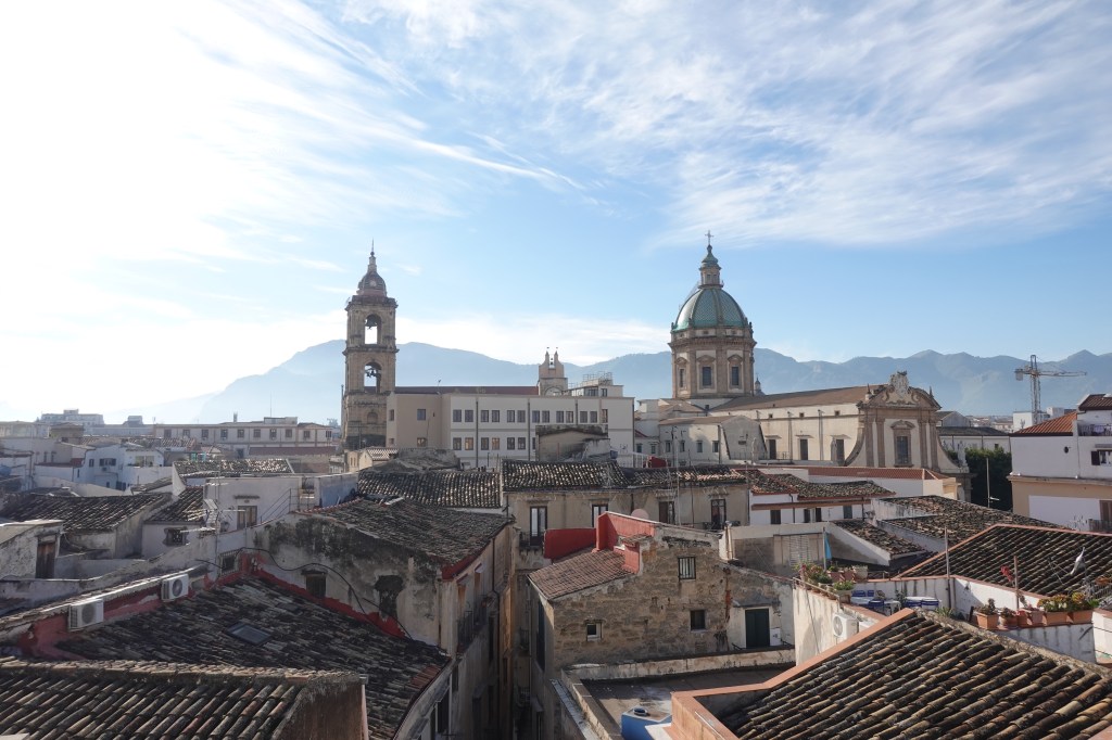 Wir haben ein kleines Apartment in der Altstadt gemietet und können auf der Dachterasse in der Sonne sitzen. Von unserem Platz aus können wir die Berge sehen und die Glocken hören. Zu jeder Stunde und halben Stunde bimmelt irgendeine Glocke von irgendwo, denn Palermo besteht zur Hälfte aus Kirchen. Zumindest kommt es uns so vor.