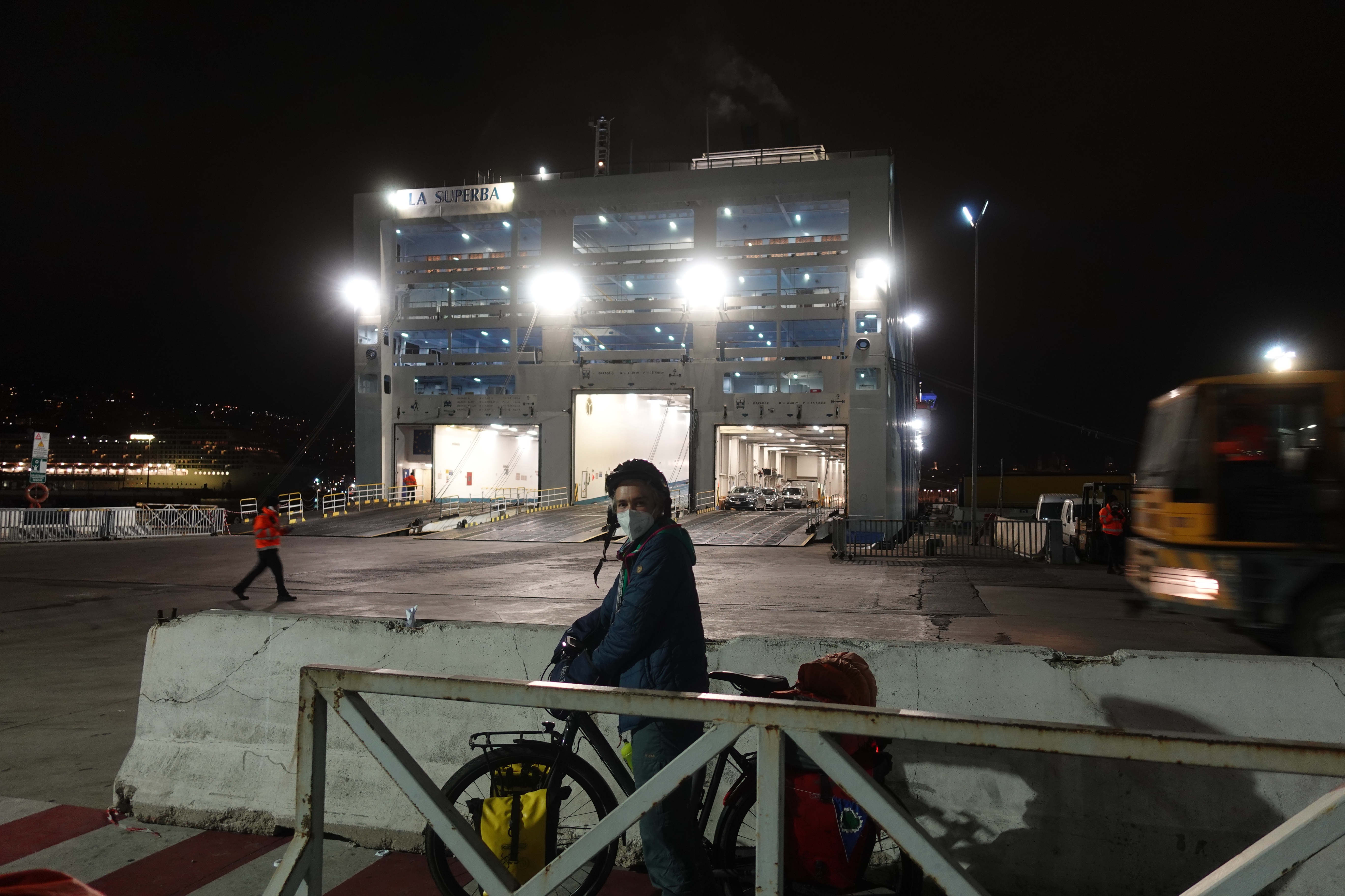 Nachts (!) um 4:00 Uhr machen wir uns in Dortmund auf den Weg zum Bahnhof …. und es geht wieder los mit dem Abenteuer Bahn und Rad: aufgrund der Umbauarbeiten am Bahnhof müssen wir unsere Räder absatteln und alles die Treppe hochtragen, aber wir erwischen den Zug. Im Zug erfahren wir dann, dass wir in Frankfurt mit Verspätung ankommen werden, Grund dafür ist eine Baustelle. Unser Anschlusszug ist damit weg. Einfach in den nächsten Zug können wir nicht steigen, denn wir brauchen einen reservierten Radstellplatz. Das System der Bahn ist im internationalen Zugverkehr mit den Rädern überfordert. Nach vielem Hin und Her am Schalter mit einem sehr freundlichen aber zunehmend verzweifelten Bahnbeamten, Unterstützung durch drei weitere KollegInnen und vielen Kommentaren zu dem unfähigen Buchungssystem in einem angeblich zusammenwachsenden Europa, kommt es zu folgender „Lösung“: wir müssen eine komplett neue Fahrkarte kaufen, die Räder alleine umbuchen geht nicht. Angeblich sollen wir das Geld zurück bekommen. (Nur soviel dazu: wir stehen in regem Mail-Verkehr mit der Bahn und es gestaltet sich sehr kompliziert.) Mit viel Unterstützung und Einsatz der italienischen Bahnmitarbeiter kommen wir am Abend noch passend in Genua an und erwischen die Fähre nach Palermo. Klappt alles, wir lassen nur ein wenig Nerven…..