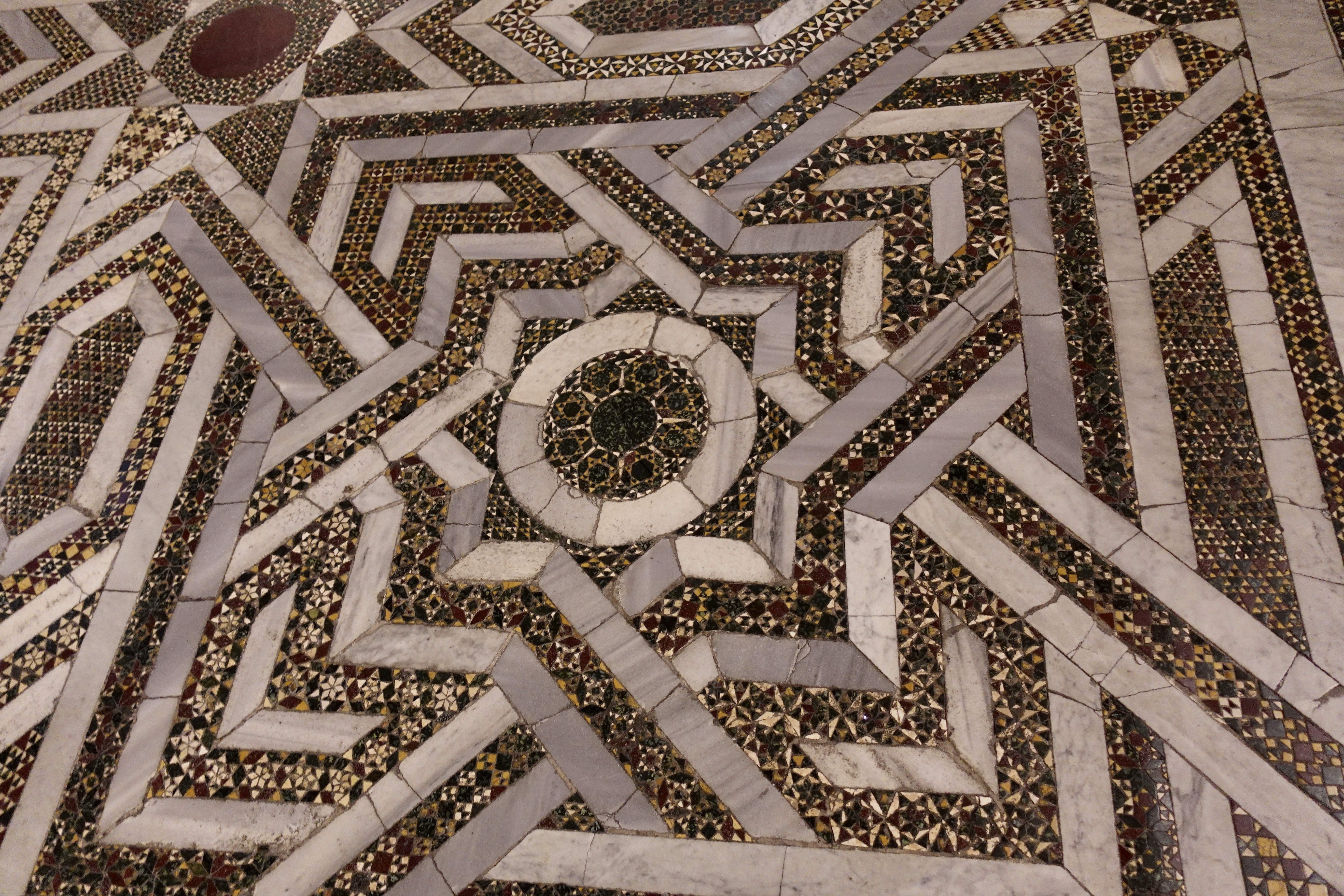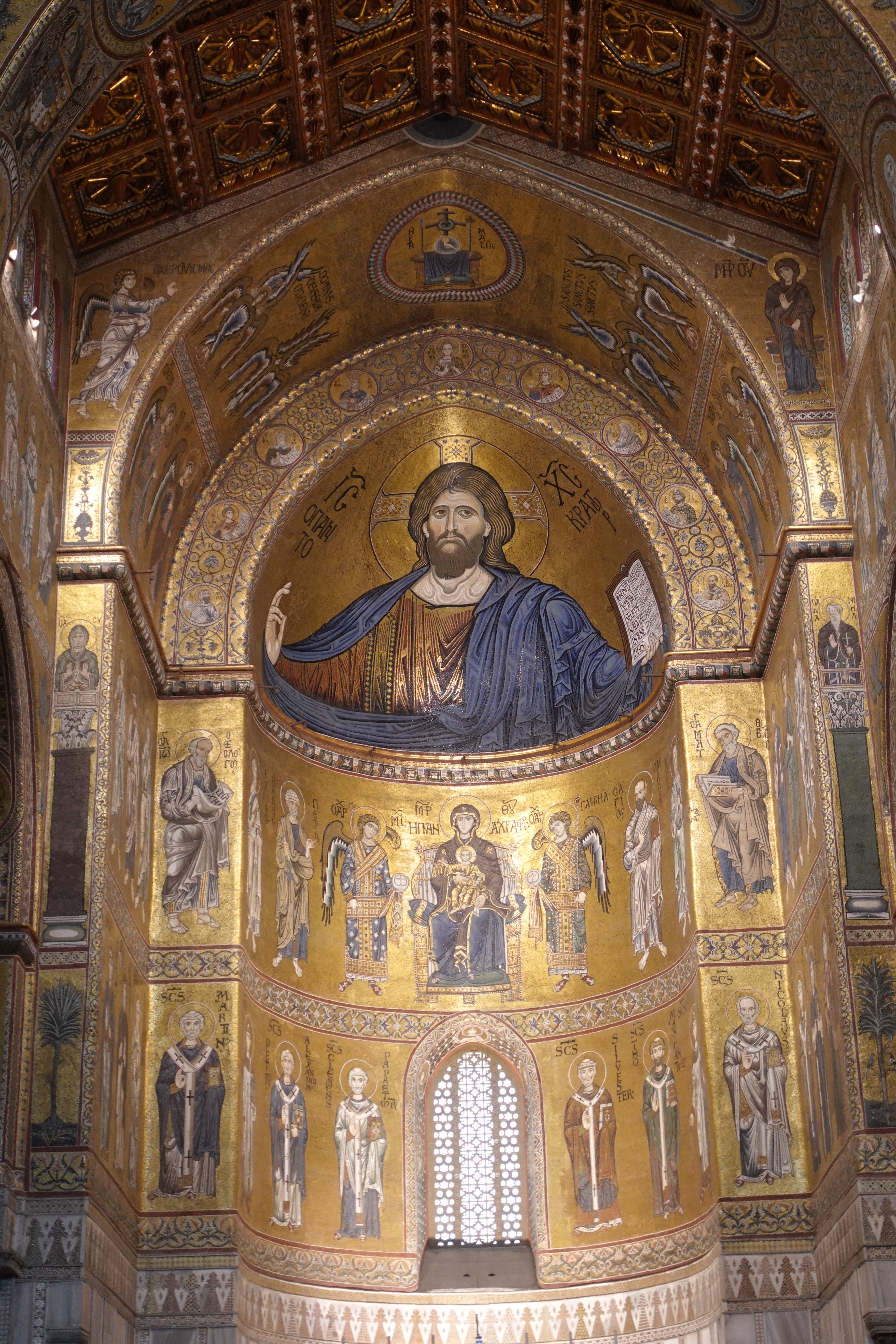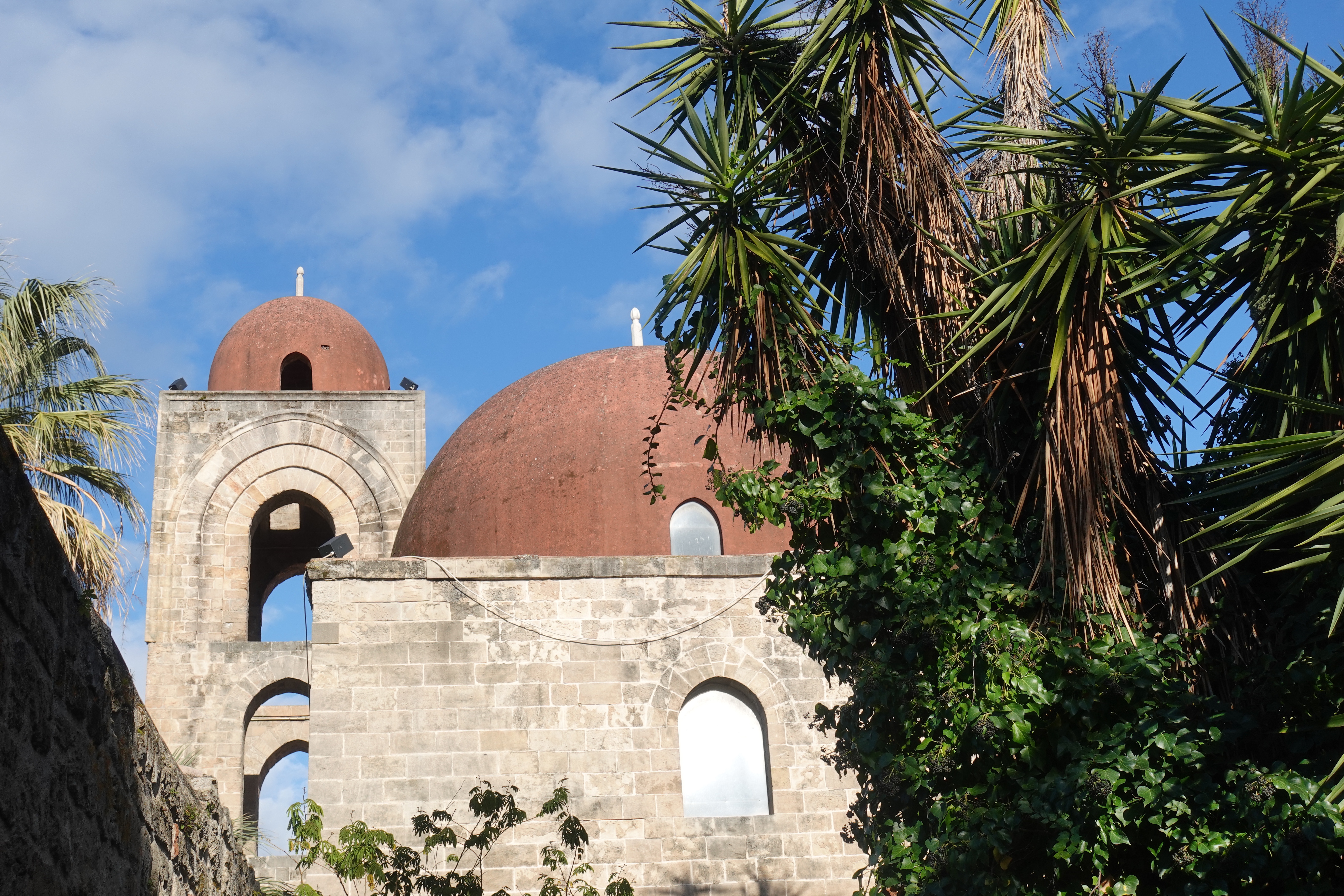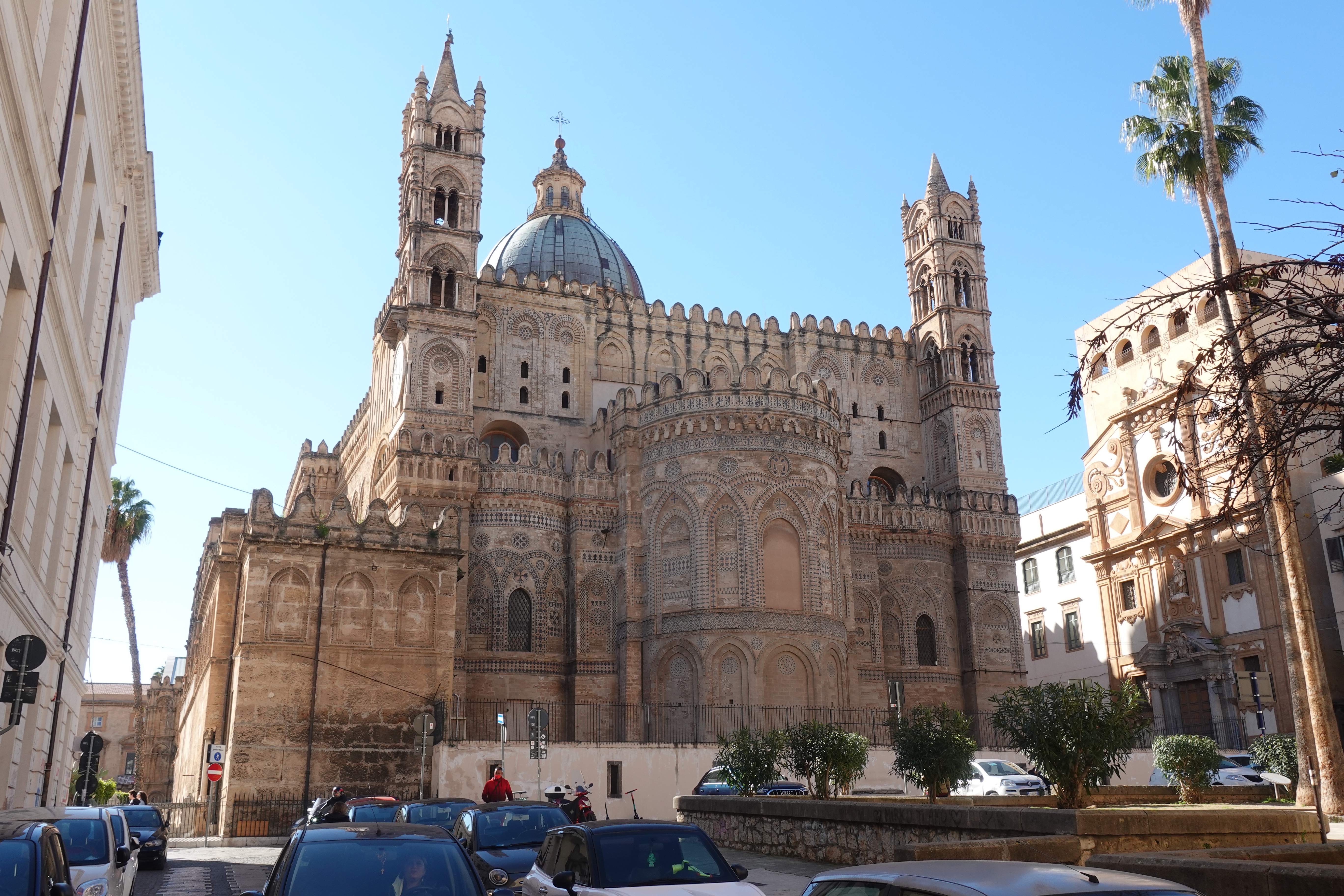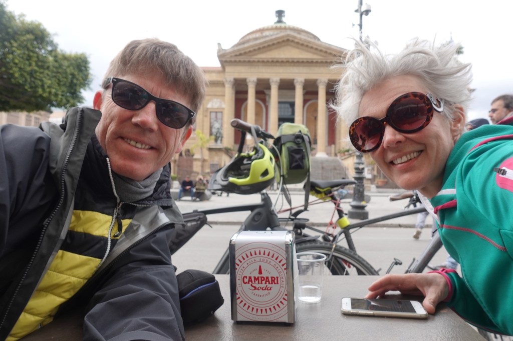 Palermo ist voll von Kunst und Geschichte. Ganz besonders hervorgehoben wird allerorten die normannisch-arabisch-byzantinische Kultur, der Sizilien und insbesondere Palermo, prächtige Kirchen und Gebäude zu verdanken hat. (Und wer sich jetzt wundert was die Normannen und die Byzantiner hier gemacht haben und obendrein noch die Araber, kann erahnen, warum auf Sizilien so viel Kultur herumliegt, dass man es kaum fassen kann.) Um 1200 herum wurden hier diverse Kirchen, Kathedralen und Paläste errichtet, die einen klaren byzantinischen Einfluss zeigen mit üppigen, goldenen Mosaiken und Verzierungen, kleinen runden Kuppeln und ausgeklügelten Belüftungs- und Wassersystemen. Aller Orten stoßen wir auf diese Gebäude in Palermo. Eine besondere Kathedrale liegt etwas außerhalb der Stadt, in Monreale. Wir schwingen uns auf die Räder und keuchen einen Berg hinauf, den es zu bezwingen gilt. Dann finden wir uns in einem biblischen Comic wieder. Der ganze Innenraum der Kathedrale von Monreale ist mit goldenen Mosaiken ausgekleidet, die Geschichten der Bibel zeigen. Wir kommen aus dem Staunen nicht heraus, überall gibt es eine Geschichte zu sehen und wieder ein neues Muster zu finden. Die Kathedrale ist in nur vier (4!) Jahren Bauzeit entstanden und ist die größte auf ganz Sizilien. Unvorstellbar was hier geschuftet wurde! Auch auf das Dach können wir steigen und haben von dort einen weiten Ausblick auf die Bucht und Palermo. Wunderschön, leider muss man für solche Aussichten immer die Berge hochstrampeln….