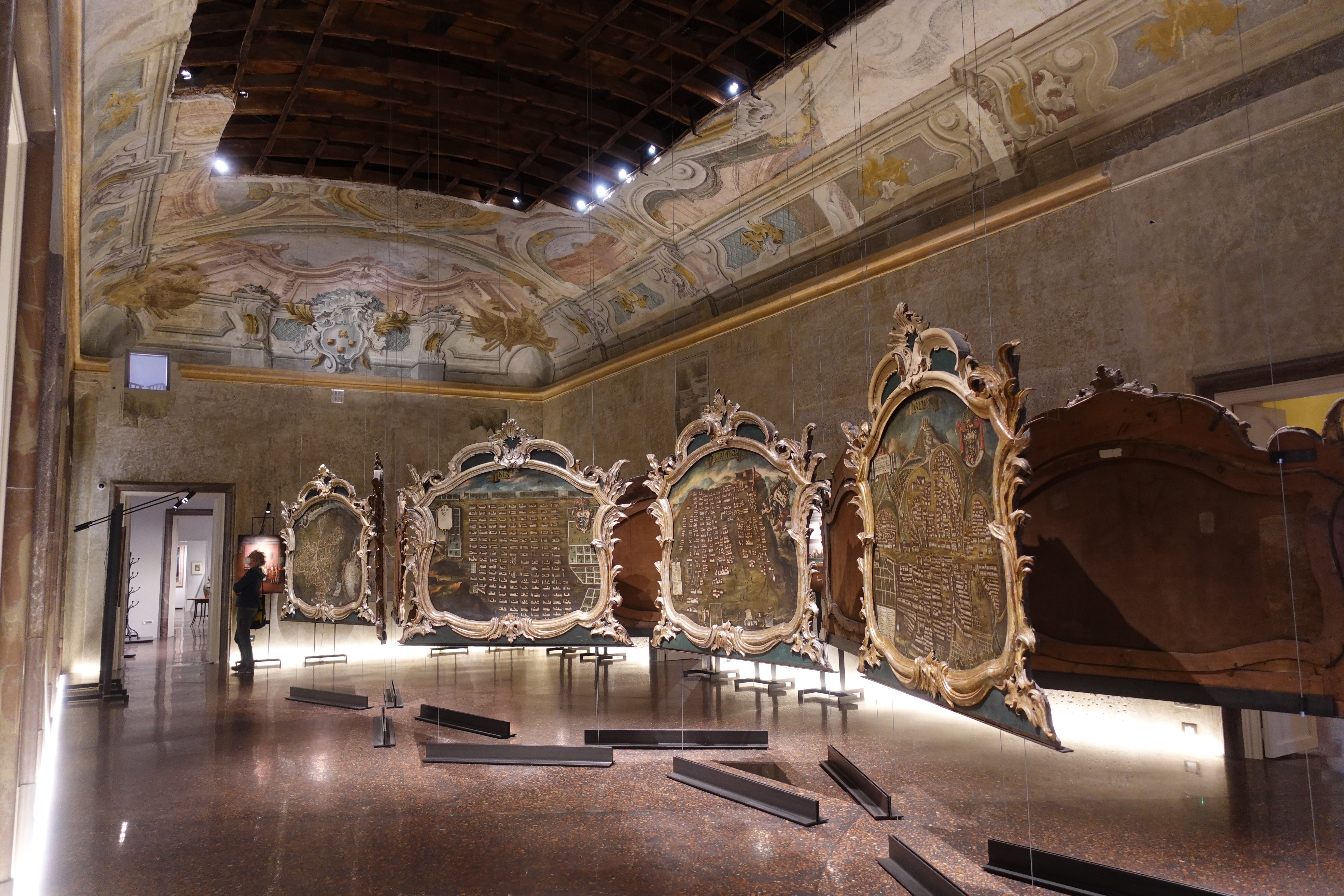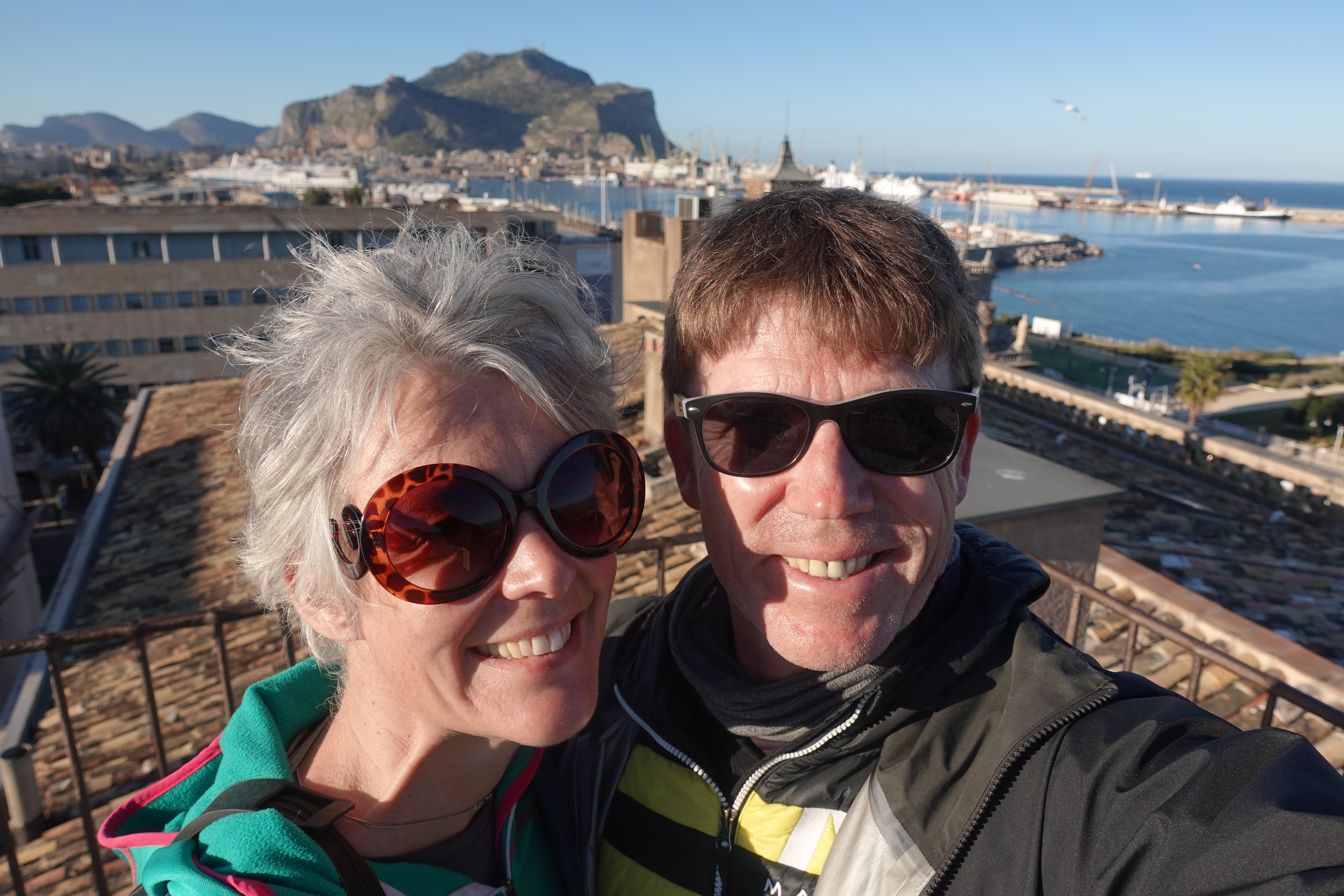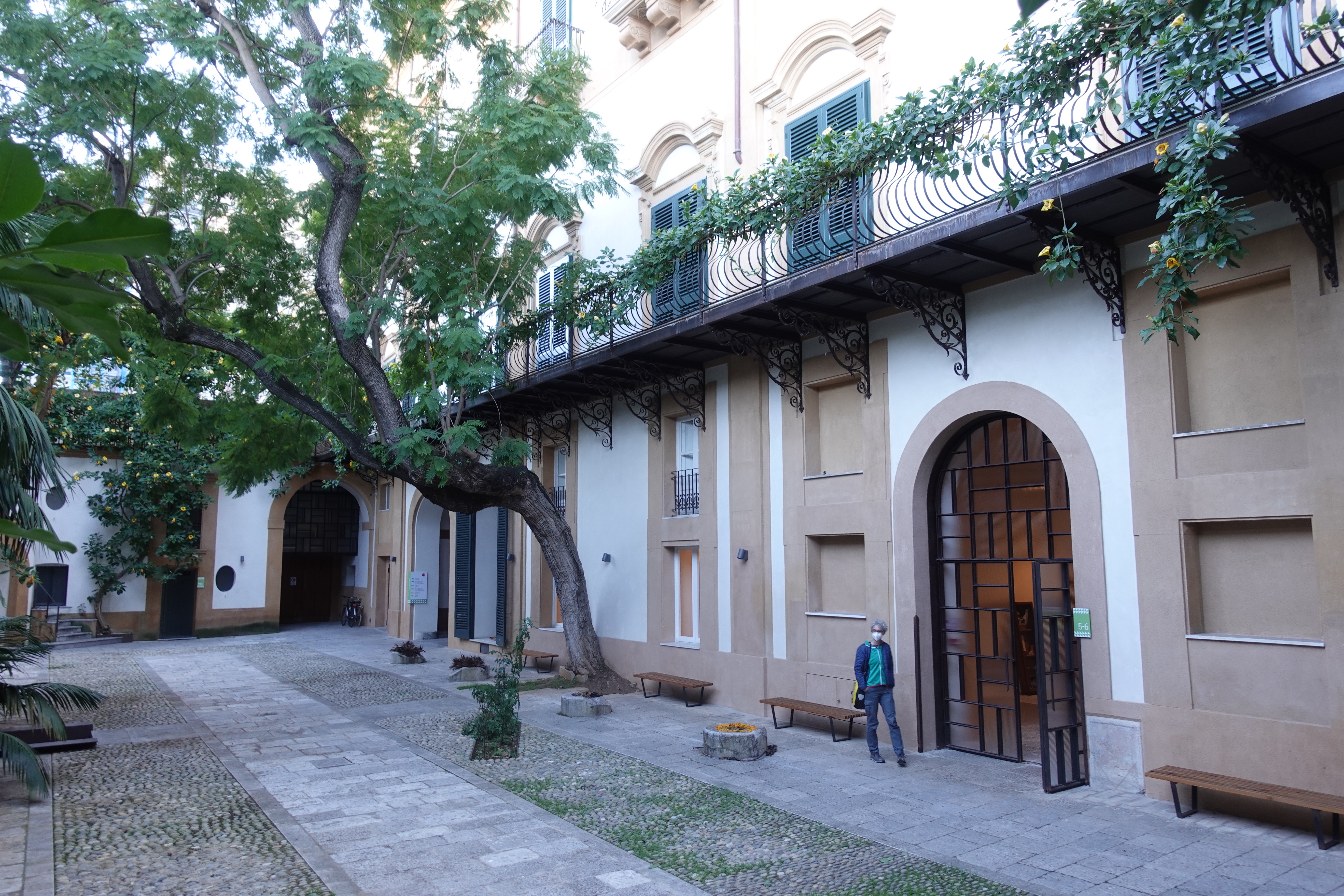 Wir laufen ziellos herum und schauen welche Ecken wir entdecken, und was es alles Spannendes gibt. So stoßen wir bei einem unserer Streifzüge auf den Palazzo Butera. Dies ist ein Palazzo, der uns von außen erst einmal nicht aufgefallen ist. Wie auch, ist hier doch alles voll mit irgendwelchen Häusern an denen eine Plakette hängt auf der dann „Palazzo so und so“ steht. Zusätzlich gibt es aber noch ein Plakat mit dem Hinweis auf eine Kunstausstellung und deshalb gehen wir hinein. Zum Glück, denn wir finden dort sehr spannende Kunst und ein fantastisch restauriertes Gebäude. Die Räume sind nicht komplett wieder so hergestellt, wie sie einmal ausgesehen haben mögen, sondern man hat das, was zu retten war, gerettet und was sehr kaputt war in einer wunderbar kreativen Art derart umgestaltet, dass man über die tollen Details nur staunen kann und oft auch Einblicke in die Originalkonstruktionen des Palazzos erhält. So findet man in einem Saal nur noch den äußeren Bereich der Decke mit Fresken bemalt, der restliche Teil gibt den Ausblick auf die Deckenkonstruktion frei. Eine Etage höher kann das Ganze auch von oben betrachtet werden. Außerdem gibt es moderne Fresken und grafische Malereien an neugestalteten Decken direkt neben klassisch restaurierten Räumen. Das alles, zusammen mit der Vielzahl an Kunstgegenständen der unterschiedlichsten Epochen, die hier ausgestellt sind, gibt einen sehr spannenden Mix aus verschiedenen Bau- und Kunststilen. Die gezeigte Kunst ist aus der Sammlung von Francesca und Massimo Valsecchi, die diesen Palazzo auch in der jetzigen Form restauriert haben. Wir werden durch die Dachkonstruktion auf eine kleine Aussichtsplattform oben auf dem Dach geleitet, von wo aus wir den Hafen, das Meer und den Hausberg Palermos, den Monte Pellegrino, im Sonnenschein bewundern können. Wir halten uns stundenlang hier auf und sind am Ende übervoll mit Eindrücken.