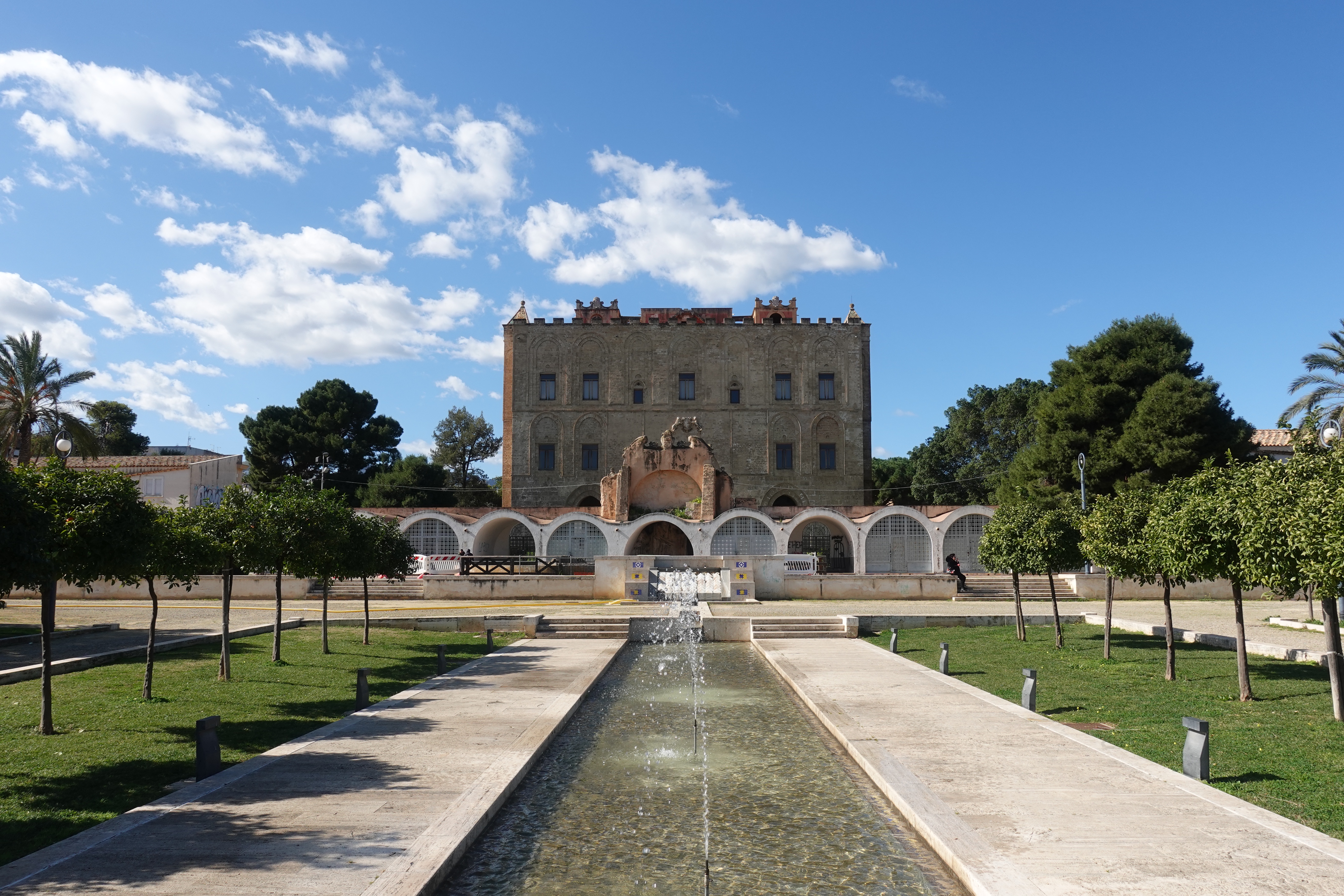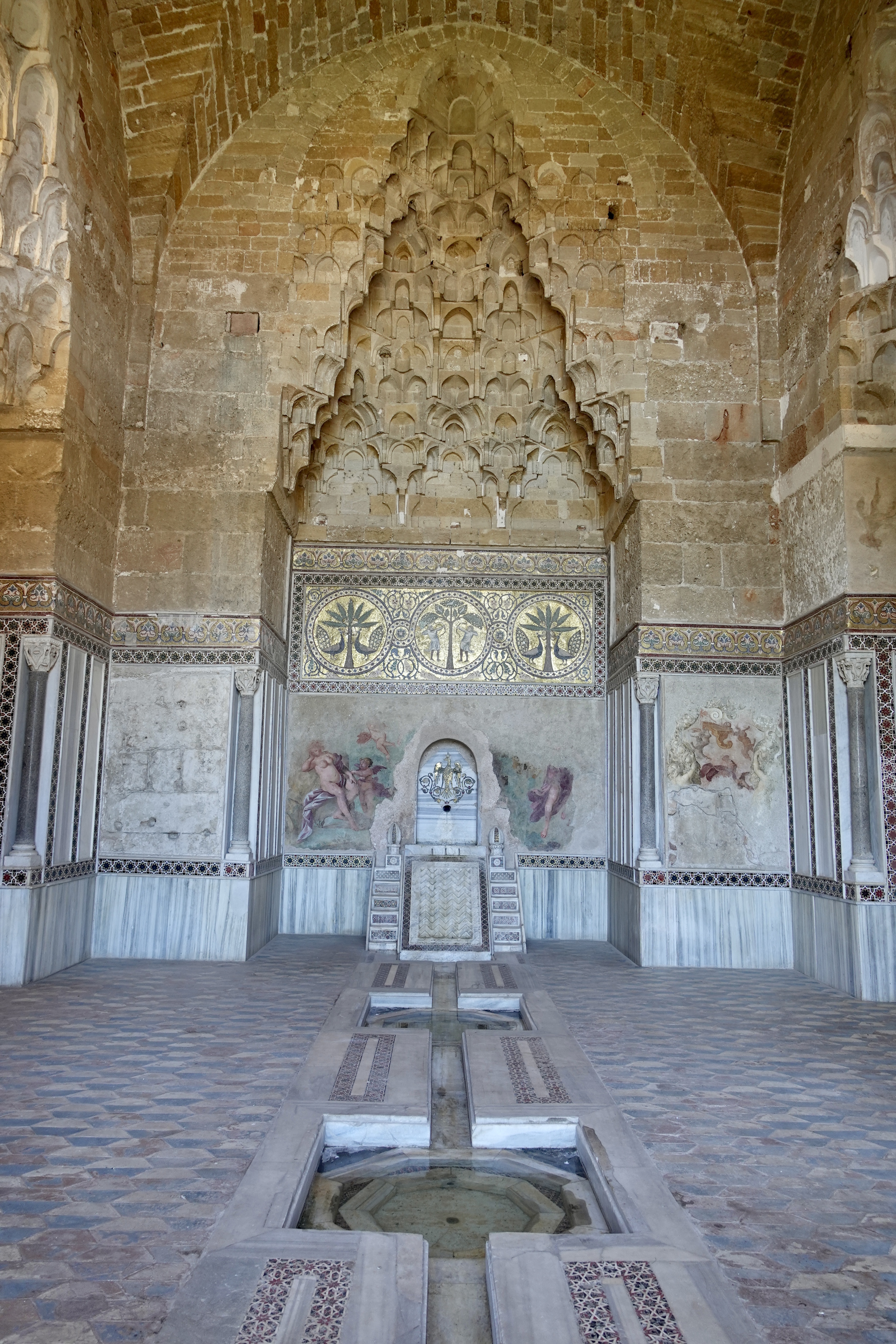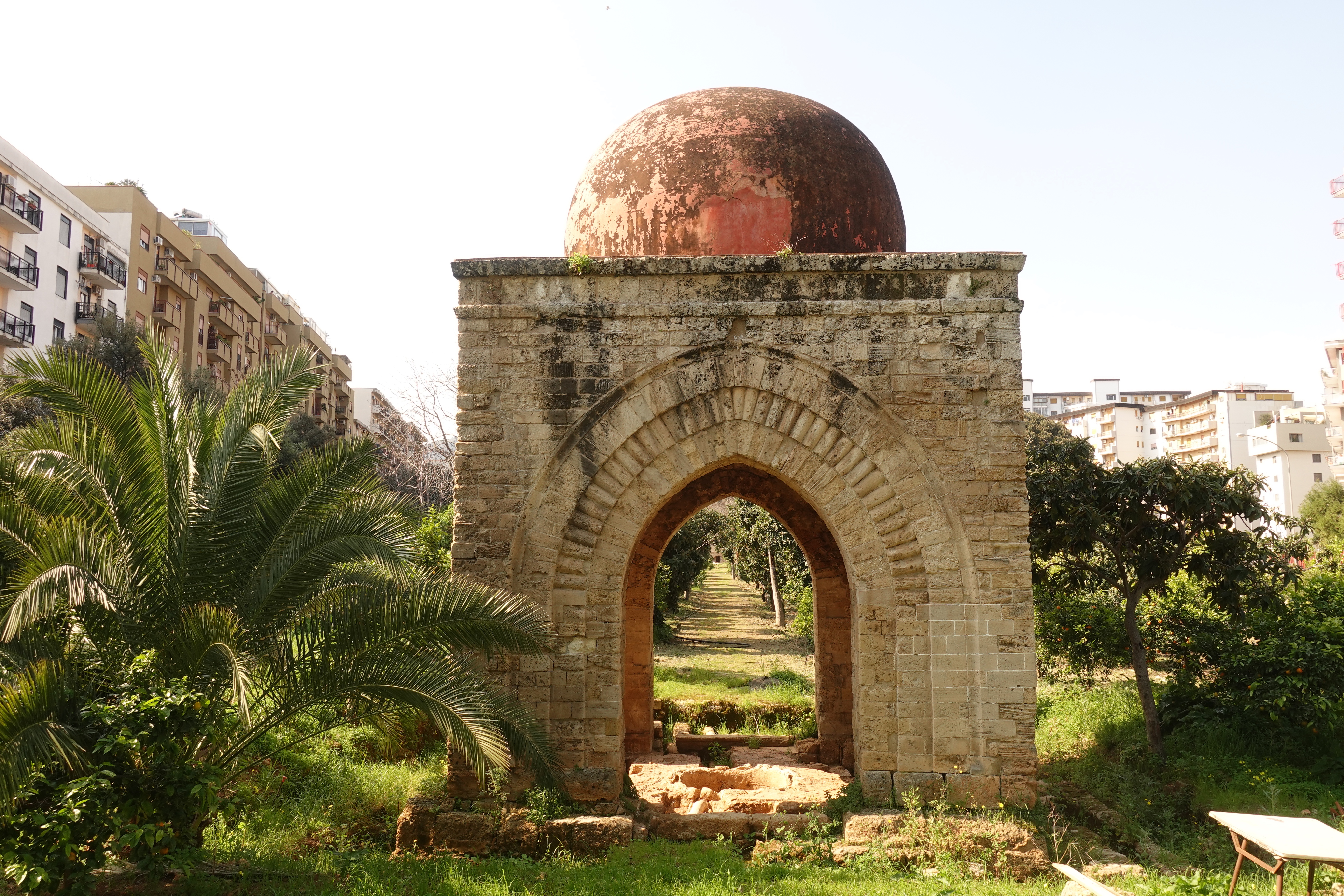 Wir laufen ziellos herum und schauen welche Ecken wir entdecken, und was es alles Spannendes gibt. So stoßen wir bei einem unserer Streifzüge auf den Palazzo Butera. Dies ist ein Palazzo, der uns von außen erst einmal nicht aufgefallen ist. Wie auch, ist hier doch alles voll mit irgendwelchen Häusern an denen eine Plakette hängt auf der dann „Palazzo so und so“ steht. Zusätzlich gibt es aber noch ein Plakat mit dem Hinweis auf eine Kunstausstellung und deshalb gehen wir hinein. Zum Glück, denn wir finden dort sehr spannende Kunst und ein fantastisch restauriertes Gebäude. Die Räume sind nicht komplett wieder so hergestellt, wie sie einmal ausgesehen haben mögen, sondern man hat das, was zu retten war, gerettet und was sehr kaputt war in einer wunderbar kreativen Art derart umgestaltet, dass man über die tollen Details nur staunen kann und oft auch Einblicke in die Originalkonstruktionen des Palazzos erhält. So findet man in einem Saal nur noch den äußeren Bereich der Decke mit Fresken bemalt, der restliche Teil gibt den Ausblick auf die Deckenkonstruktion frei. Eine Etage höher kann das Ganze auch von oben betrachtet werden. Außerdem gibt es moderne Fresken und grafische Malereien an neugestalteten Decken direkt neben klassisch restaurierten Räumen. Das alles, zusammen mit der Vielzahl an Kunstgegenständen der unterschiedlichsten Epochen, die hier ausgestellt sind, gibt einen sehr spannenden Mix aus verschiedenen Bau- und Kunststilen. Die gezeigte Kunst ist aus der Sammlung von Francesca und Massimo Valsecchi, die diesen Palazzo auch in der jetzigen Form restauriert haben. Wir werden durch die Dachkonstruktion auf eine kleine Aussichtsplattform oben auf dem Dach geleitet, von wo aus wir den Hafen, das Meer und den Hausberg Palermos, den Monte Pellegrino, im Sonnenschein bewundern können. Wir halten uns stundenlang hier auf und sind am Ende übervoll mit Eindrücken.