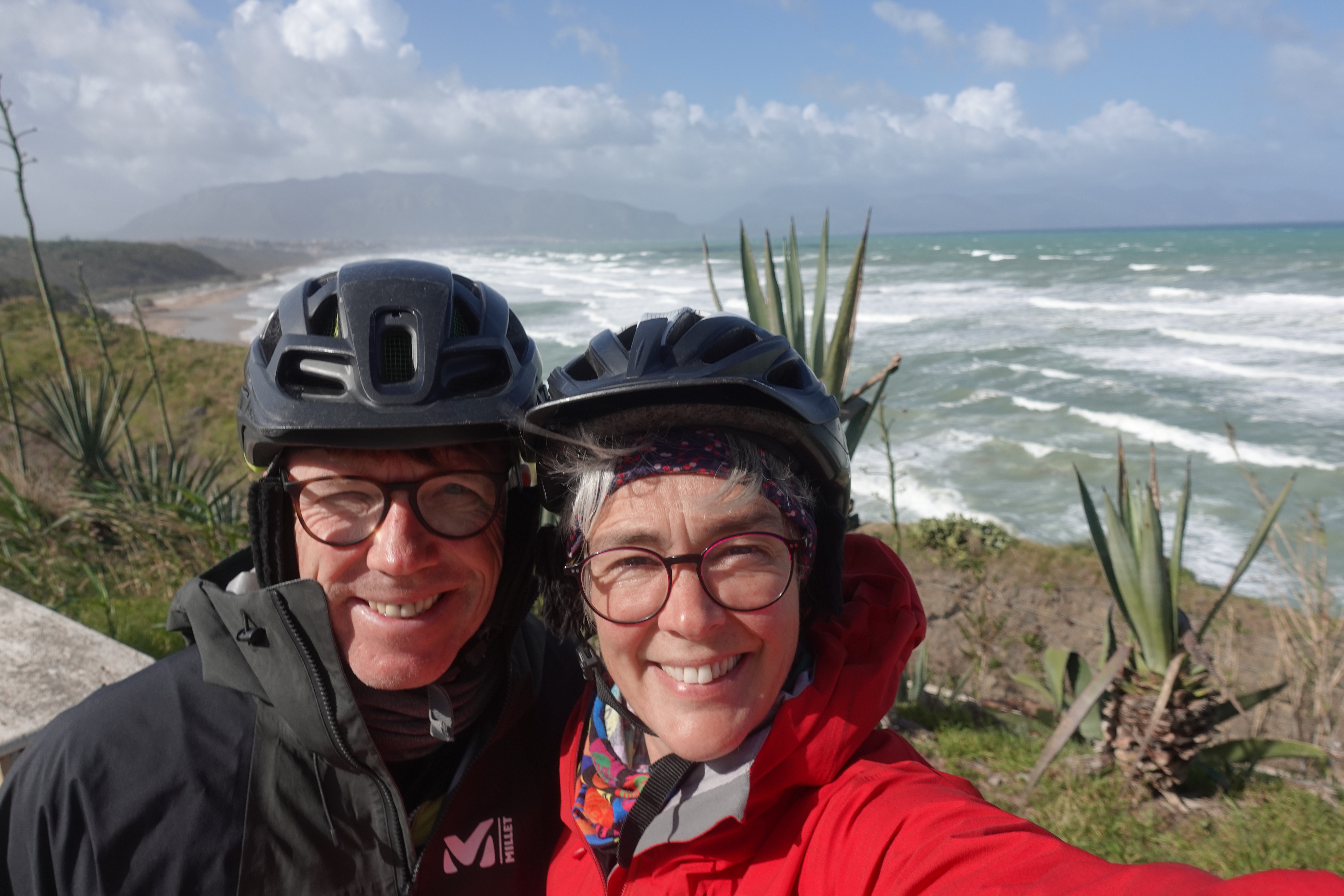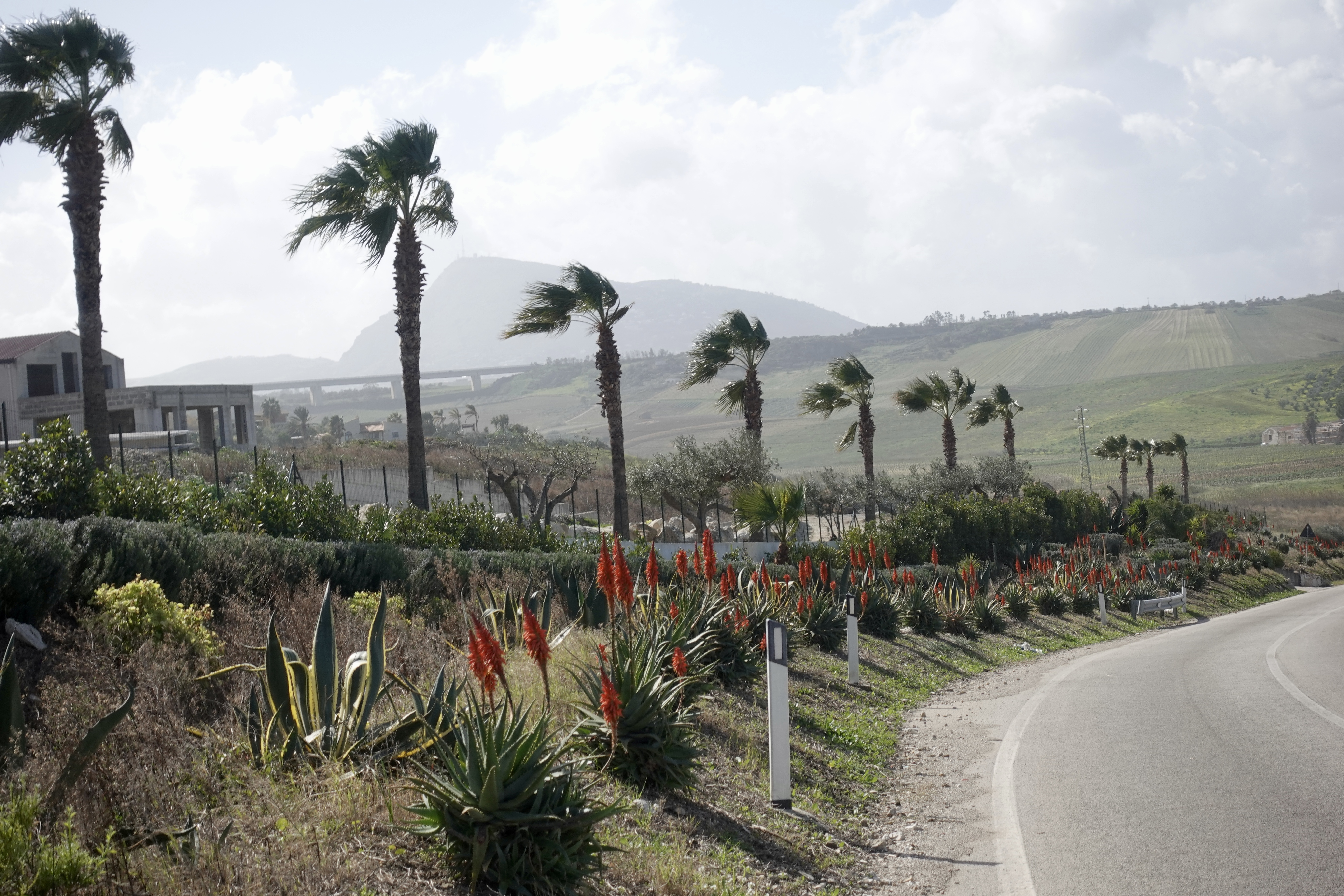 Es geht an die Westküste und nachdem wir die Randbezirke von Palermo hinter uns gelassen haben, kommen wir ans Meer! Es liegt da im Sonnenschein und haut uns mit seinen Farben um. Das wollen wir in einer Bar beim Espresso genießen. Wie das so ist: das Meer ist auf der einen Seite, dann kommt eine Häuserzeile und dann kommen die ganzen Bars und vom Meer ist vor lauter Häusern nix zu sehen. Nun ja. So landen wir in einer typischen Bar der Stadt mit den alten Männern, die hier ihren täglichen Kaffee trinken und dabei alle ihrer Kollegen und Freunde treffen. Wir kommen ins Gespräch mit einem Mann, der mit einer Frau aus Deutschland verheiratet war. Sie ist seit vier Jahren tot und noch immer werden seine Augen beim Klang der deutschen Sprache feucht. Wir haben ein anrührendes Gespräch mit ihm. Er berichtet von seinen Reisen und Freundschaften in Deutschland und immer wieder blitzt hindurch, wie sehr er seine Frau liebt. Wir radeln ergriffen, beglückt und ebenfalls mit feuchten Augen weiter.