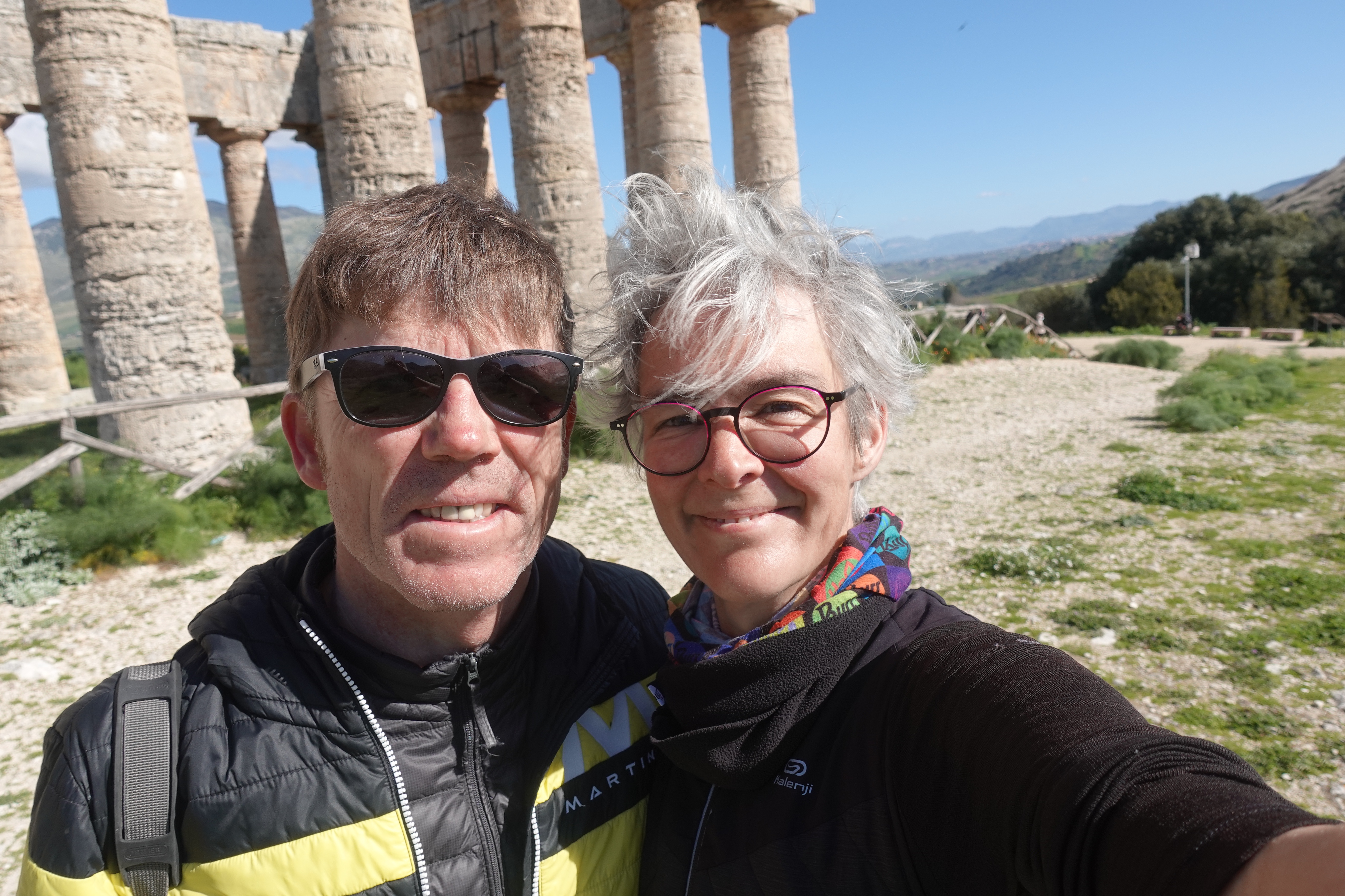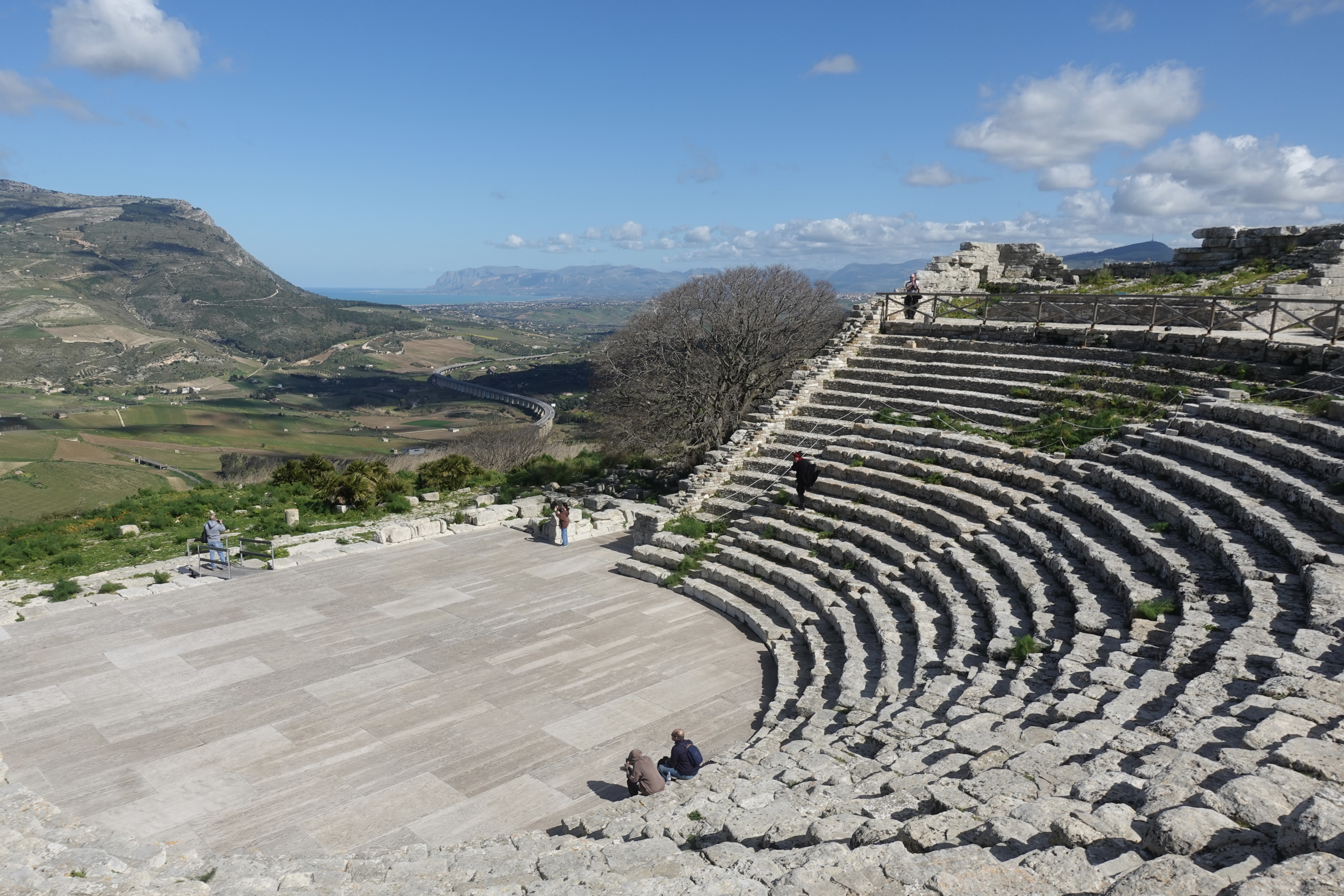 Überall steht und liegt antikes Zeugs rum. Wir fahren nach Segeste, einer antiken Tempelanlage, die sehr malerisch in der Landschaft thront. Uns gefällt am allerbesten, dass es eine antike Bauruine ist. Dieser Tempel wurde nie fertiggestellt, aber die Bauruine hat bestand. Gleich nebenan, noch ein wenig den Berg hinauf, findet sich ein Theater. Die Aussicht ist so grandios, dass eine Aufführung hier nur stören würde. Warum wurde hier oben ein Theater gebaut, fragen wir uns?