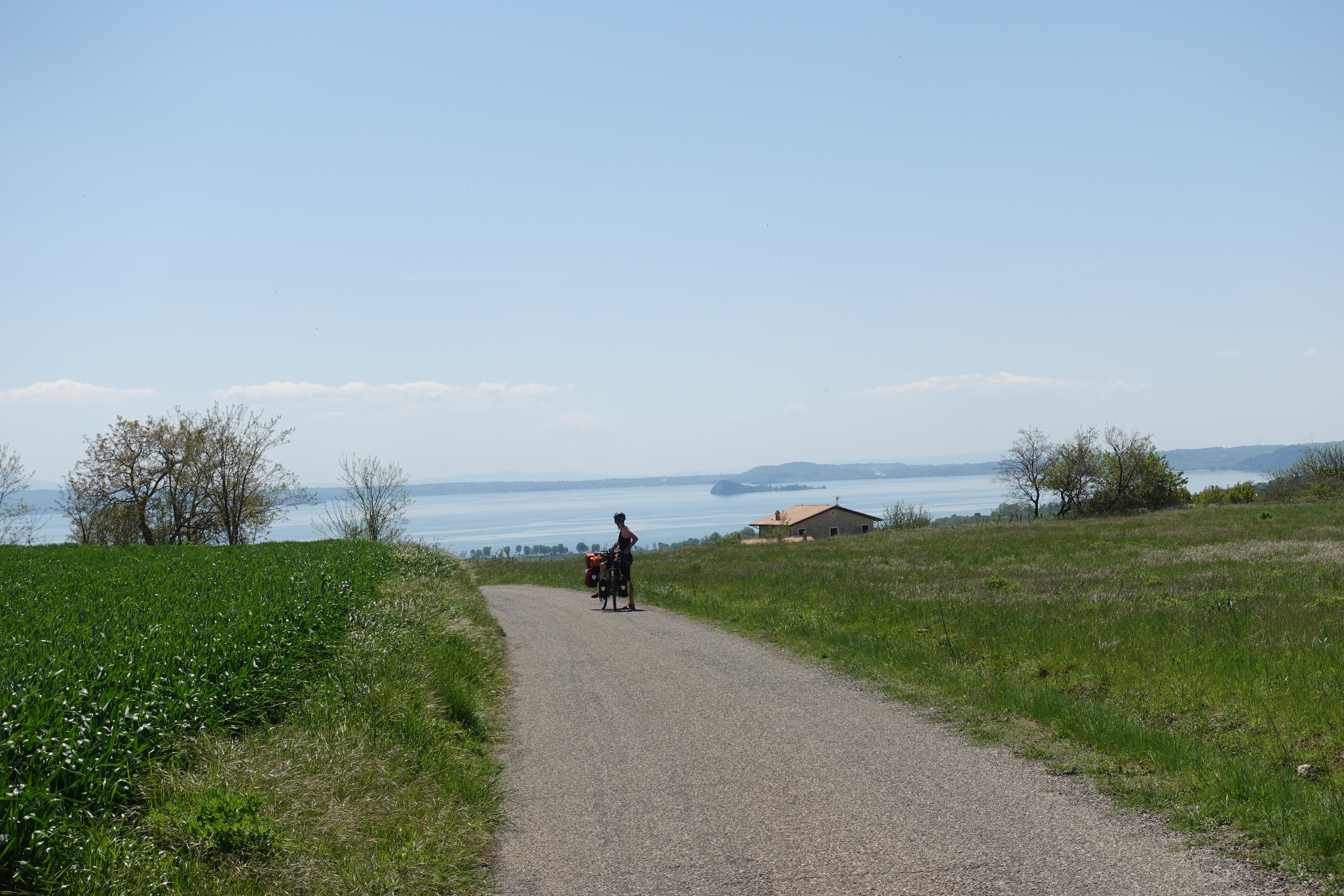 Kathy fliegt zurück nach Kanada, Anna nach Malaysia und wir radeln Richtung Norden in das Gebiet der Vulkanseen. Die Vulkane sind schon seit laaaaanger Zeit erloschen, aber die Krater, die sie hinterlassen haben, sind mit Wasser vollgelaufen und nun ziemlich runde Seen. Was einen ehemaligen Vulkan auszeichnet ist mitunter, dass er ein Berg ist. Für uns bedeutet dies, dass wir, um zu dem See zu kommen, erst einen Berg/Kraterrand hinaufradeln und dann, oben angekommen, auf der anderen Seite wieder hinterrollen. Wir bremsen, bevor wir im Wasser landen. So erleben wir den Lago di Vico und den Lago di Bolsena. Wir fahren auch durch endlos erscheinende Haselnusshaine, was bei dem Nutellakonsum, den wir hier erleben, auch notwendig erscheint.