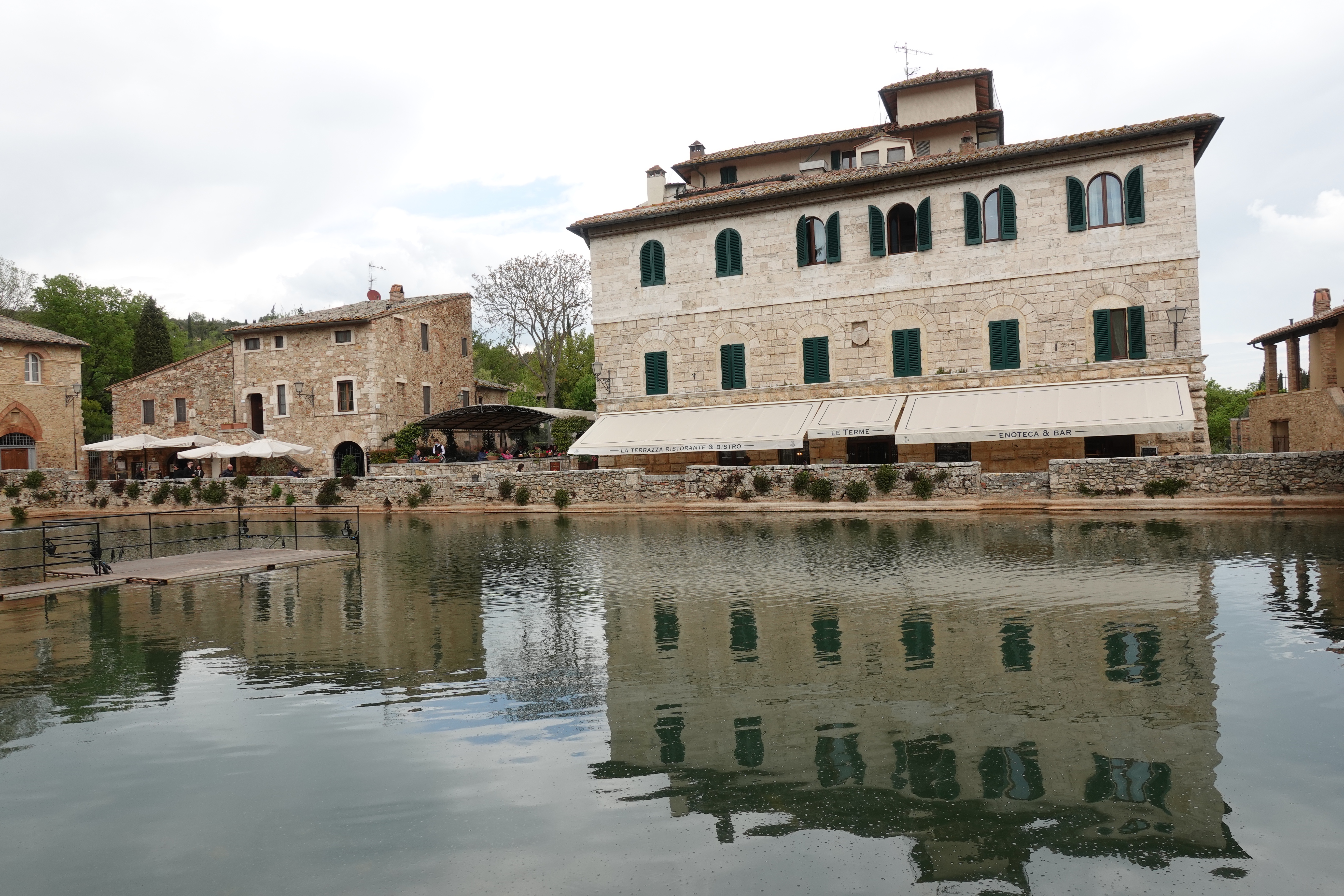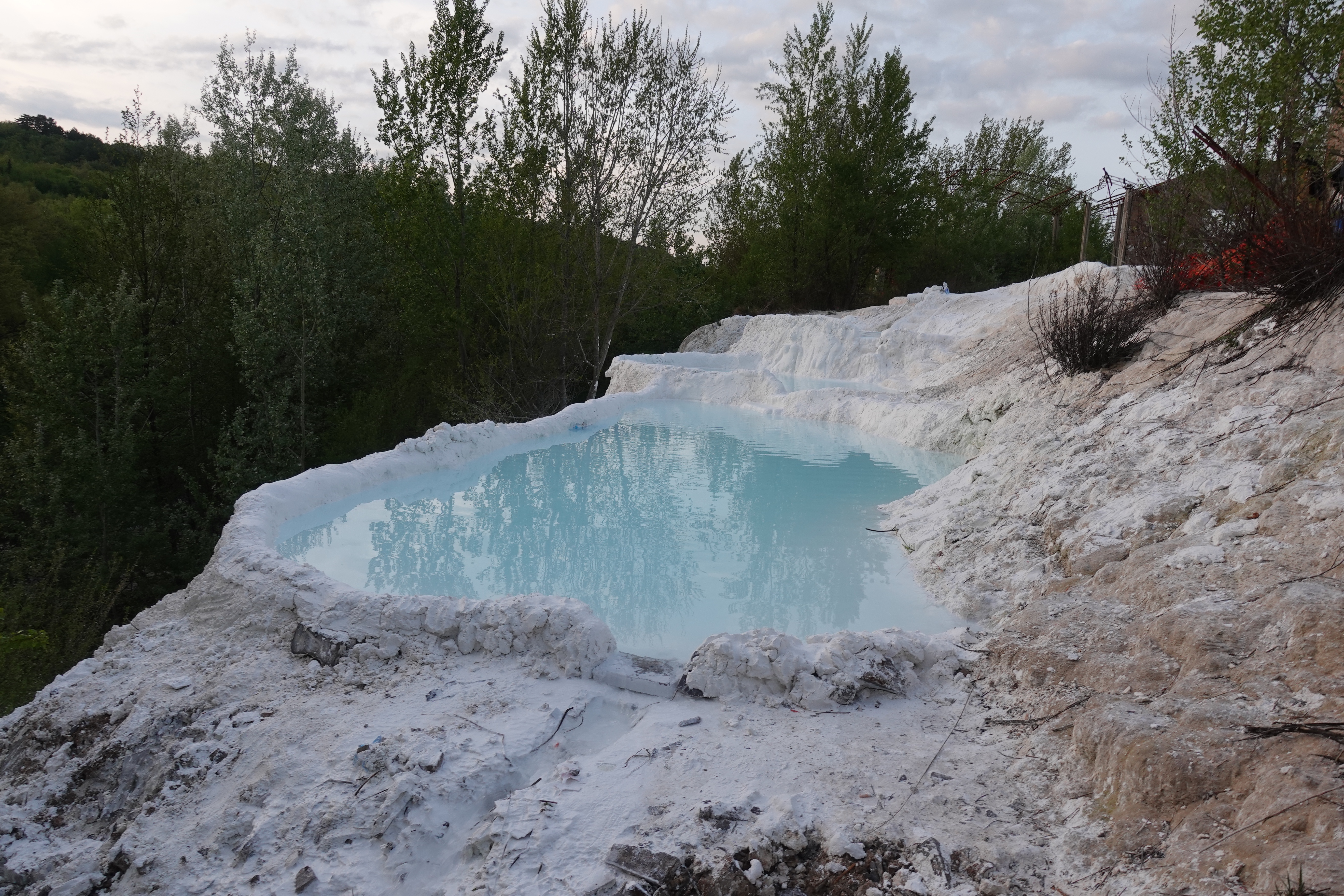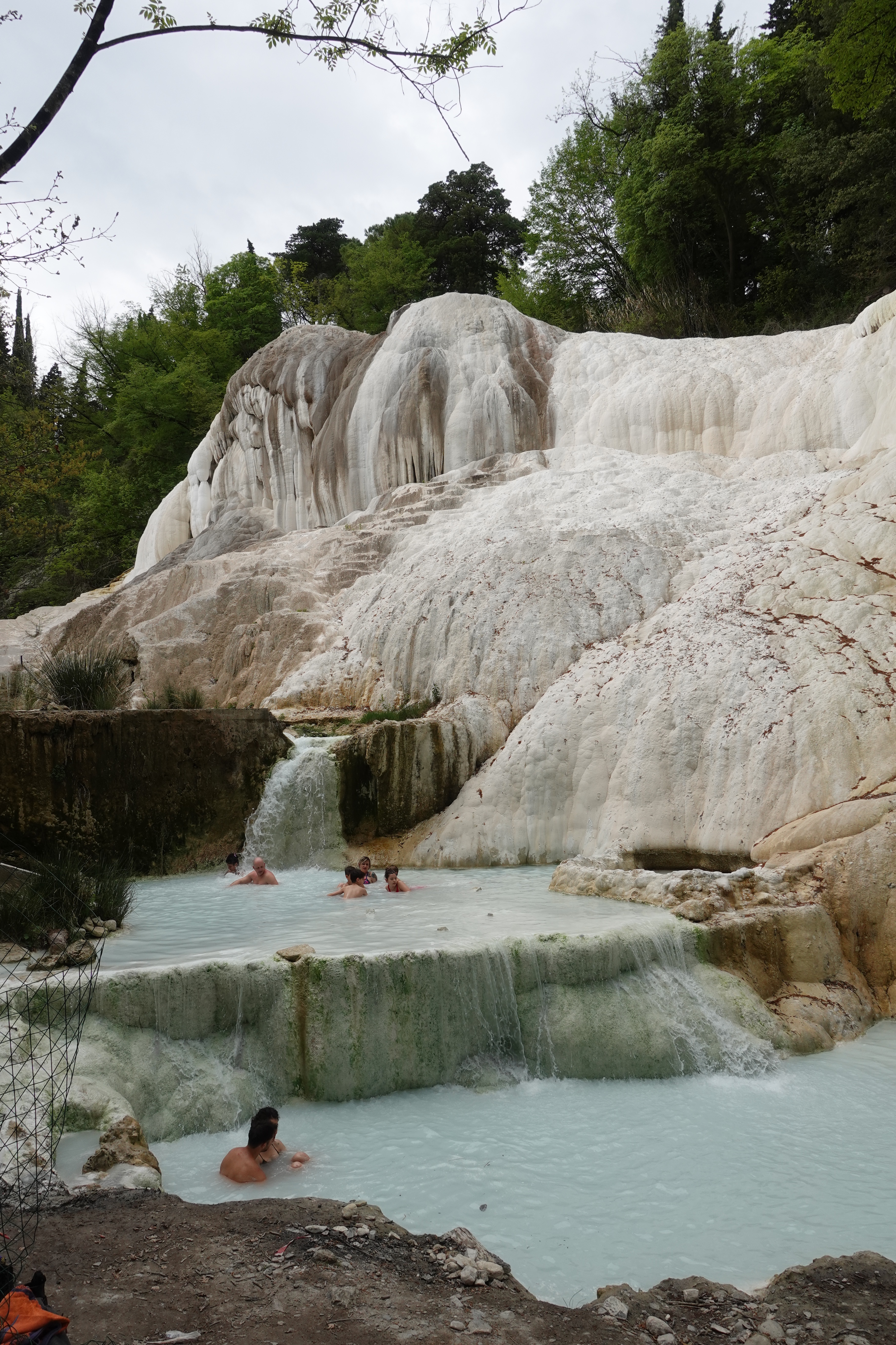 Bagno San Filippo ist ein winziger Ort, der (natürlich) auf einem Berg liegt. Dort sprudeln ein paar heiße Thermalquellen und man kann in dem bis zu 52 C heißen Wasser liegen und sich Muskeln und Knochen erwärmen lassen. Es gibt hier in der Gegend mehrere von diesen heißen Quellen und manche sind frei zugänglich. Wir sitzen sehr entspannt in einem der heißen Becken unter freiem Himmel. Total irre: ein Pool mit heißem Wasser und Bergpanorama. Das ganze kostet keinen Cent und wir sinken wohlig erwärmt und entspannt danach in unser Bett.