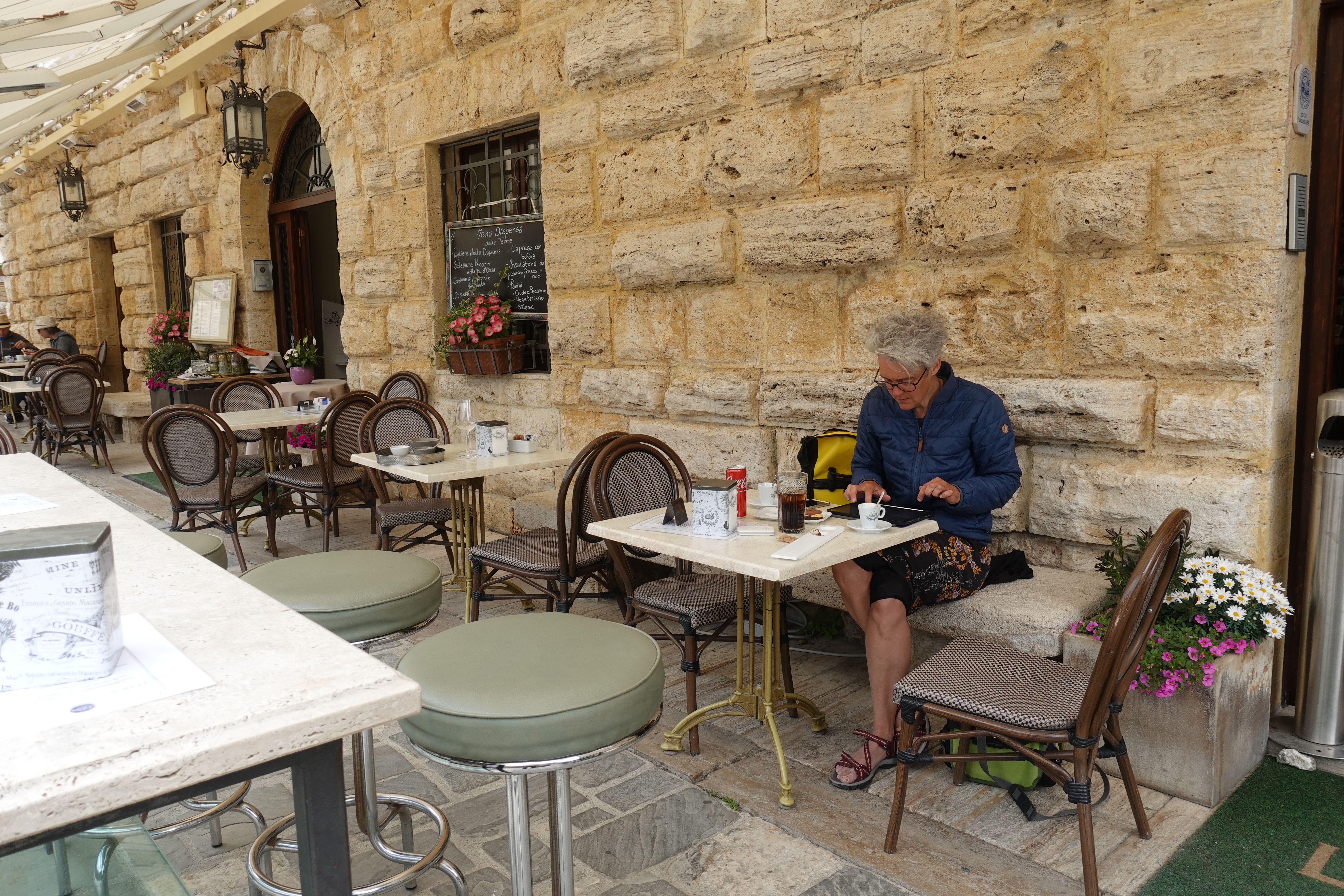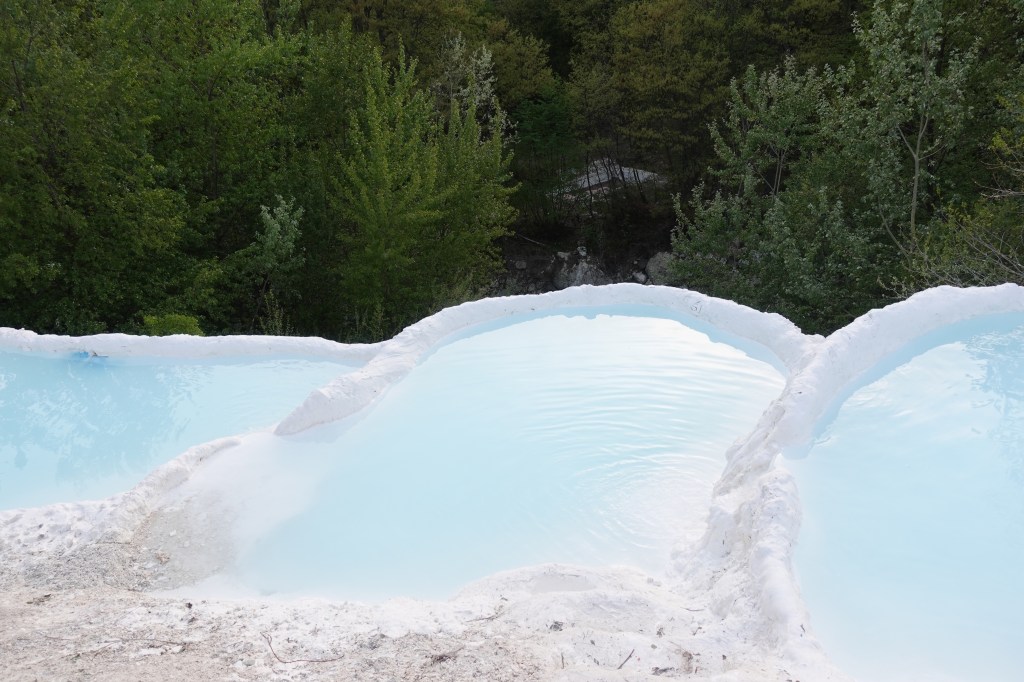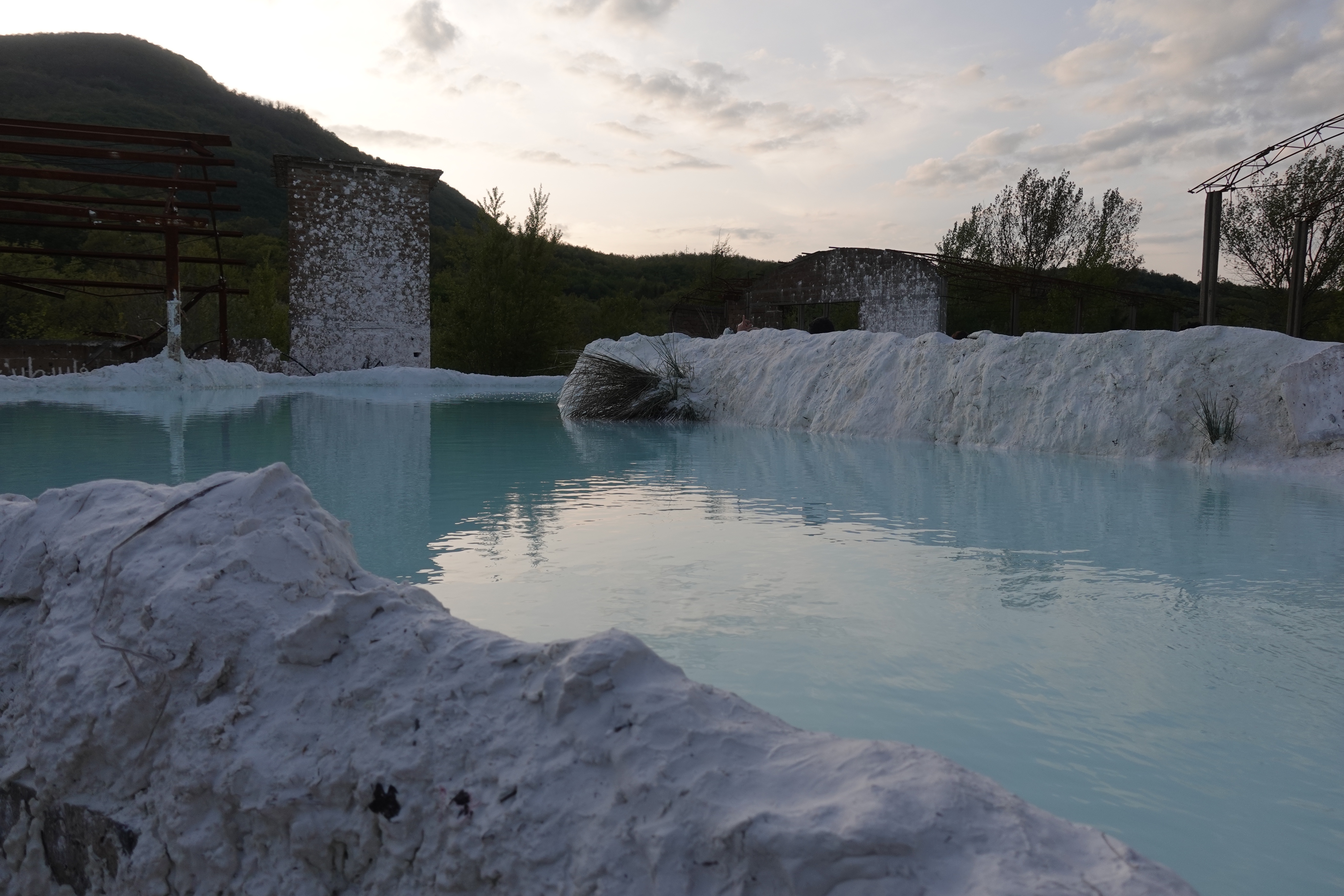 Bagno San Filippo ist ein winziger Ort, der (natürlich) auf einem Berg liegt. Dort sprudeln ein paar heiße Thermalquellen und man kann in dem bis zu 52 C heißen Wasser liegen und sich Muskeln und Knochen erwärmen lassen. Es gibt hier in der Gegend mehrere von diesen heißen Quellen und manche sind frei zugänglich. Wir sitzen sehr entspannt in einem der heißen Becken unter freiem Himmel. Total irre: ein Pool mit heißem Wasser und Bergpanorama. Das ganze kostet keinen Cent und wir sinken wohlig erwärmt und entspannt danach in unser Bett.