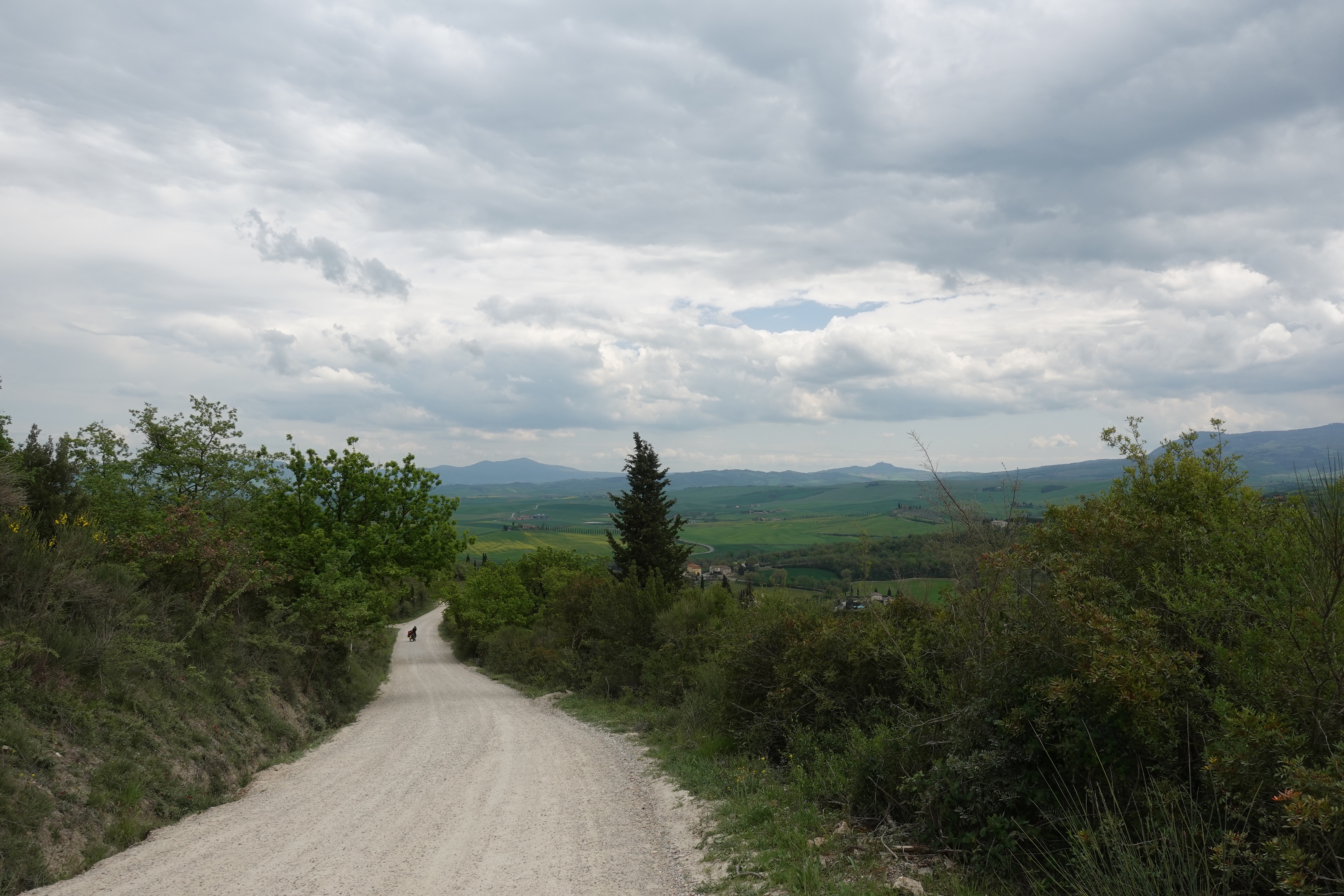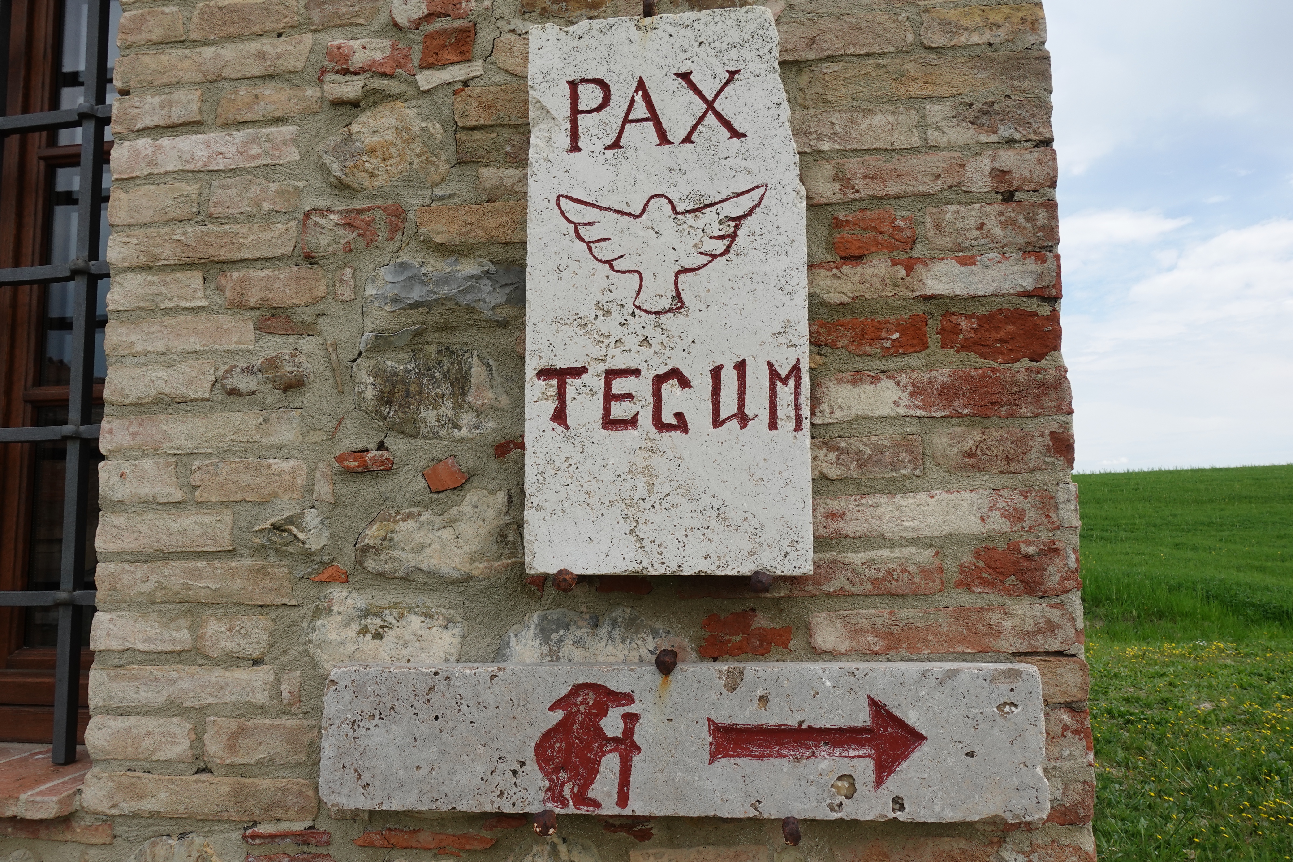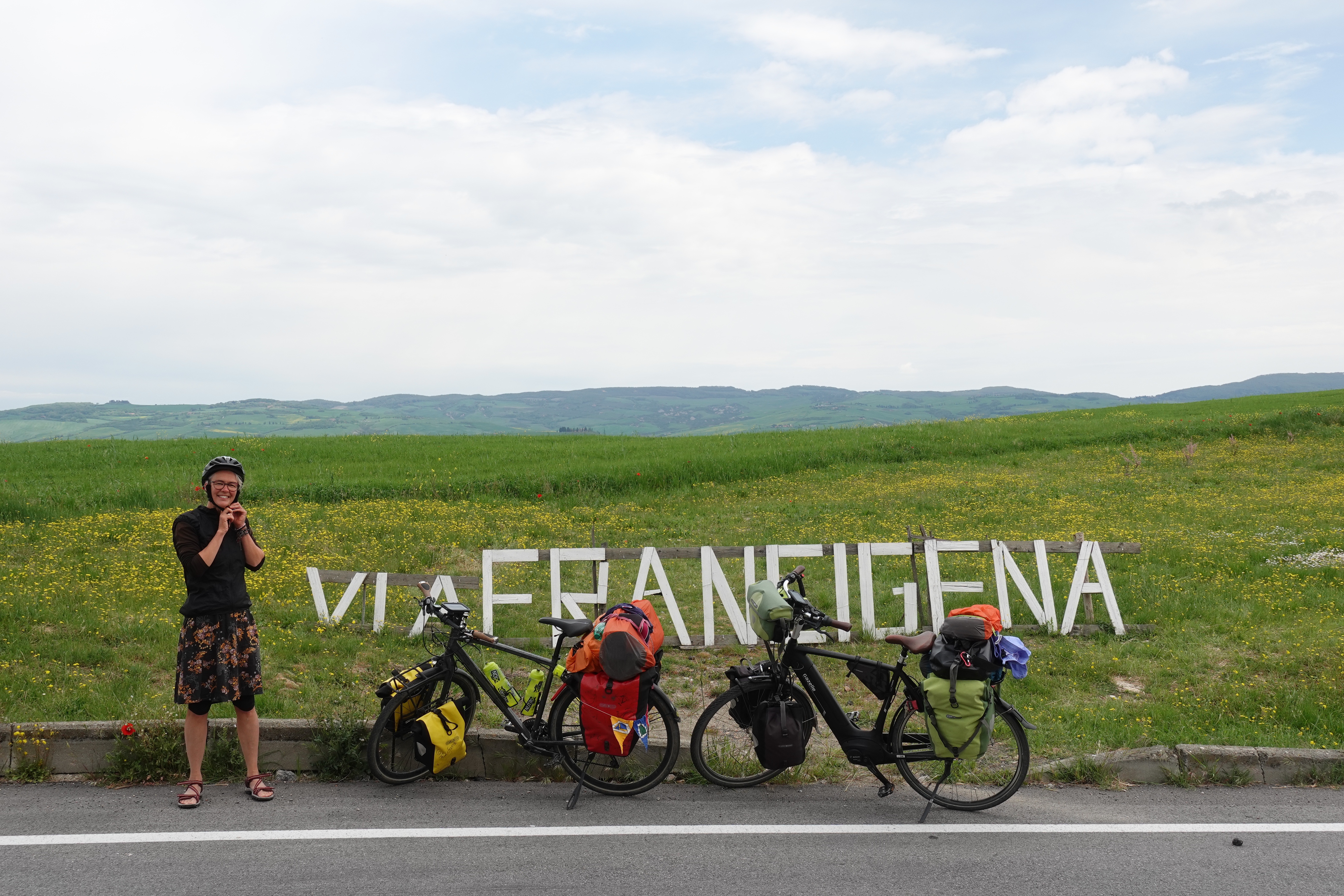 Wir fahren zum Teil auf der Via Francigena. Dies ist ein Wander- und ehemaliger Pilgerweg, der von Canterbury bis nach Rom führt. Uns kommen viele Wanderer und Radfahrer entgegen, die sich auf dem Weg nach Rom befinden. Allerorten treffen wir auf Hinweis- und Wegschilder. So werden wir durch die sanften und grünen Hügel der Toskana geleitet, überall sehen wir die typischen Zypressen, Weinberge und die auf den Bergen liegenden Dörfer und Anwesen. Wir stellen fest, dass die „sanften Hügel“ der Toskana überhaupt nicht sanft, sondern sehr herausfordernd daherkommen. Steigungen von 15% sind nicht selten, sie machen nicht nur keinen Spaß, sie tun auch weh! Irgendwo lesen wir, dass die Strecke zwischen Rom und Siena eine Fahrradherausforderung ist. Stimmt, das finden wir auch. Gut, dass wir nach Bagno San Filippo fahren.