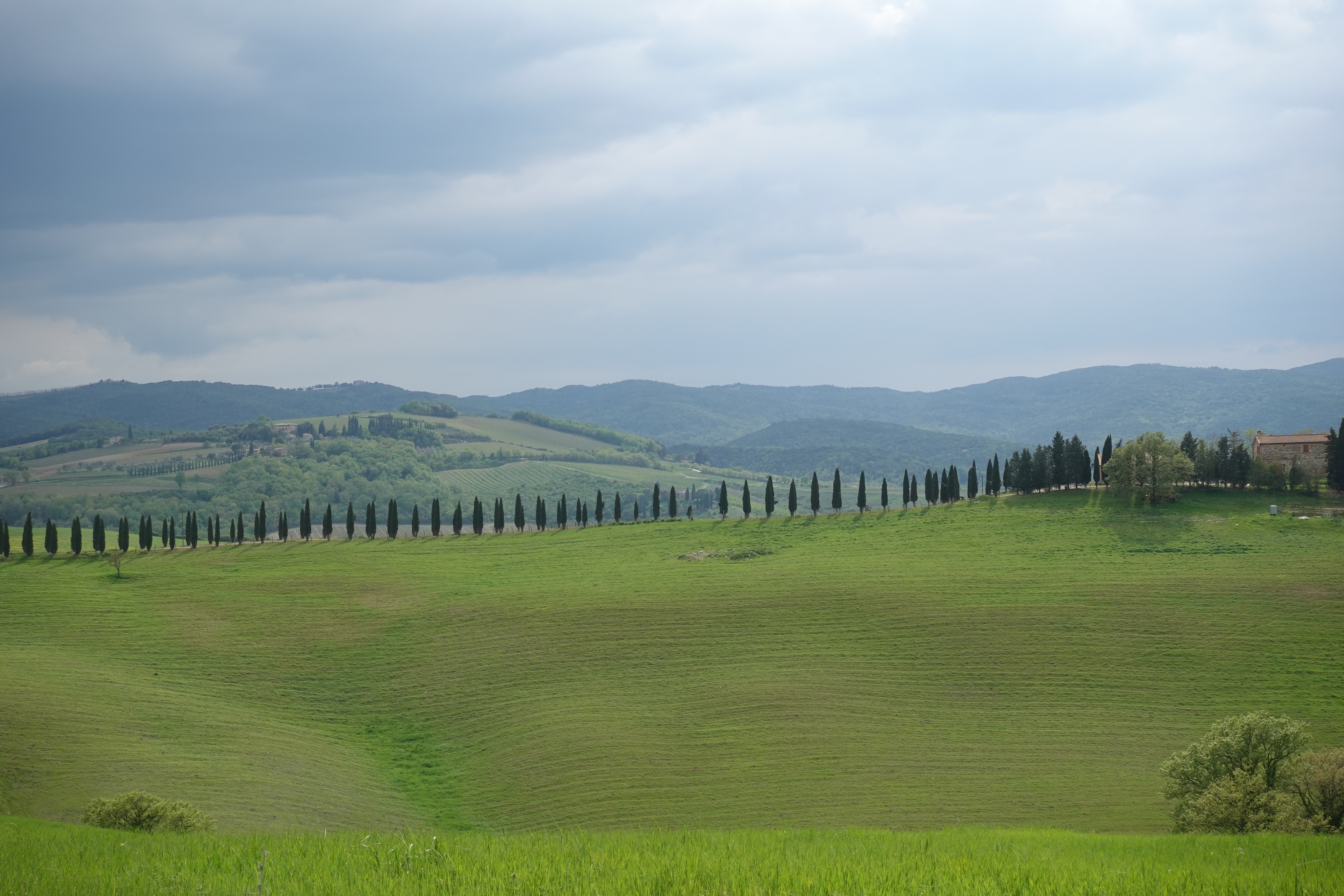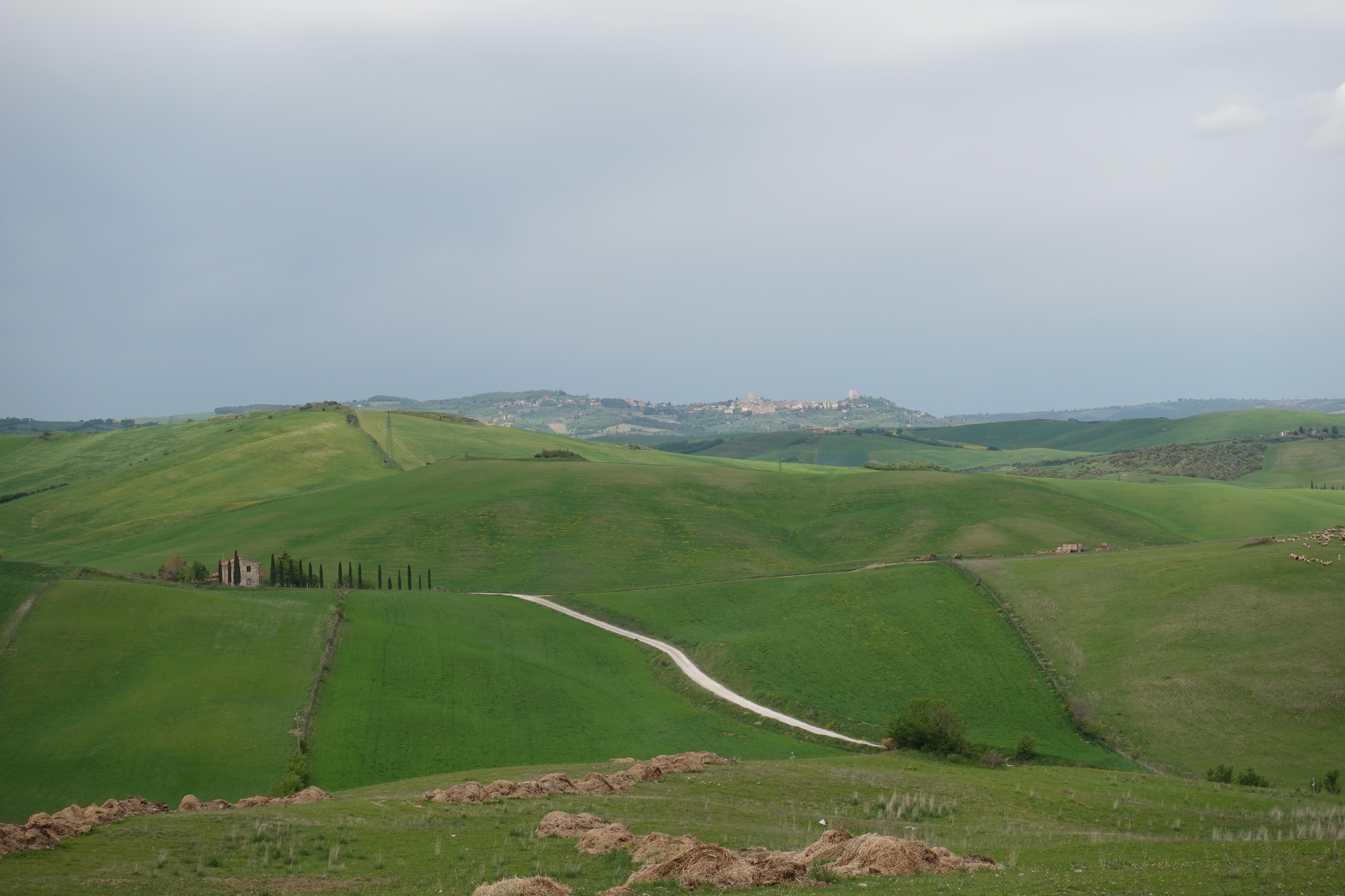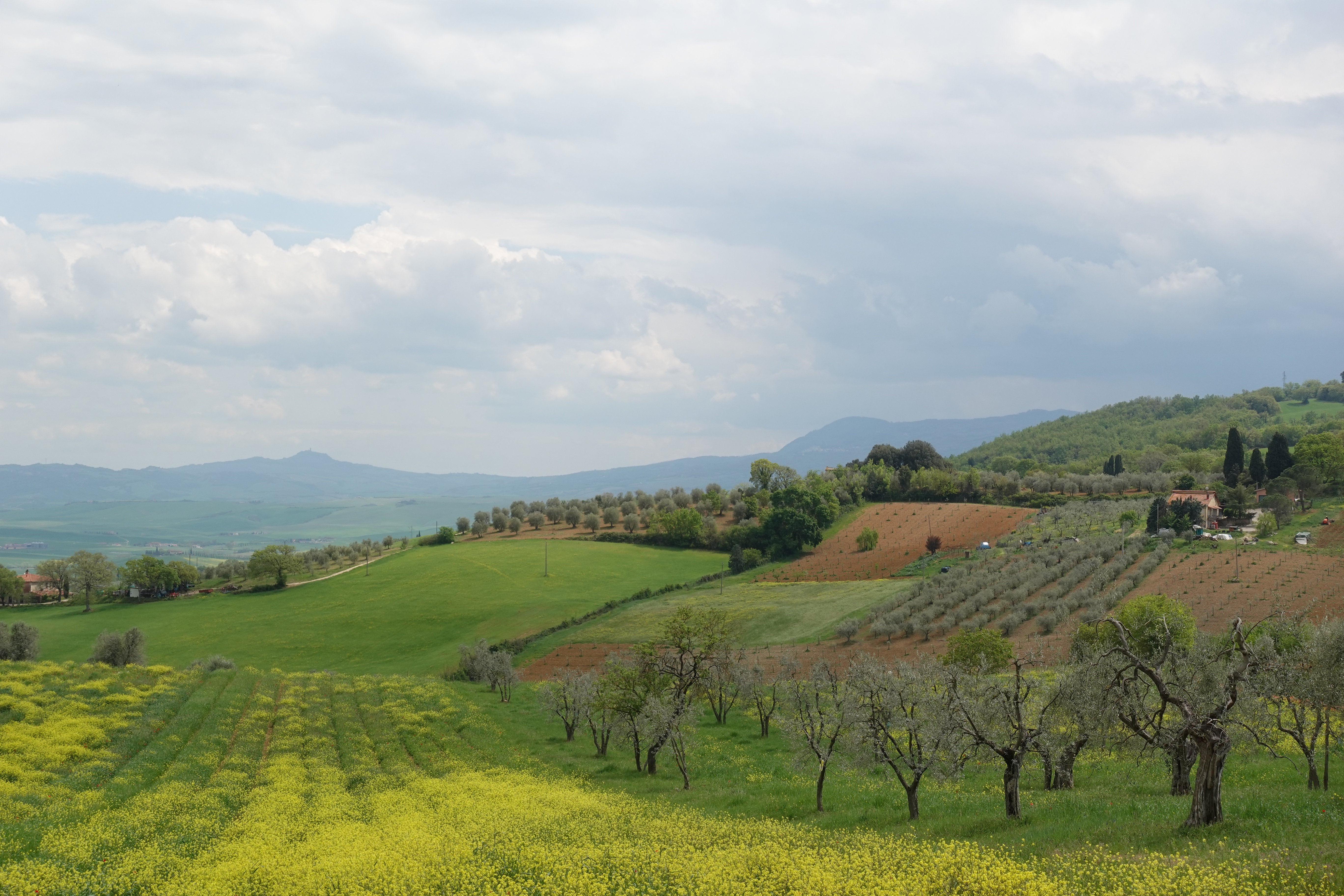 Wir fahren zum Teil auf der Via Francigena. Dies ist ein Wander- und ehemaliger Pilgerweg, der von Canterbury bis nach Rom führt. Uns kommen viele Wanderer und Radfahrer entgegen, die sich auf dem Weg nach Rom befinden. Allerorten treffen wir auf Hinweis- und Wegschilder. So werden wir durch die sanften und grünen Hügel der Toskana geleitet, überall sehen wir die typischen Zypressen, Weinberge und die auf den Bergen liegenden Dörfer und Anwesen. Wir stellen fest, dass die „sanften Hügel“ der Toskana überhaupt nicht sanft, sondern sehr herausfordernd daherkommen. Steigungen von 15% sind nicht selten, sie machen nicht nur keinen Spaß, sie tun auch weh! Irgendwo lesen wir, dass die Strecke zwischen Rom und Siena eine Fahrradherausforderung ist. Stimmt, das finden wir auch. Gut, dass wir nach Bagno San Filippo fahren.