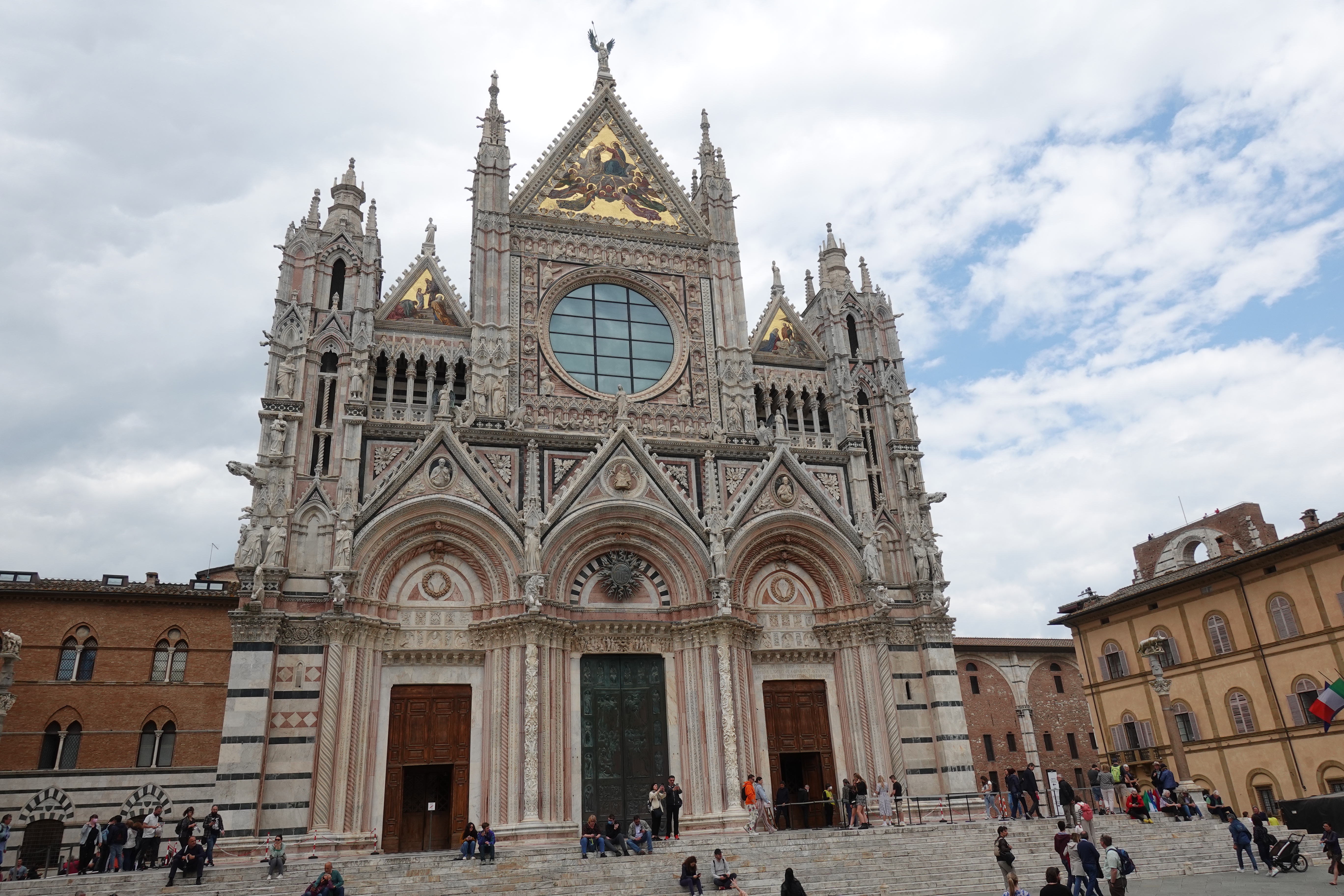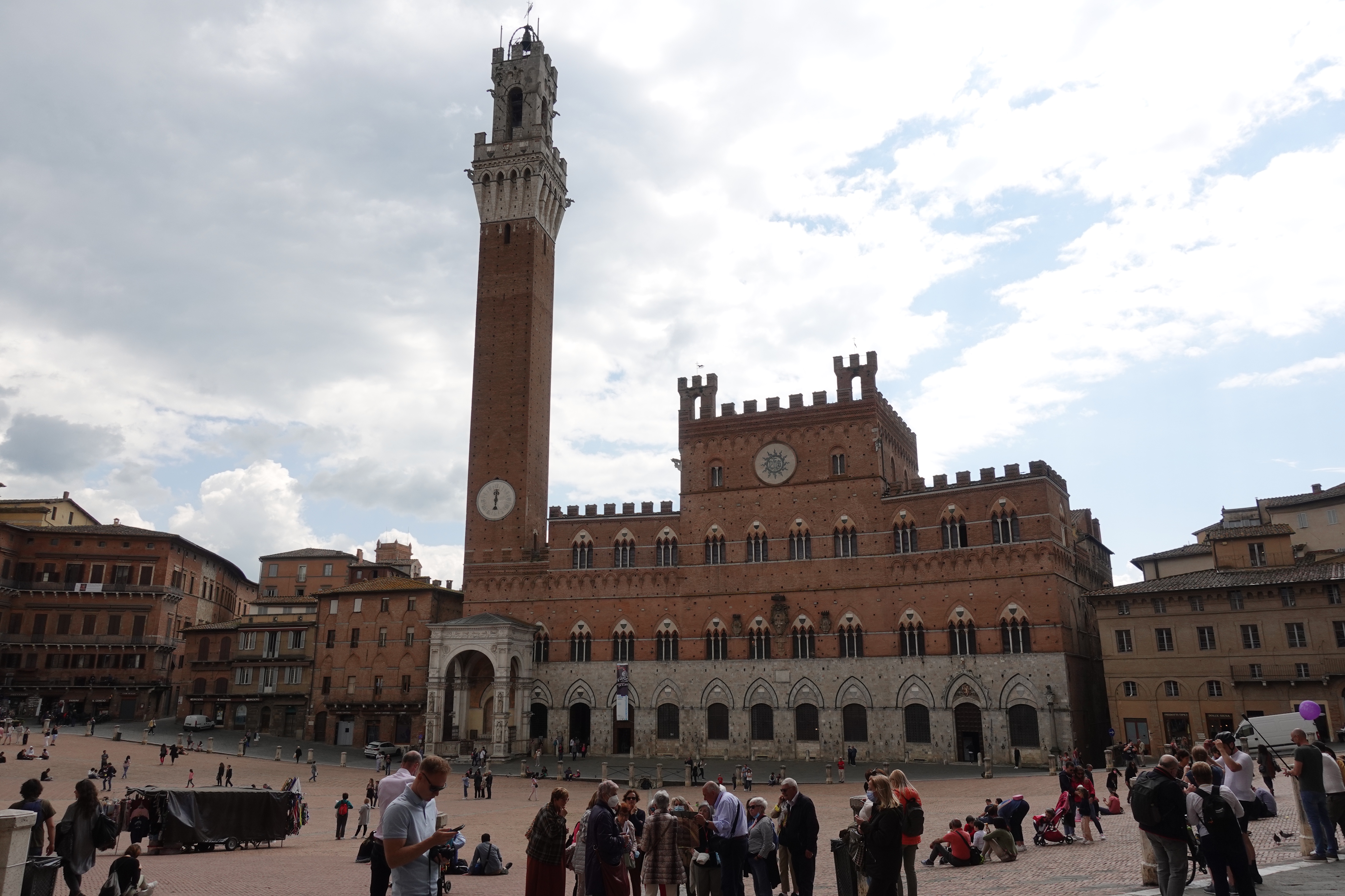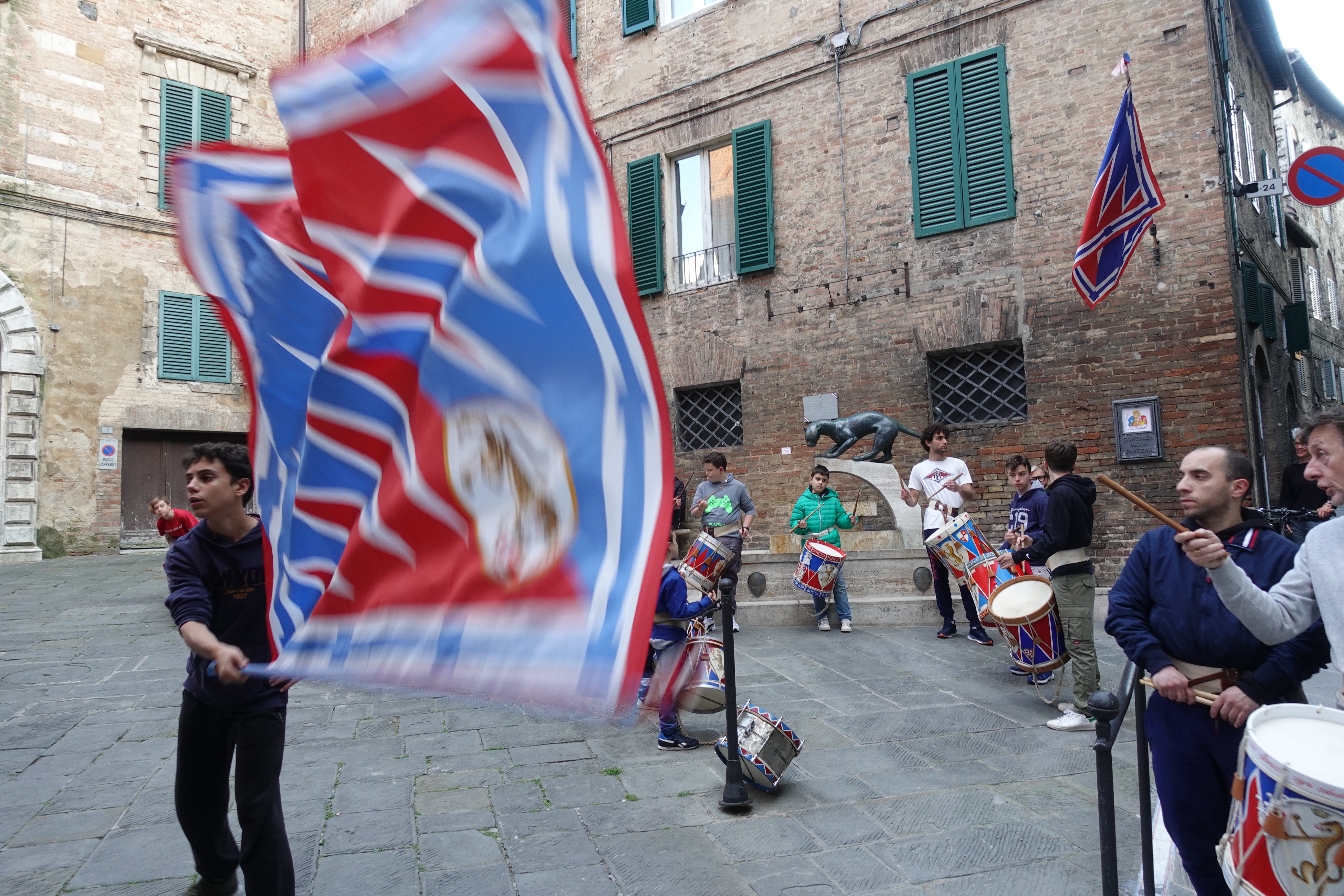 Nach der herrlichen Erfahrung im heißen Wasser gelangen wir nach Siena und klar: die Stadt liegt auf einem Berg, wie sollte es auch anders sein…. Nachdem wir uns und unser Gepäck auf den Rädern die Steigung hochgewuchtet haben, sind wir ordentlich erledigt. Die Beine schmerzen, die Gelenke ächzen, wir sind platt! Aber Siena ist nett zu uns und wir entdecken viele spannende Dinge. An jedem Haus sind Fahnenhalterungen zu finden, die die Fahnen der jeweiligen Stadtteile (Contrade) halten, wenn das berühmte Pferderennen Palio stattfindet. Wir kommen an einem Platz vorbei, auf dem die Contrade der Panther gerade trommeln und Fahnen schwenken übt. Ein sehr ernste Angelegenheit, bei der alle Altersstufen mitmachen.