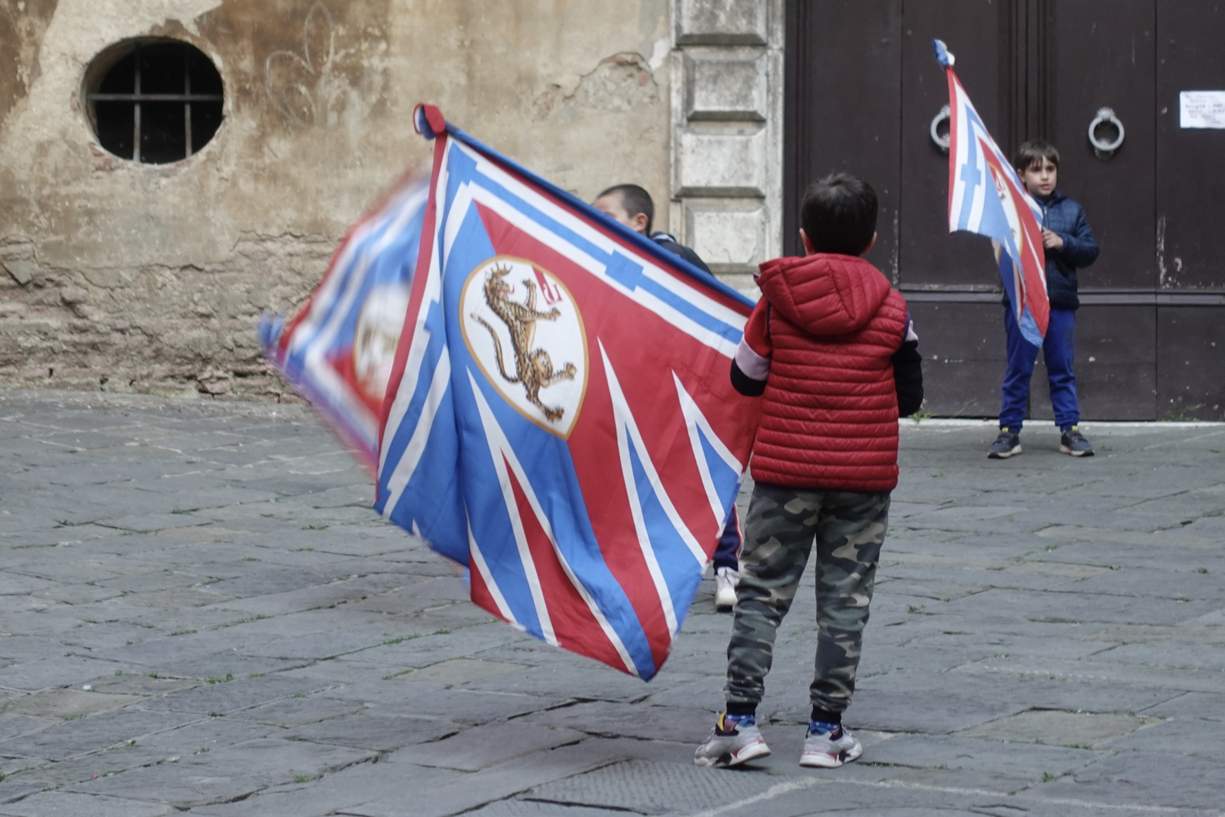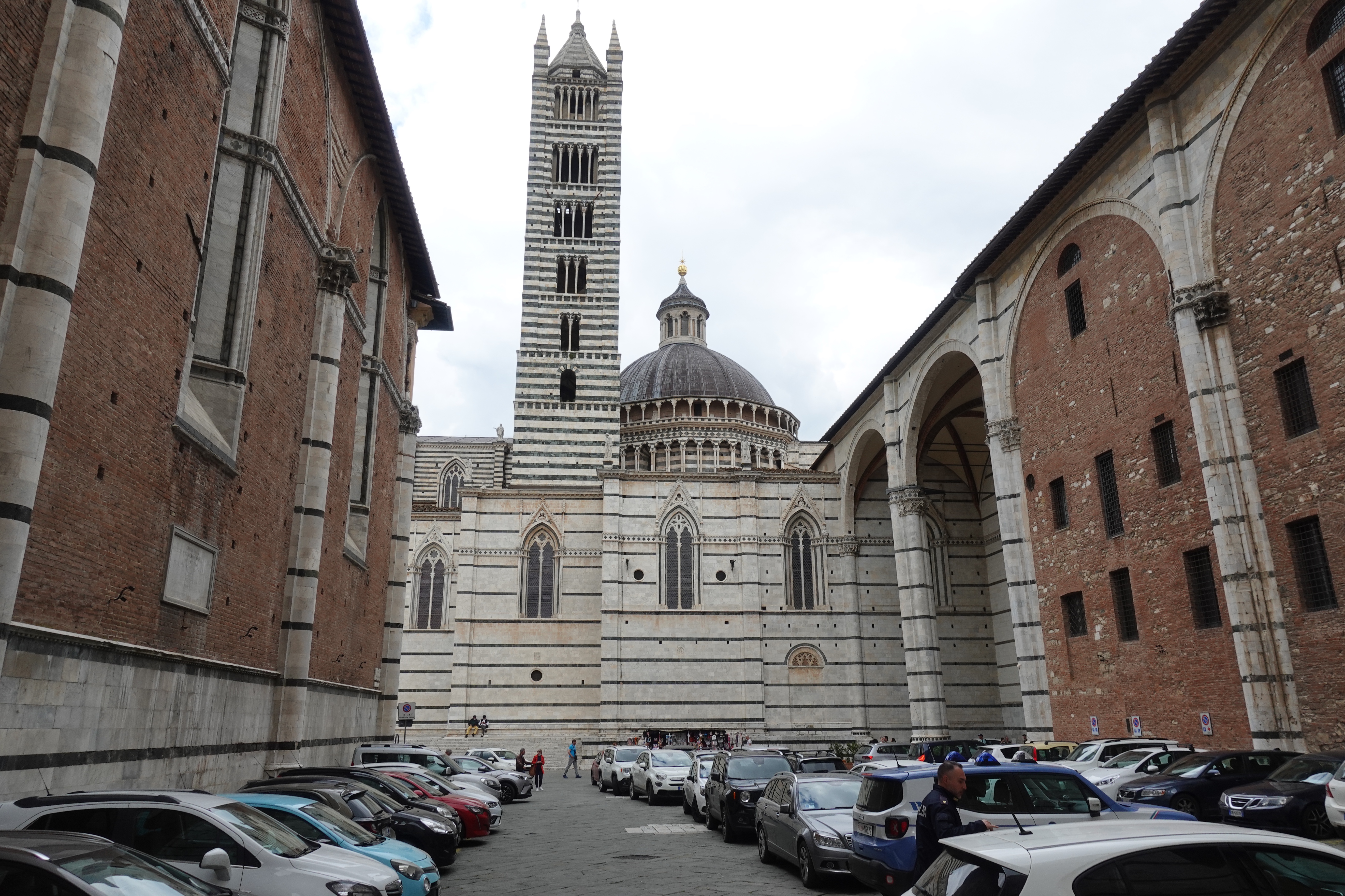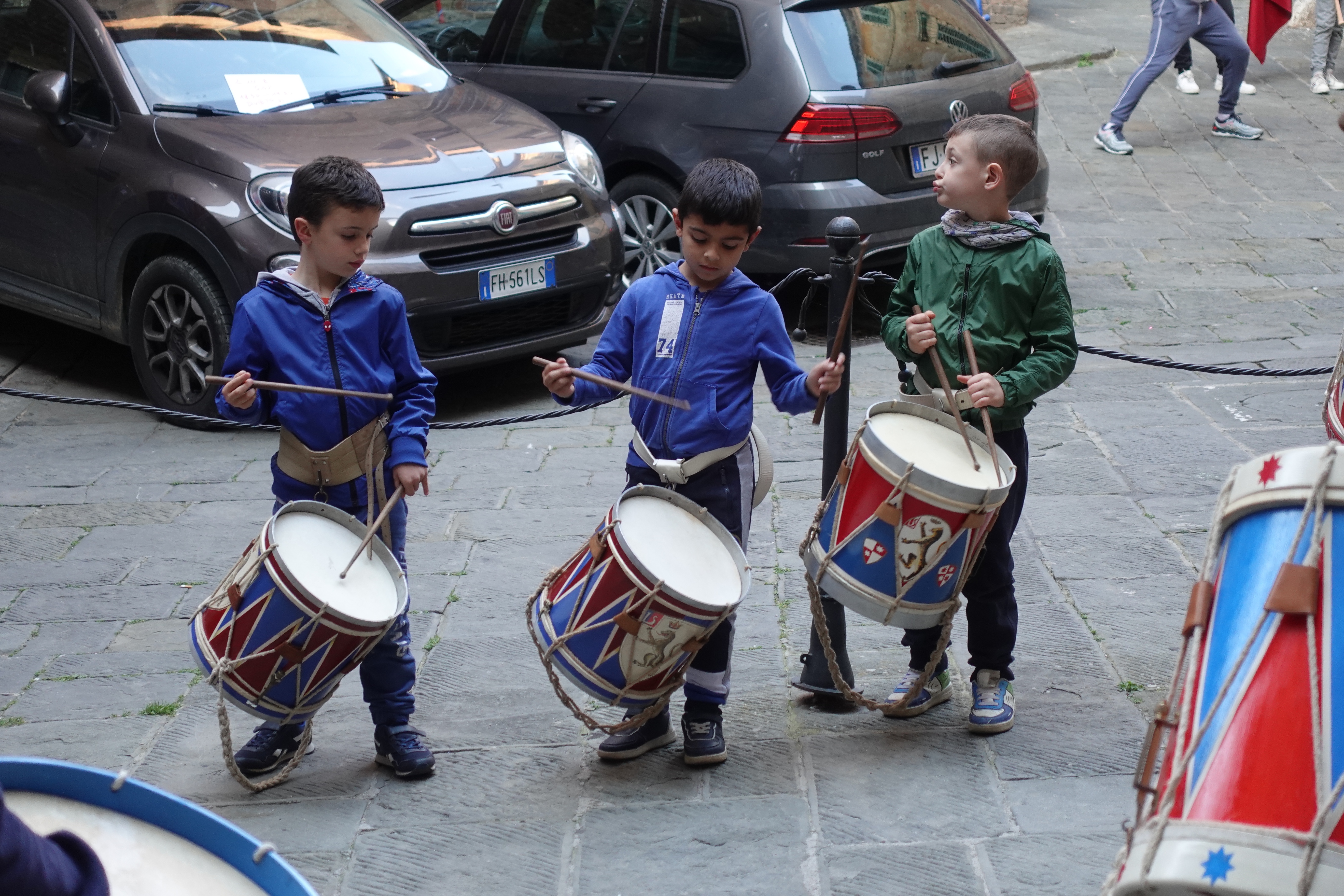 Nach der herrlichen Erfahrung im heißen Wasser gelangen wir nach Siena und klar: die Stadt liegt auf einem Berg, wie sollte es auch anders sein…. Nachdem wir uns und unser Gepäck auf den Rädern die Steigung hochgewuchtet haben, sind wir ordentlich erledigt. Die Beine schmerzen, die Gelenke ächzen, wir sind platt! Aber Siena ist nett zu uns und wir entdecken viele spannende Dinge. An jedem Haus sind Fahnenhalterungen zu finden, die die Fahnen der jeweiligen Stadtteile (Contrade) halten, wenn das berühmte Pferderennen Palio stattfindet. Wir kommen an einem Platz vorbei, auf dem die Contrade der Panther gerade trommeln und Fahnen schwenken übt. Ein sehr ernste Angelegenheit, bei der alle Altersstufen mitmachen.