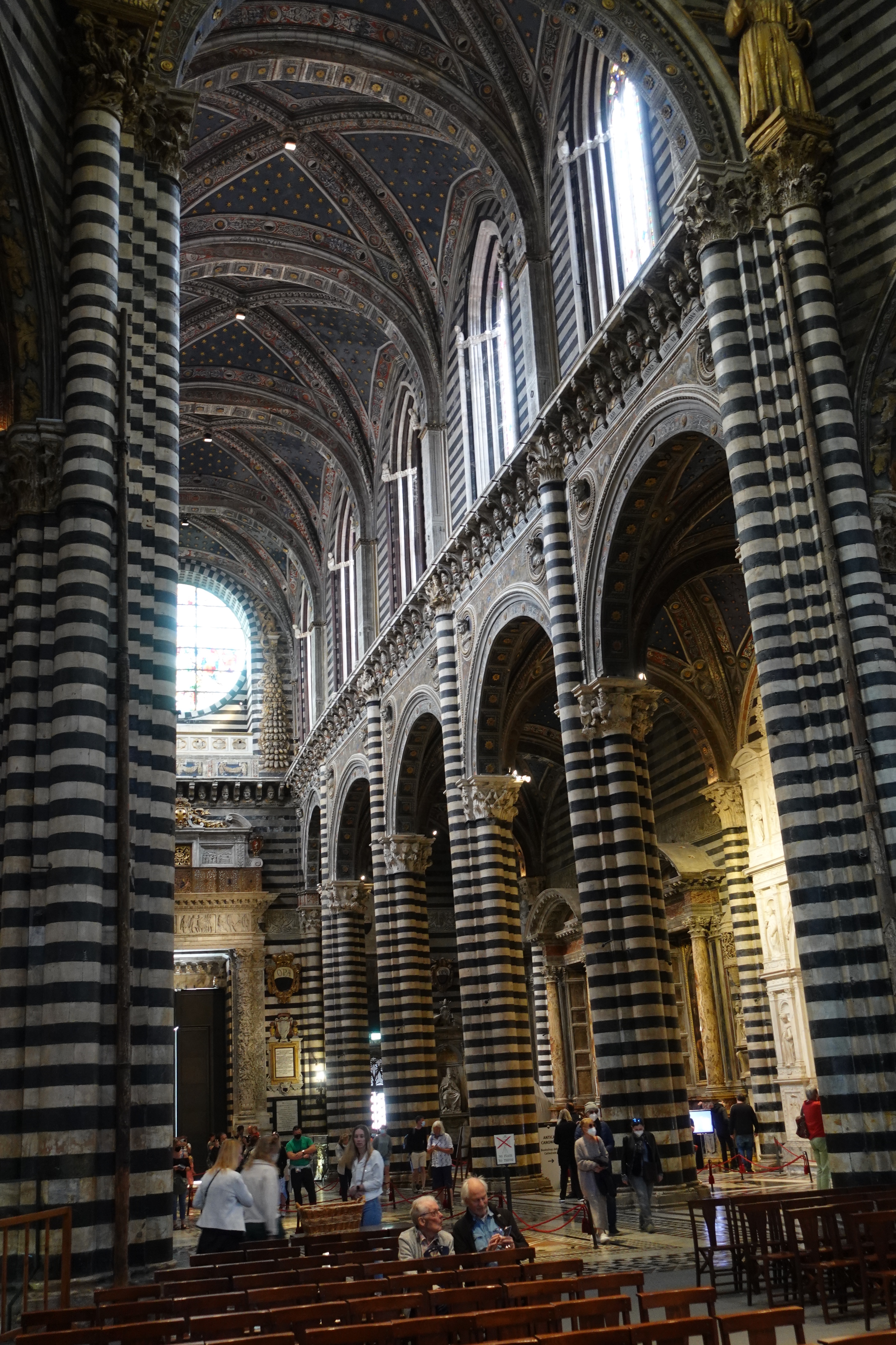 Natürlich schauen wir auch den berühmten Dom an. Mit seiner Streifenoptik sieht der Glockenturm ein wenig wie ein Sträfling aus. Kirchen sind überhaupt verrückt und spannend. Wir finden immer wieder Dinge, mit denen wir nicht rechnen und die uns erstaunen und lachen lassen. Z.B. sind die Reliquien der heiligen Katharina von Siena in der Basilika in Siena: ihr Kopf und ein Finger (warum nur ein Finger?) wurden drei Jahre nach ihrem Tod in ihre Geburtsstadt gebracht. Der Rest von ihr ist in Rom begraben: kirchlich abgesegnete Leichenfledderei! Auch so manche Darstellung von Heiligen in den Kirchen ist recht drastisch.