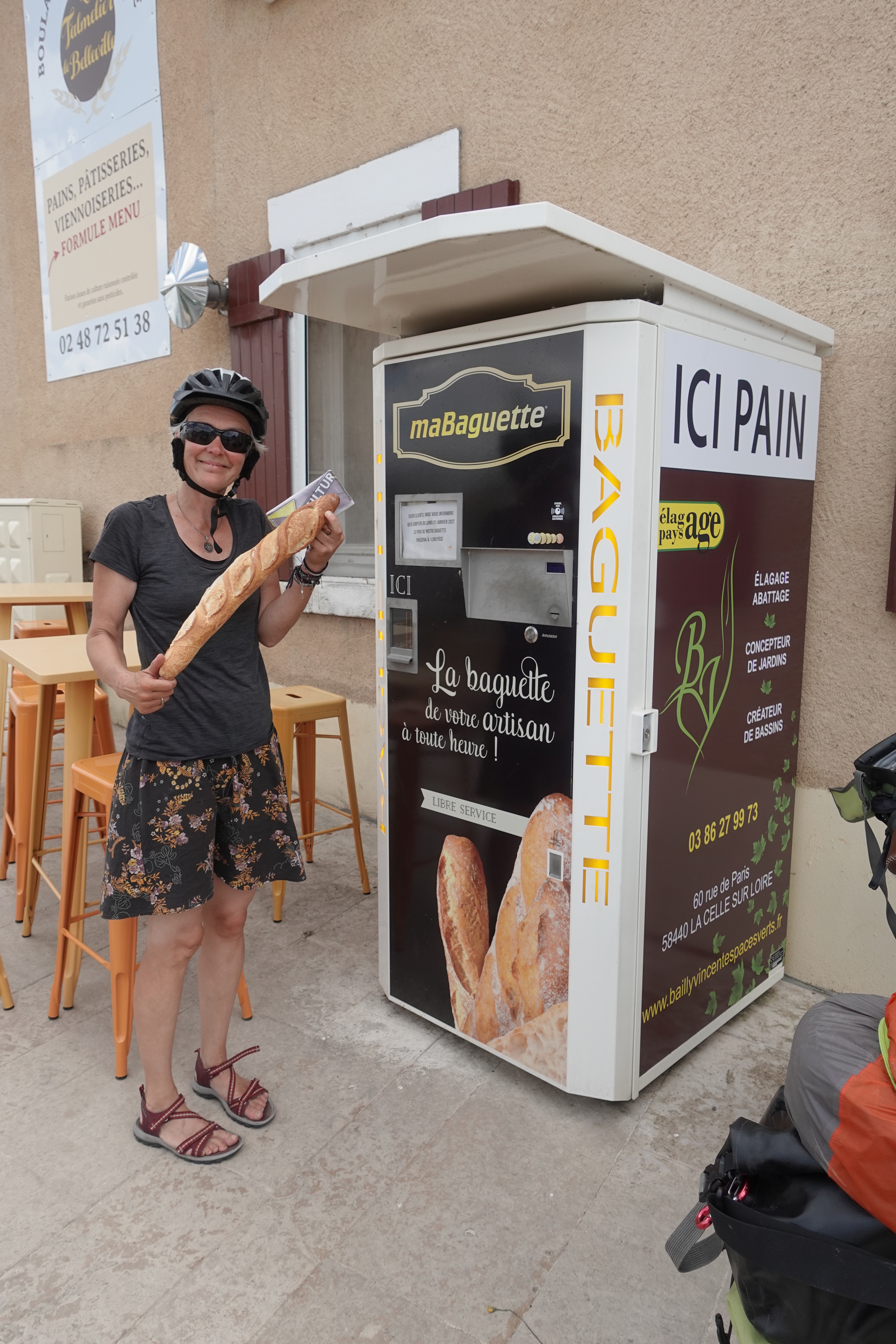 Baguette ist in Frankreich ja das Brot schlechthin. Wir staunen nicht schlecht, als wir an einem Baguetteautomaten vorbeikommen. Natürlich probieren wir das aus und es klappt prima, allerdings ist es auch etwas lieblos, wenn das Baguette mit einem Klonk in den Auswurfschacht fällt. Es schmeckt, wie es schmecken soll und in den klitzekleinen Gemeinden finden wir diese Automaten häufig. Das ist zwar praktisch, aber wir vermissen doch die kleinen Boulangerien, deren Fehlen solche Maschinen notwendig macht.