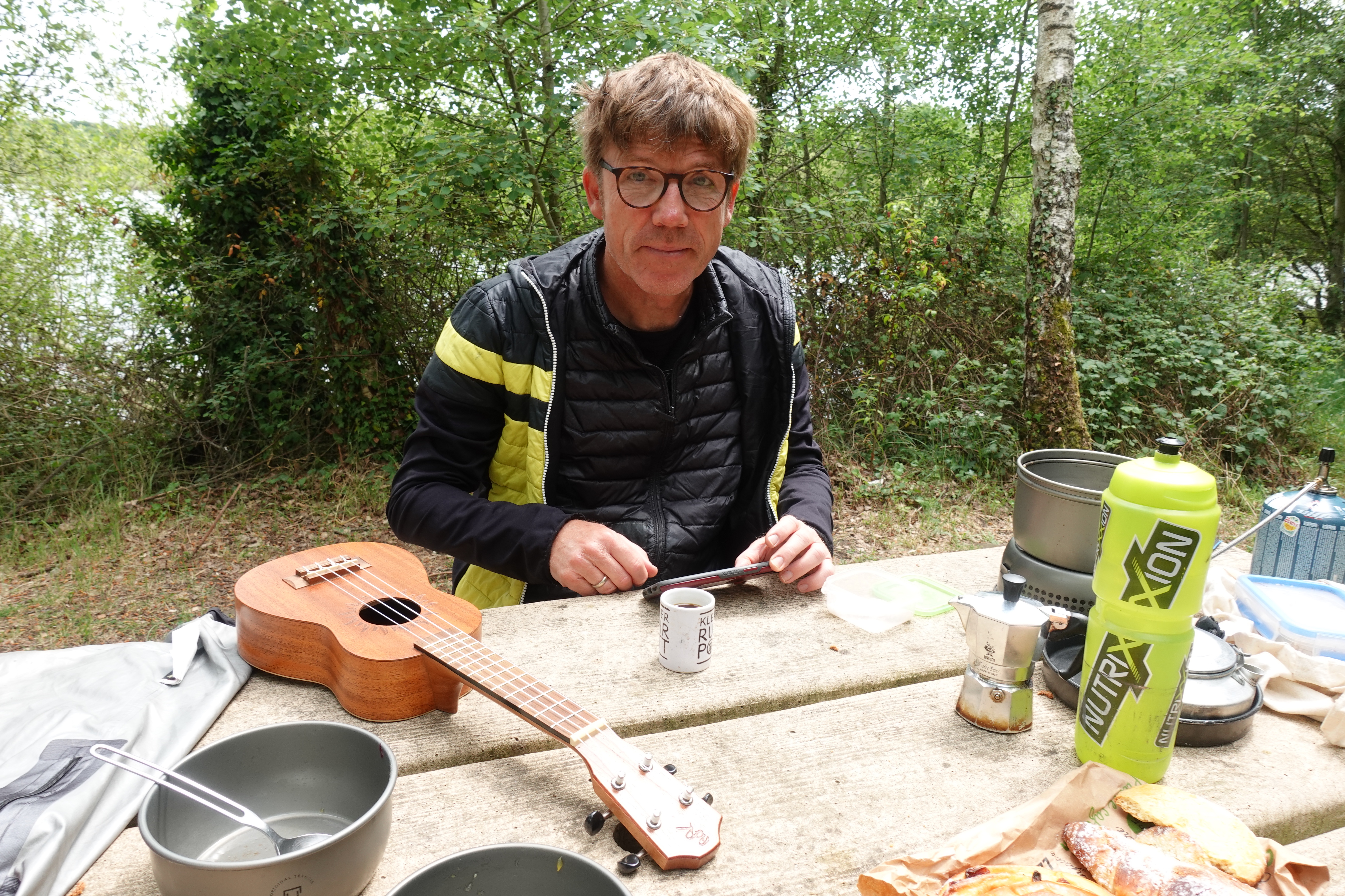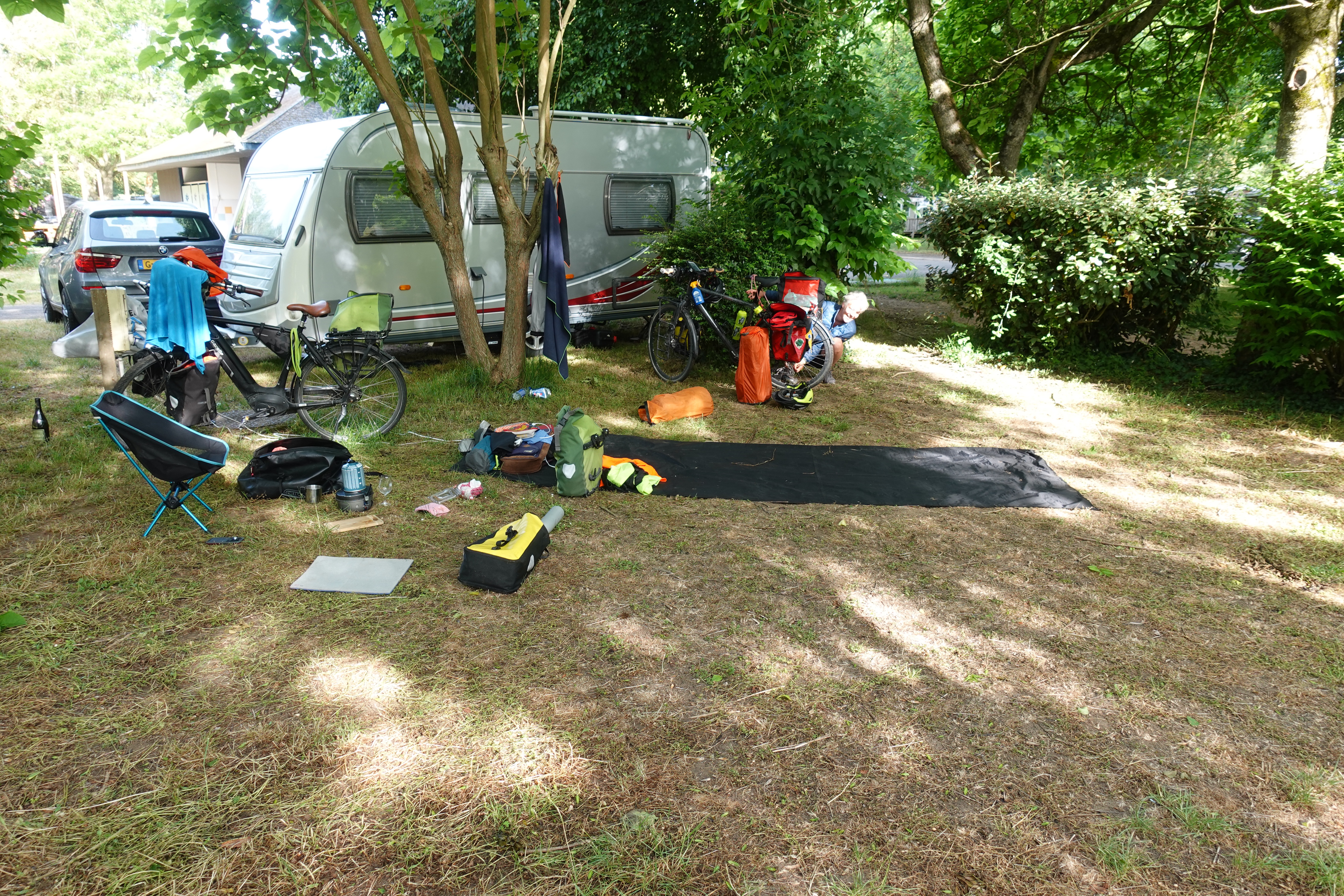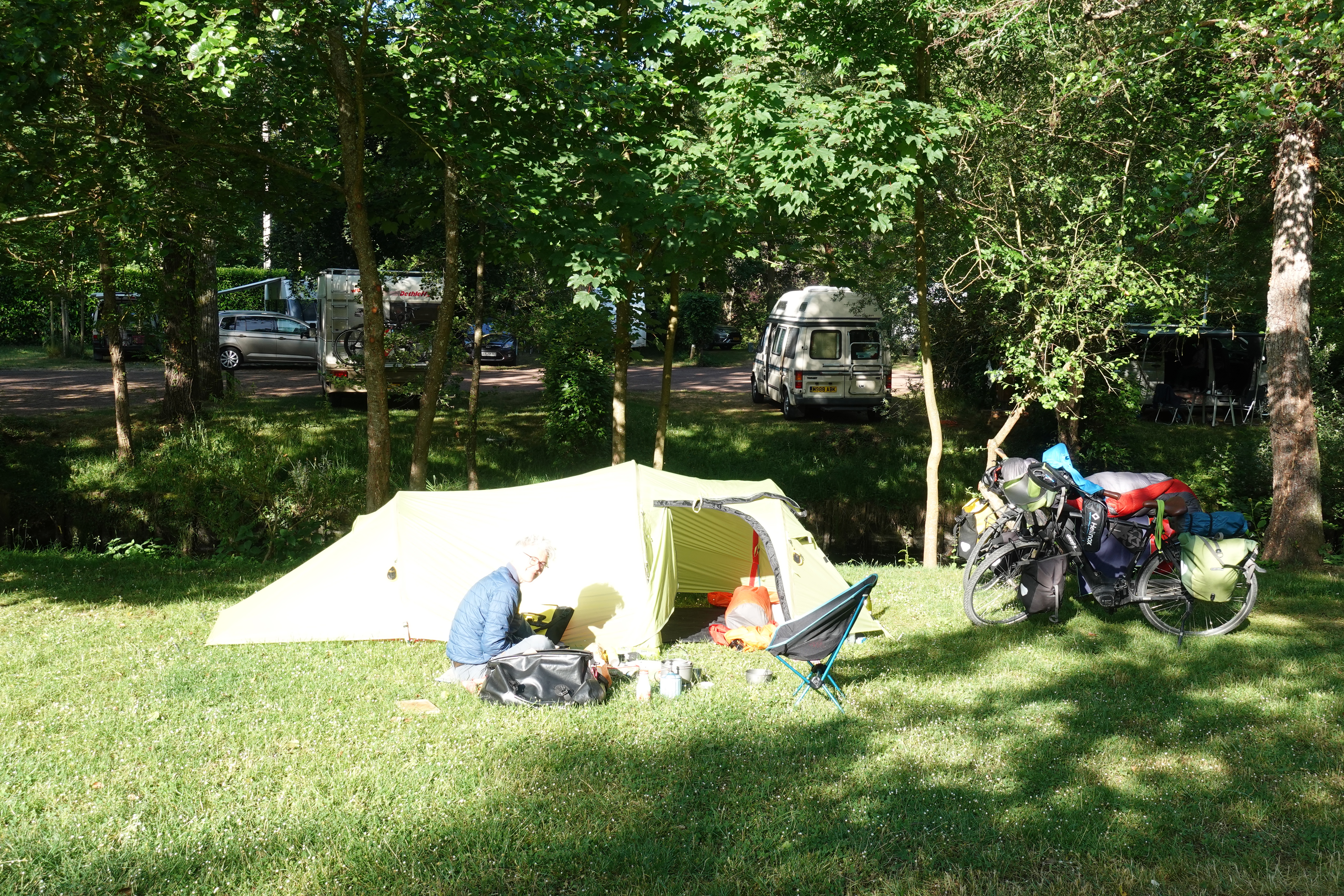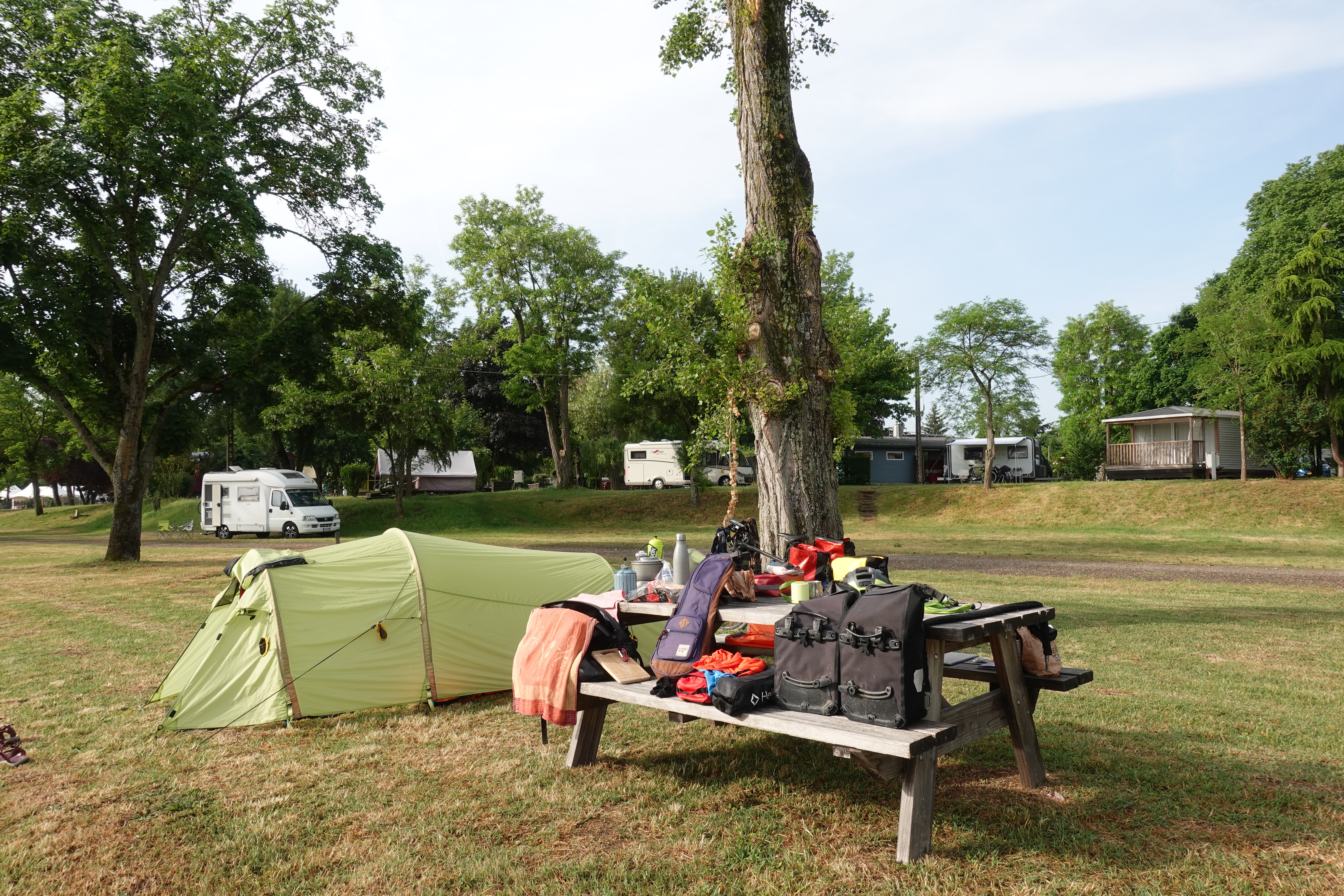 Wir sind nicht mehr in der Nebensaison unterwegs. Die Campingplätze werden voller und voller. Mit unserem Zelt brauchen wir keine Sorge zu haben, dass wir keinen Platz bekommen, ein kleines Fleckchen findet sich immer. Allerdings fühlen wir uns ein wenig wie die letzten ihrer Art, denn meist sind wir das einzige Zelt und stehen umgeben von Wohnmobilen. Aber so sind wir mit unseren Rädern auch eine kleine Attraktion und werden schnell in Gespräche verwickelt. Unsere Musik können wir so aber nicht unbemerkt proben. Wenn wir üben, kommt schnell jemand aus der Hecke gesprungen und fragt ob er filmen darf. Aus den anderen Campern kommt Applaus und – schwups – schon gibt es wieder viele schöne Begegnungen und Gespräche mit Reisetipps, Erzählungen und selbstgemachtem Schnaps.