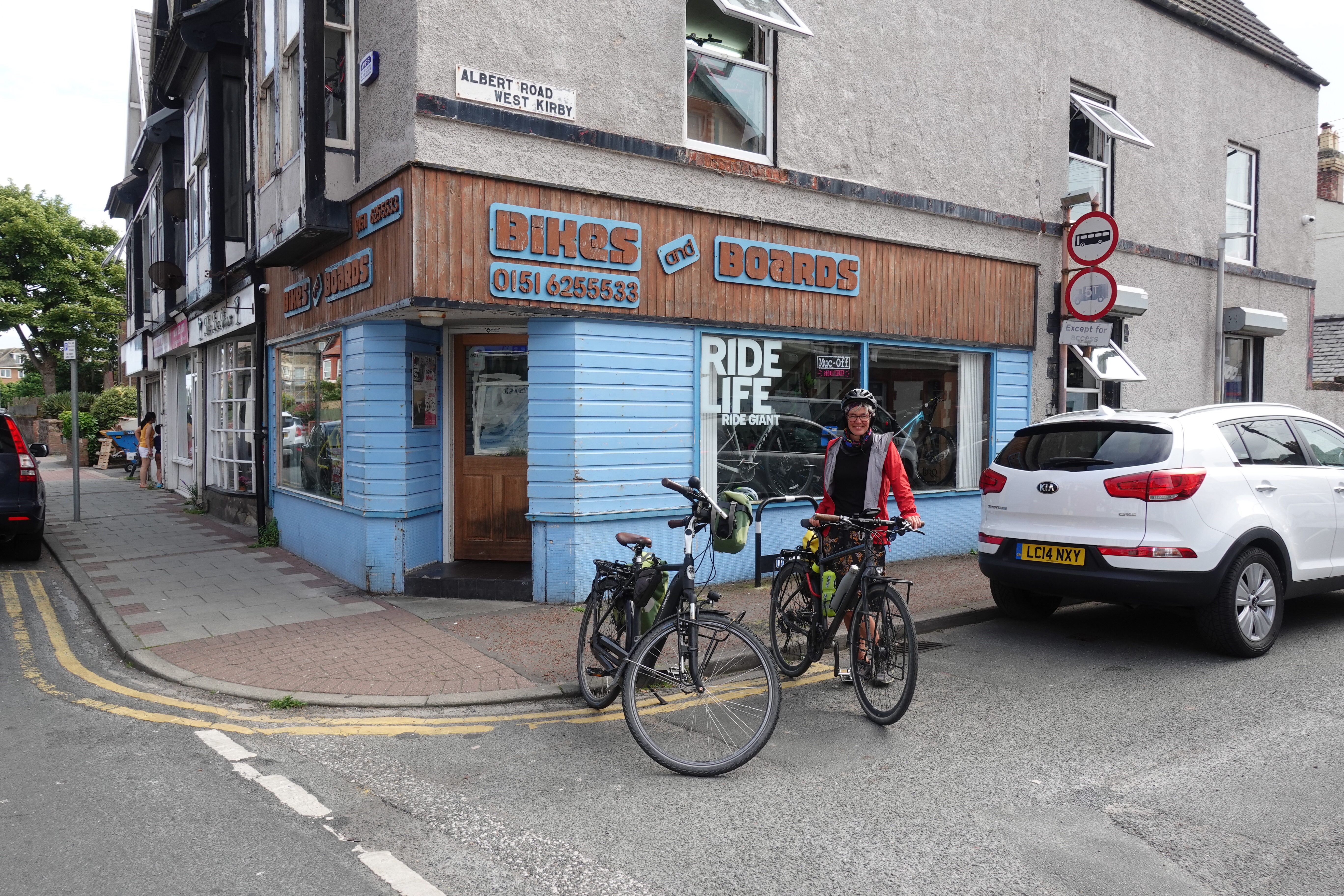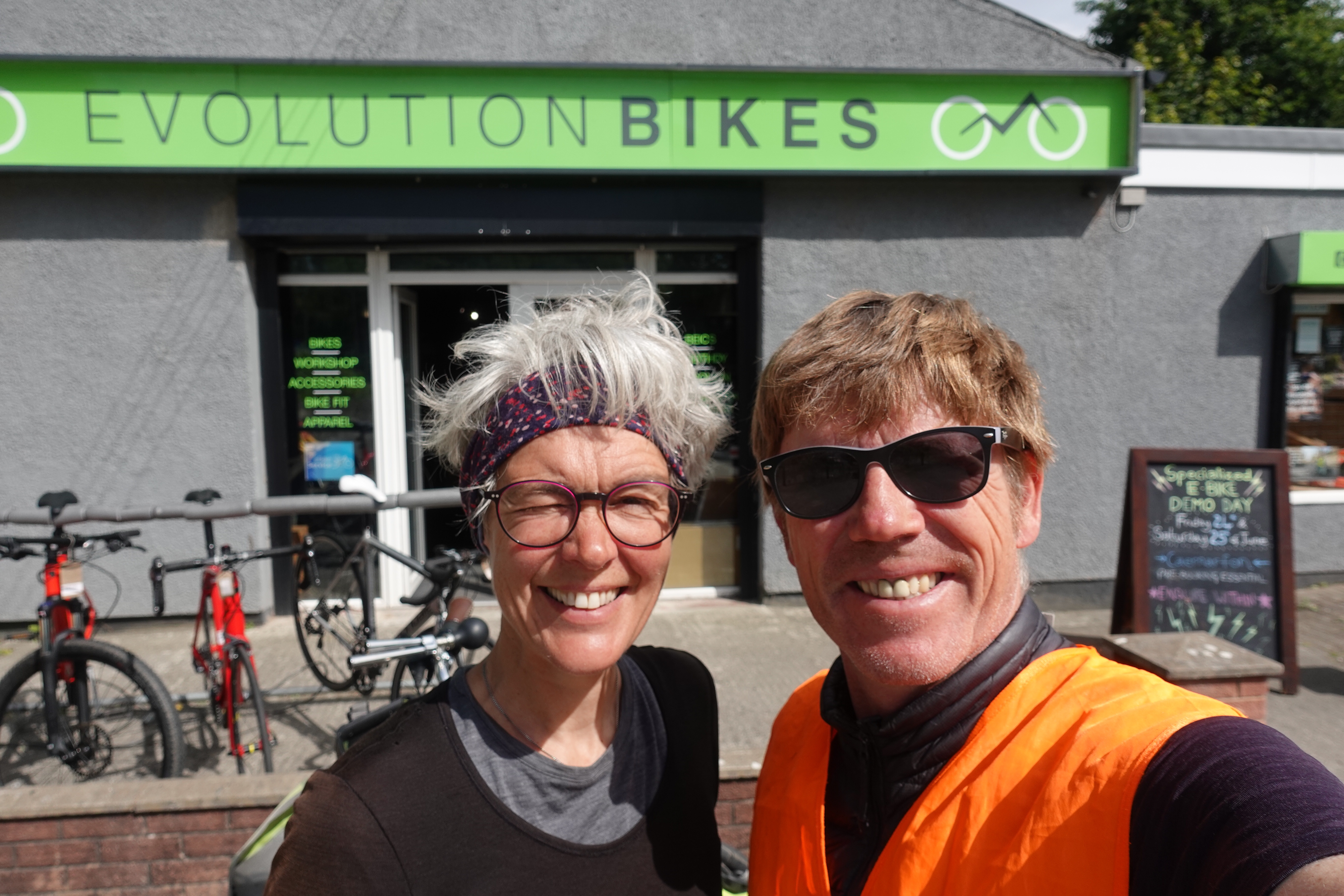 Wir haben schon so viele Kilometer auf unseren Rädern zurückgelegt, sie haben sich wacker geschlagen und uns nicht im Stich gelassen. Aber ab und an müssen doch ein paar Schrauben nachgezogen und Teile ausgetauscht werden. Da wir in dieser Hinsicht nicht so versiert sind, suchen wir einen Radladen auf, damit unsere treuen Drahtesel gut versorgt werden. Wir brauchen neue Ketten, Ritzel und Bens Rad braucht einen neuen Ständer. In einem kleinen Radladen weist man uns mit großem Bedauern ab, weil wir keinen Termin haben und der Mechaniker ohnehin schon Sonderschichten schiebt. Aber immerhin bekommen wir schon mal den Fahrradständer, den der Verkäufer freundlicherweise einbaut. Der Laden hat eine Zweigstelle, die auf unserer Route liegt und dort seien derzeit zwei Mechaniker im Einsatz…. wir sollen einfach mal nachfragen. Das machen wir: in der Zweigstelle kann Kathrins Rad geholfen werden: ja, sie haben die passende Kette, Ritzel und Zeit. Ob wir eine halbe Stunde warten könnten? Es gibt auch Kaffee. Natürlich können wir! Wir kommen ins Gespräch und am Ende gibt es noch ein Foto für die Insta-Seite des Ladens.