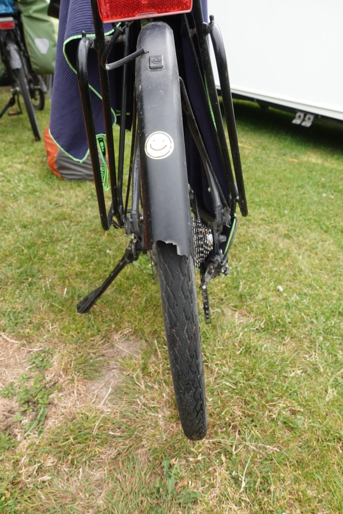 80 km später fährt Kathrin über einen Stock, der mit einem großem Ruck das Schutzblech kaputt reißt. Zum Glück nur das Schutzblech, darauf kann auch verzichtet werden. Speichen wären schlimmer gewesen. Wir können weiterfahren!