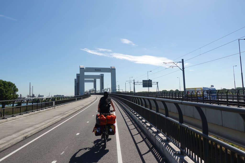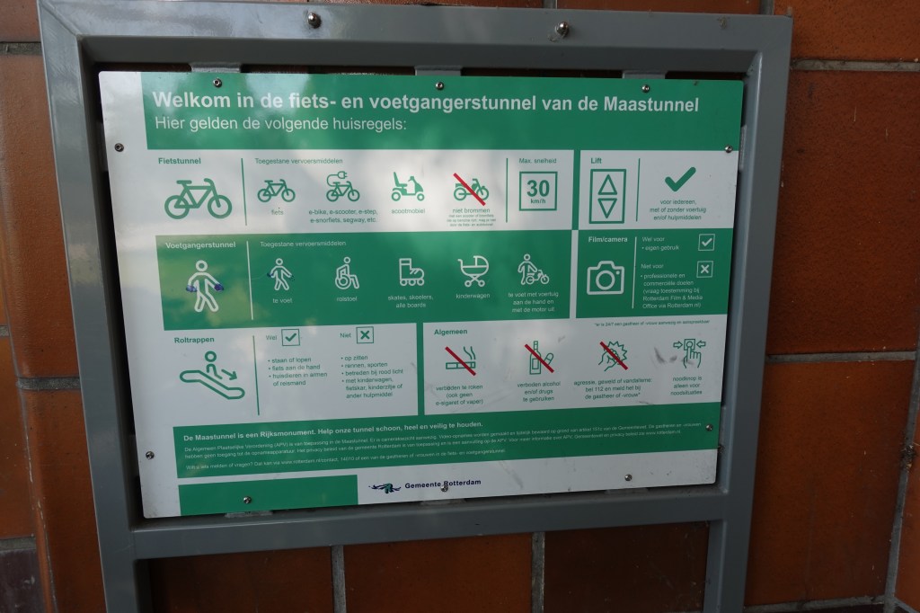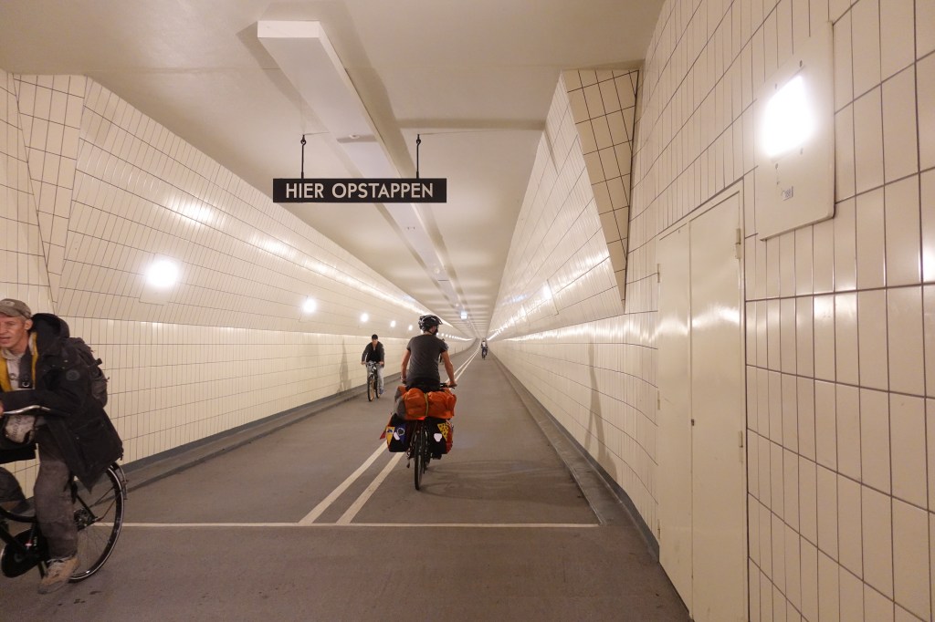 Wir landen in Rotterdam. Zumindest steht das auf dem Ticket, genau genommen landen wir aber 32 km vor Rotterdam in Europoort und fahren dann die Strecke an nicht endenden Hafenanlagen vorbei in die eigentliche Stadt. Dazu müssen wir laut Navi über die Maas, es ist aber weit und breit keine Brücke in Sicht. Und nun? Es gibt einen Tunnel, nur für Radfahrer und Fußgänger. Dazu kann man mit Fahrstuhl oder Rolltreppe hinunterfahren, unter der Maas hindurch radeln und auf der anderen Seite wieder hoch. Autos und Motorroller oder Mofas dürfen hier nicht fahren und so stinkt es auch nicht nach Abgasen.