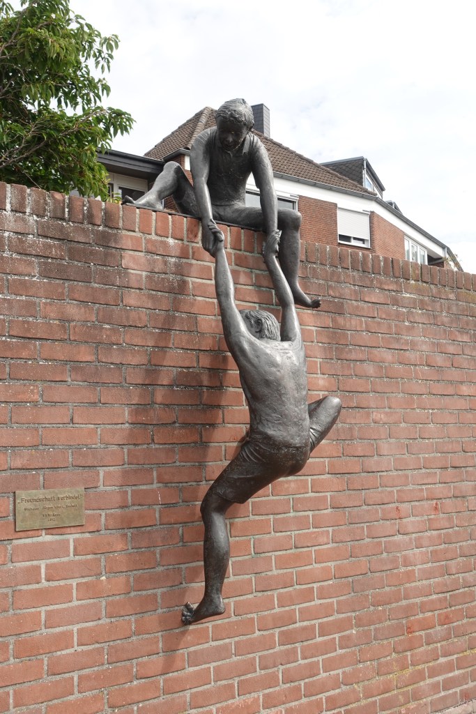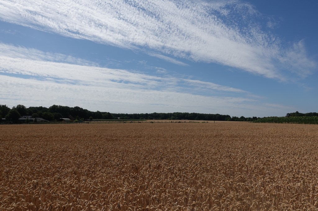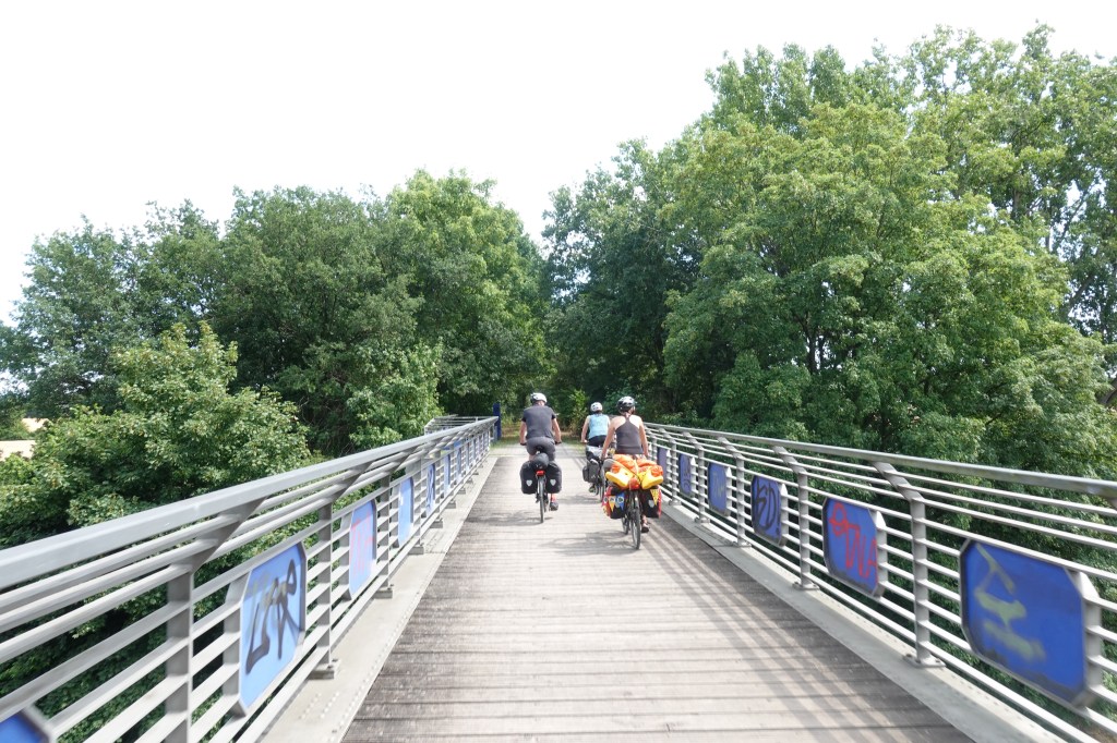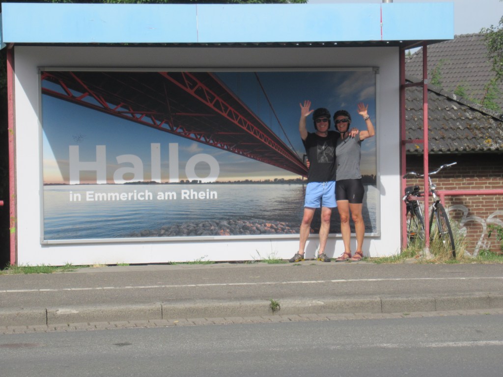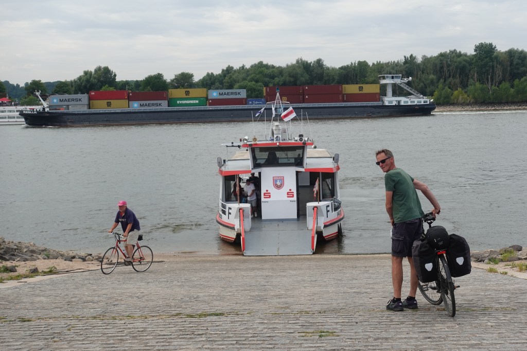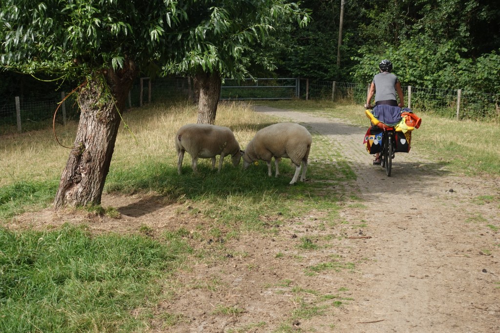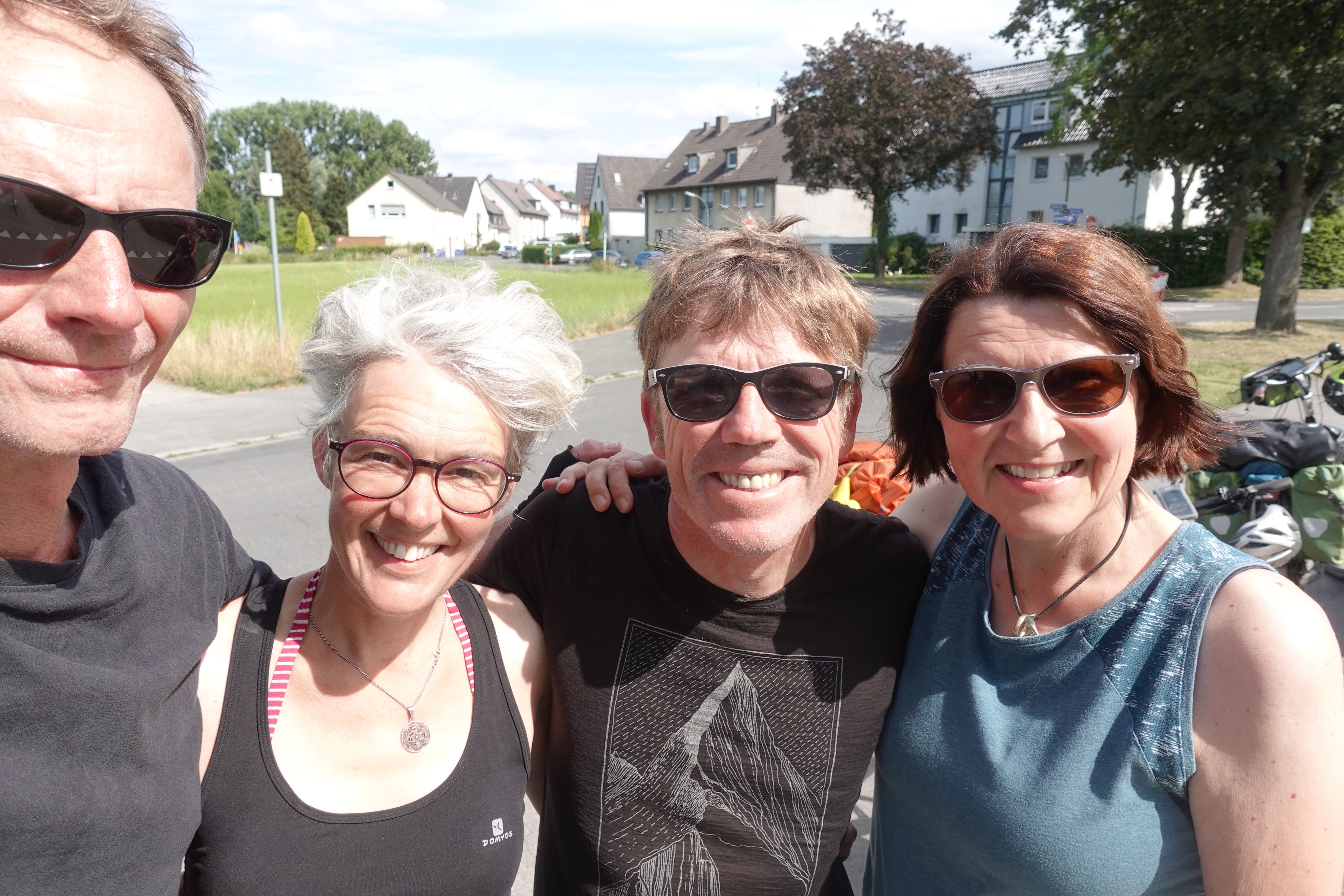 Nachdem uns Bine Schlaps in Holland verlassen hat, um wieder nach Bremen zu fahren, treten wir die letzen Etappen an. Es geht zurück nach Deutschland, entlang des Rheins und der Lippe, vorbei an inzwischen reifen Kornfeldern und durch kleine Wälder. Alles fühlt sich merkwürdig vertraut an. Hier können wir alles (!) verstehen, wir kennen die Attitüden und die Atmosphäre. Ganz ohne Überraschungen geht es aber nicht: Wir wollen mit der Fähre über den Rhein setzen und stellen fest, dass das 2,50€ pro Person kostet. Dumm nur, dass wir unser gesamtes Geld gestern auf dem Campingplatz gelassen haben, um die Übernachtung zu bezahlen. Kris schildert unsere Not dem freundlichen Büdchenbesitzer und prompt bekommen wir die Überfahrt spendiert. Für alle Vier! Hurra und Dankbarkeit, Glück und Überraschung: es geht weiter!