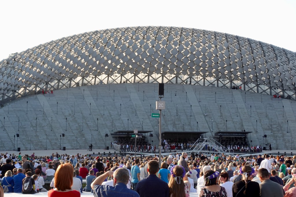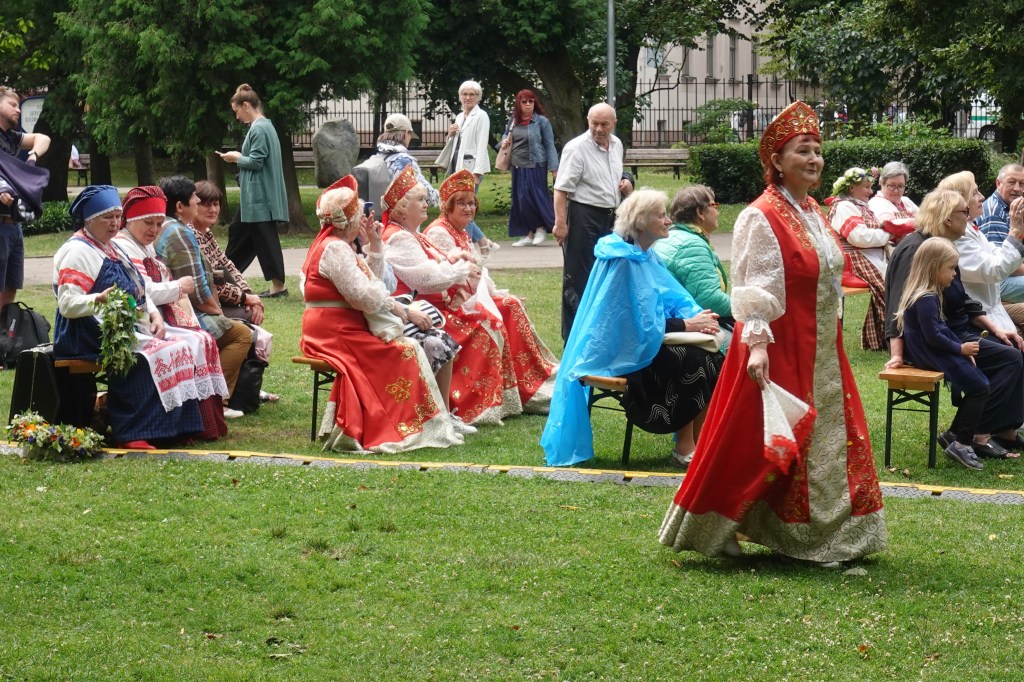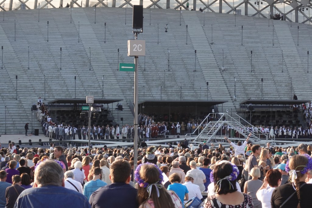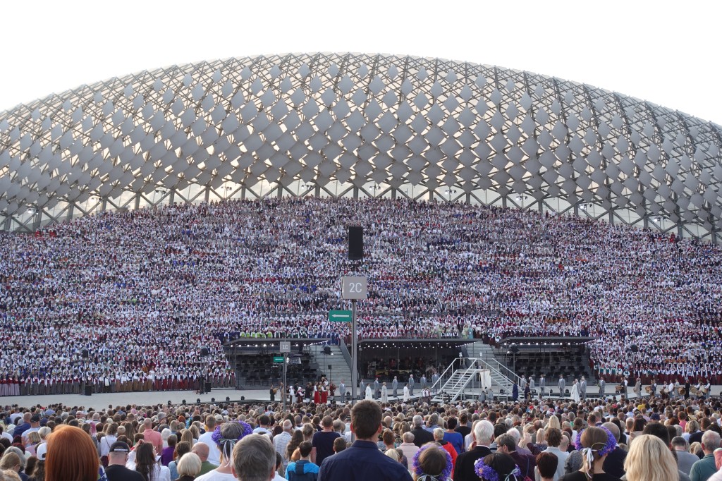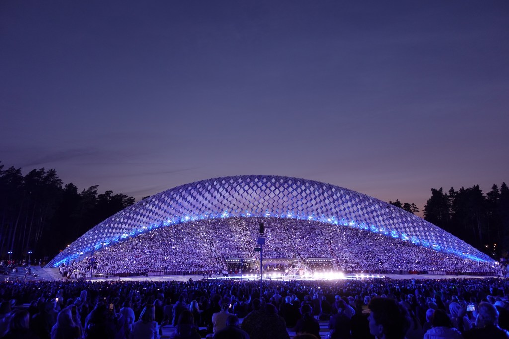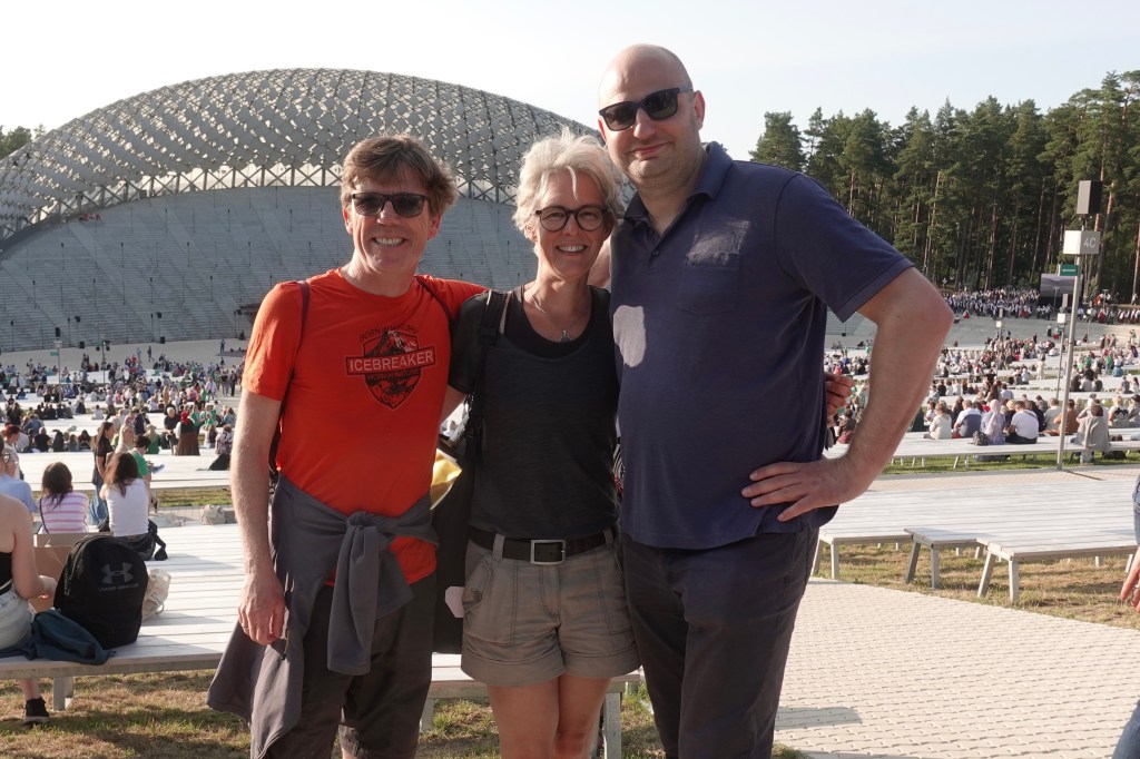 Schon auf der Hinfahrt zum Konzert,in der vollgestopften Bahn, wird gesungen. Viele Menschen tragen die farbenfrohen Trachten und haben dicke Blütenkränze auf dem Kopf. Dann beginnt das Konzert in dem eigens dafür gebauten Platz für 17.000 Sänger:innen. Bei jedem Lied wird der Dirigent:in gewechselt und jeweils mit großem Applaus (von den 17.000 Sänger:innen und dem Publikum) verabschiedet und willkommen geheißen. Die Dirigent:innen stehen auf einem Gerüst gut 8m hoch, damit sie gut gesehen werden. Wir fragen uns, wie das geht, dass eine Person so viele Menschen dirigiert, aber es klappt tadellos! Es werden alte und neue Lieder gesungen, Andris, der uns zu dem Konzert begleitet, kennt fast alle Texte. Die Stimmung ist festlich und zufrieden, es wird nicht herumgerannt, laut geredet, gegessen oder getrunken und das, obwohl die Atmosphäre an Picknick erinnert. Wir sind hin und weg. So eine besondere Stimmung mit so vielen Menschen haben wir noch nicht erlebt.